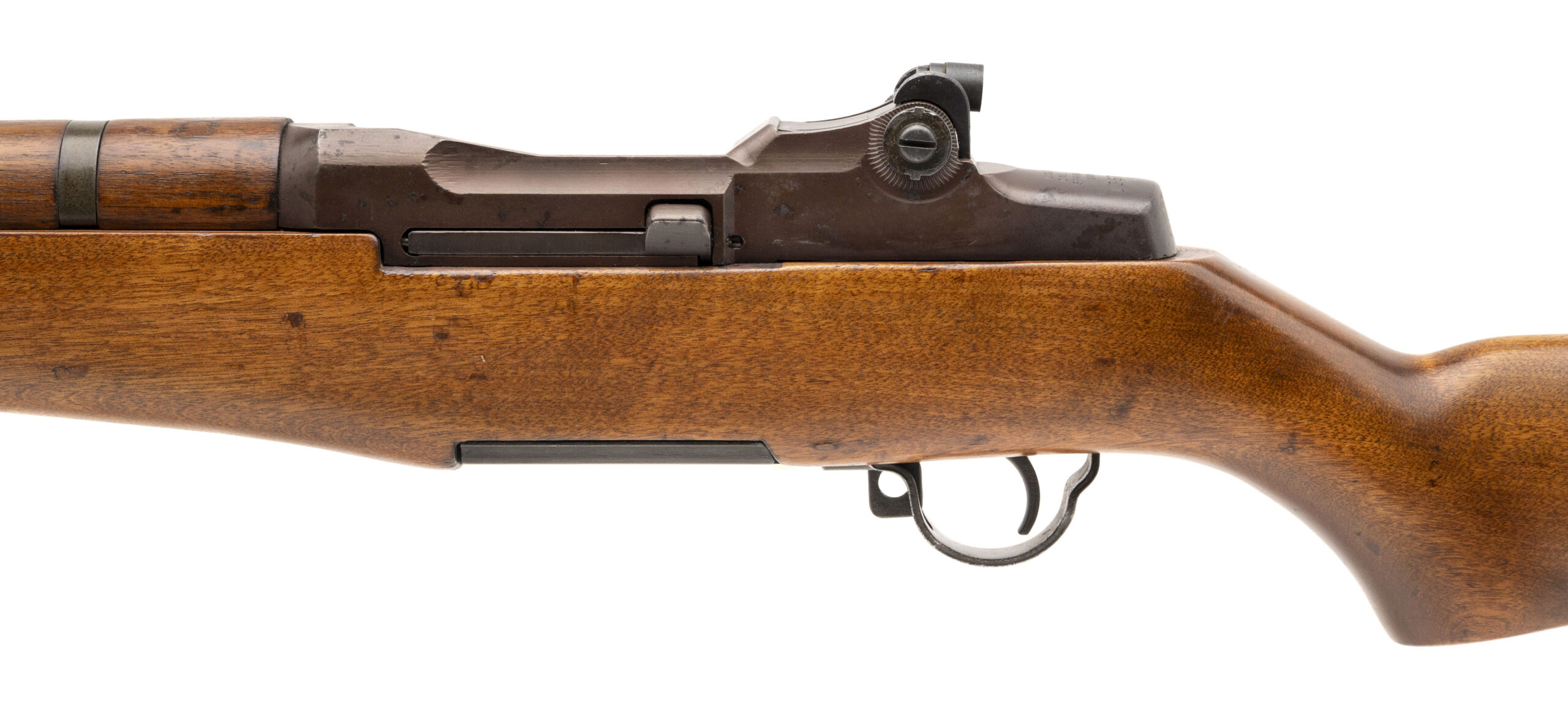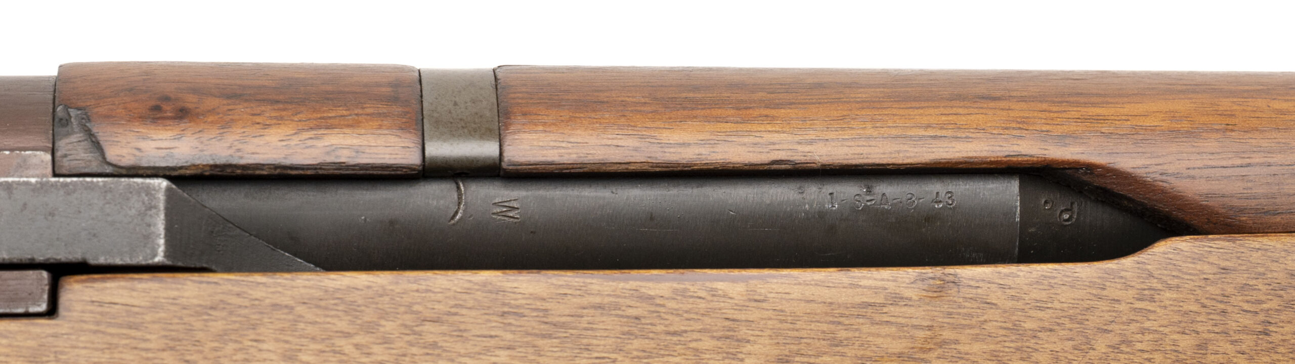 Serial Number 1367063. This rifle's receiver was made in February 1943 with an August 1943 dated Springfield barrel with a bright bore & strong visible rifling. Comes with a radius cut Winchester op rod, a National Hardware Company poppet valve gas cylinder lock screw & a hooded National Match rear sight aperture. The furniture is in very good overall condition but there is a crack in rear handguard. The receiver & bolt have been refinished, but the other metallic parts still have their original factory phosphate finish.