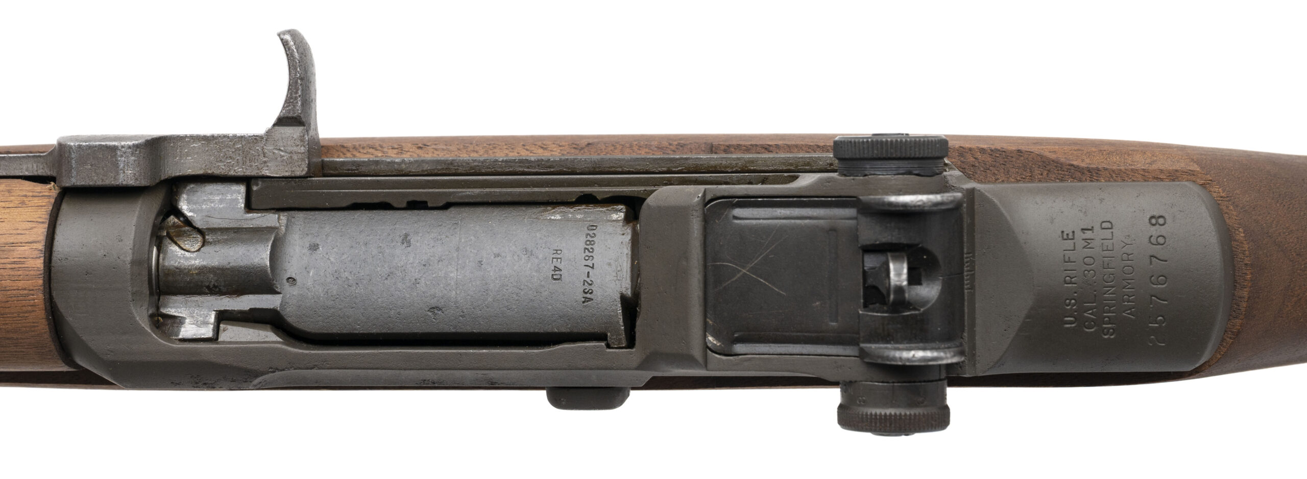 Serial number 2576768. This rifle's receiver was made in January 1944 but it is paired with a October 2020 dated 24-inch commercial barrel that has a bright bore with strong visible rifling. It is a CMP Expert Grade Garand, so it has been refinished with a dull gray phosphate & the wood is new production. Equipped with an Springfield radius cut operating rod, a Springfield milled trigger guard & the T105E1 adjustable rear sight assembly. Comes with a USGI M1943 webbed sling & CMP hardshell gun case.