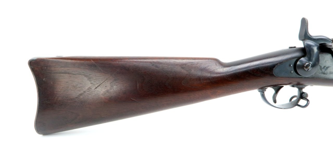 Springfield Model 1884 Trapdoor rifle made in 1889. Gun has excellent blue on the barrel. 90% of the original blue. Lock has very good case colors. Wood is excellent with an 1888 cartouche. This gun was made right at the end of 1888 to 1889. Very fine gun!