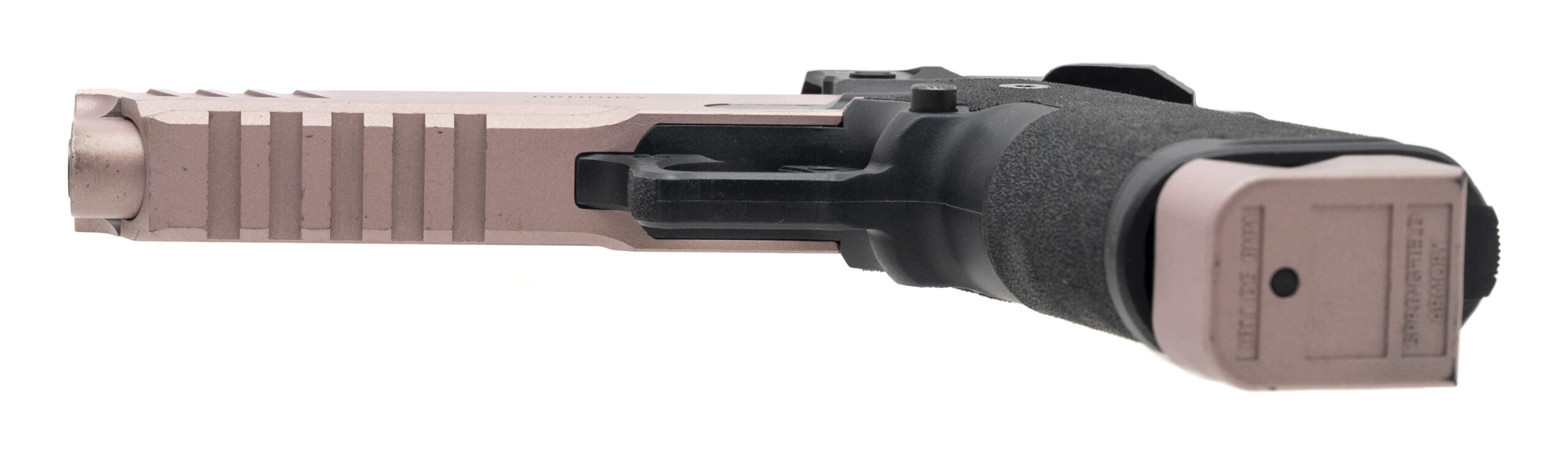SN: NMH49543. Modern production, 9mm with a 5" bull barrel. Custom cerakoted full size double stack 1911 style pistol with a Hex Dragonfly red dot optic. Metal shows wear but the overall condition is very good. Comes with a carry bag and an extra magazine.