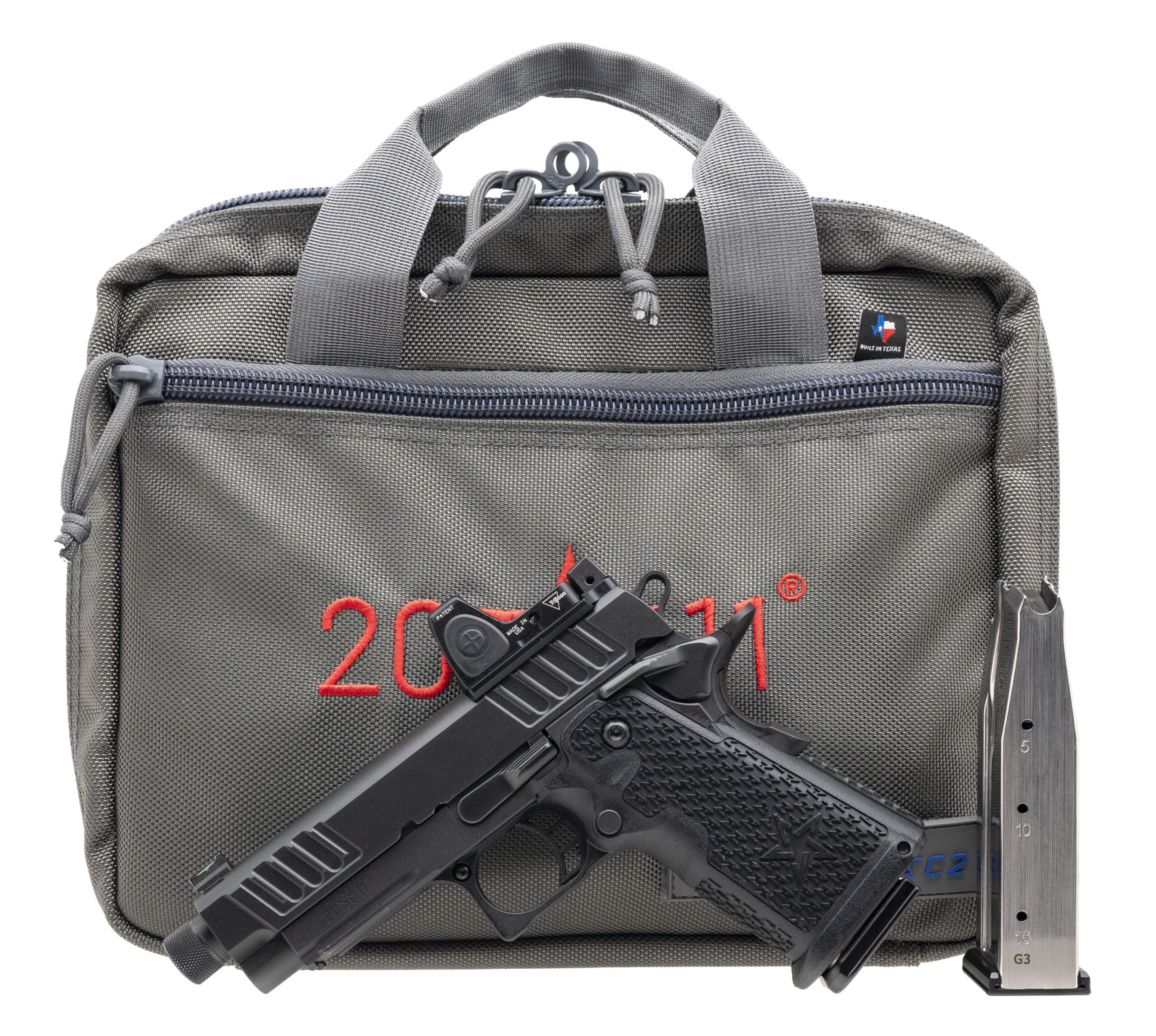 SN: C22123750. Modern production 9mm with a 3.9” Threaded DLC Bull Barrel. Bore is bright with excellent rifling. Semi auto, Compact aluminum frame pistol with recoil master system and Trijicon RMR Optic. Finish is in excellent condition. Grip is in excellent condition. Comes with Staccato range bag and extra magazine.