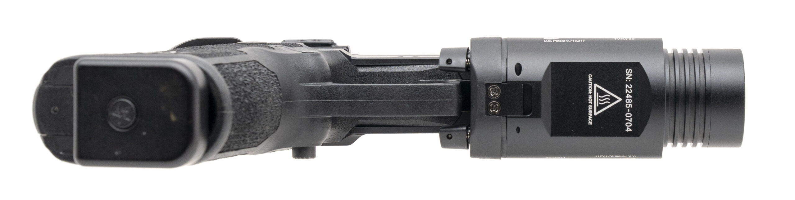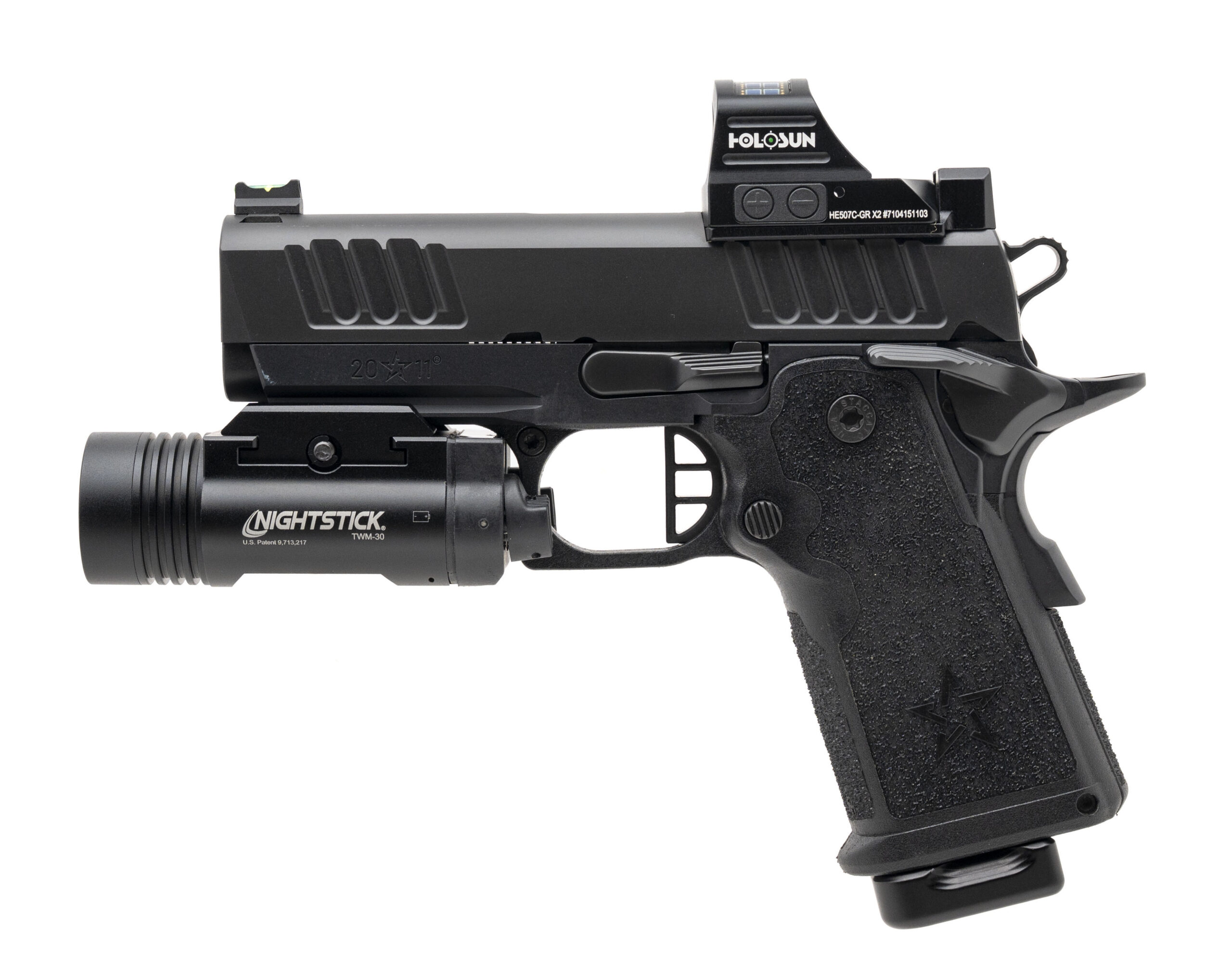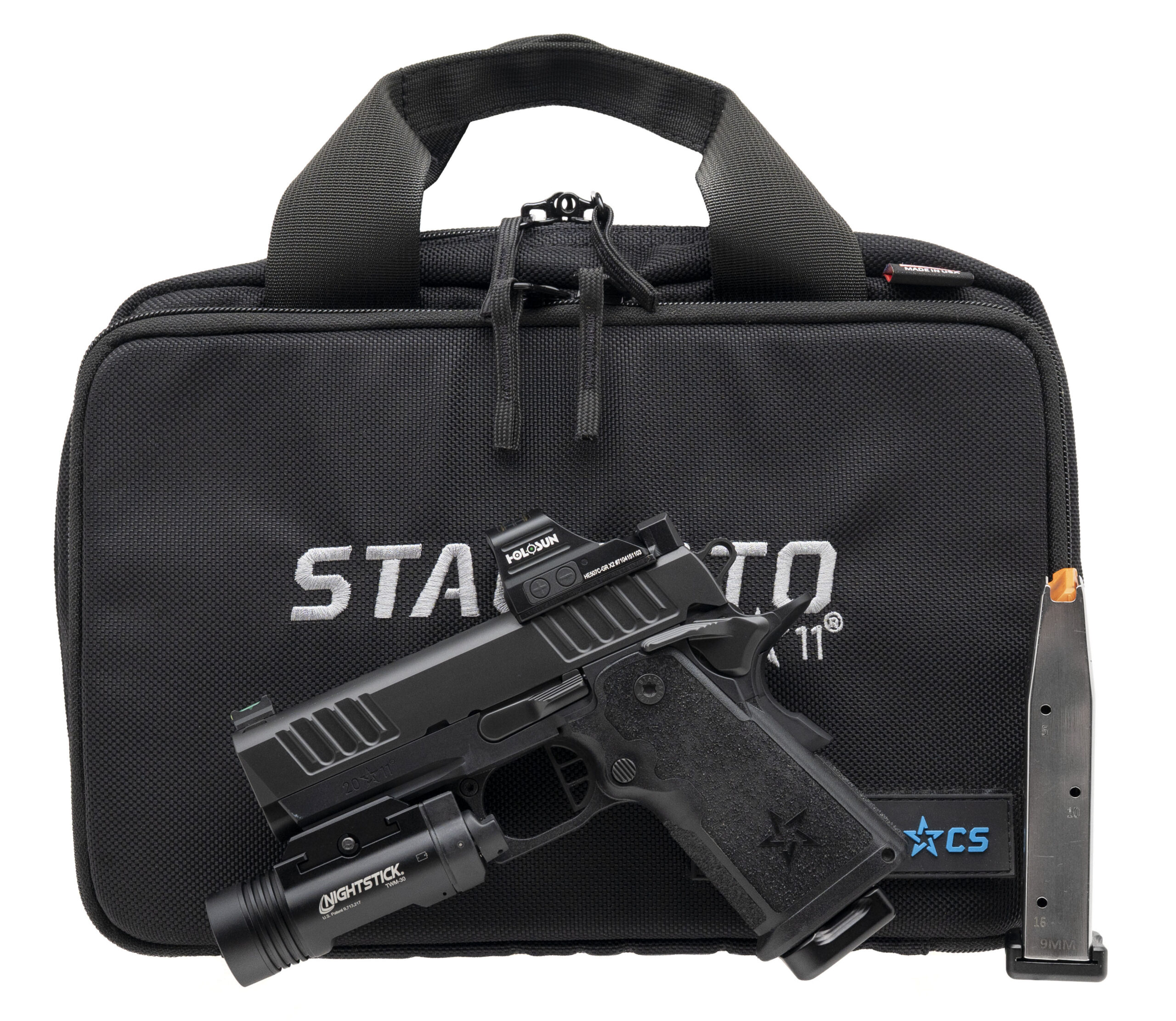 SN: CS241963. Modern production, 9mm with a 3.5" stainless bull barrel. Compact 2011 carry pistol with a Holosun 507C green dot optic and a Nightstick TWM-30 flashlight. Metal shows minor handling wear on the right of the slide. Overall condition is very good. Comes with Staccato carry bag and an extra magazine.