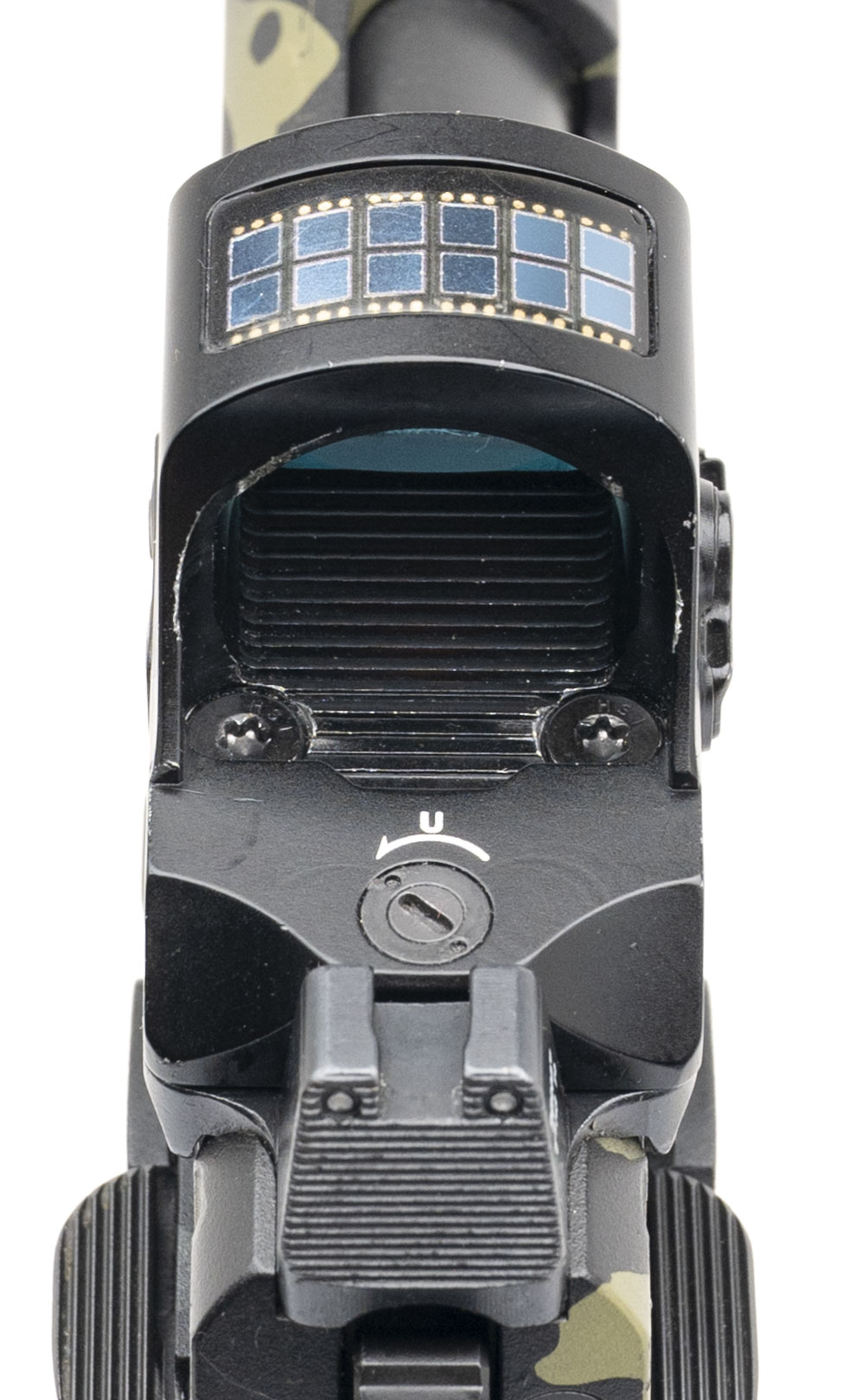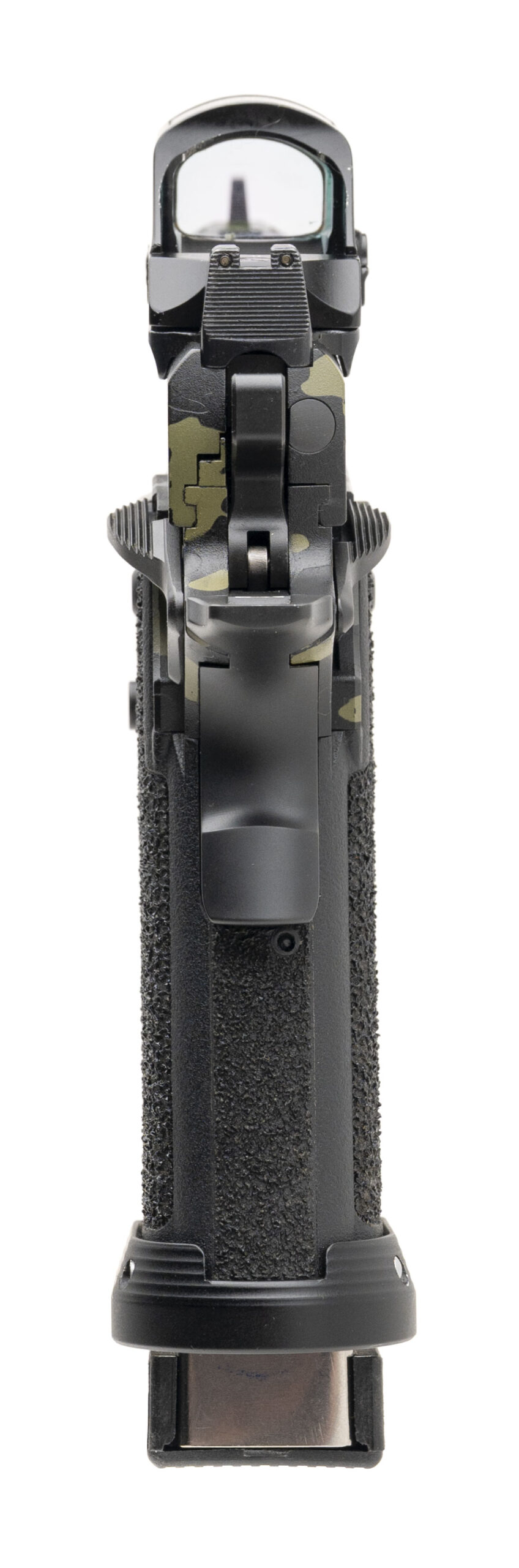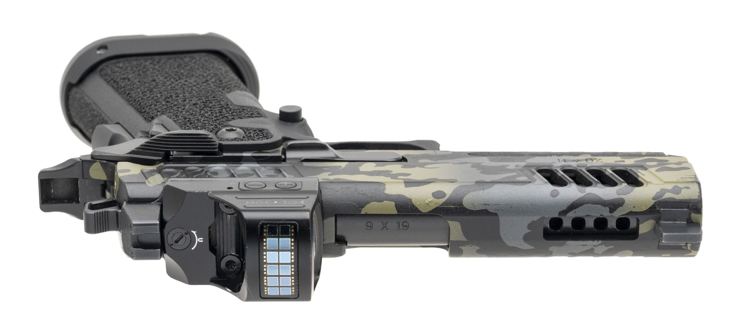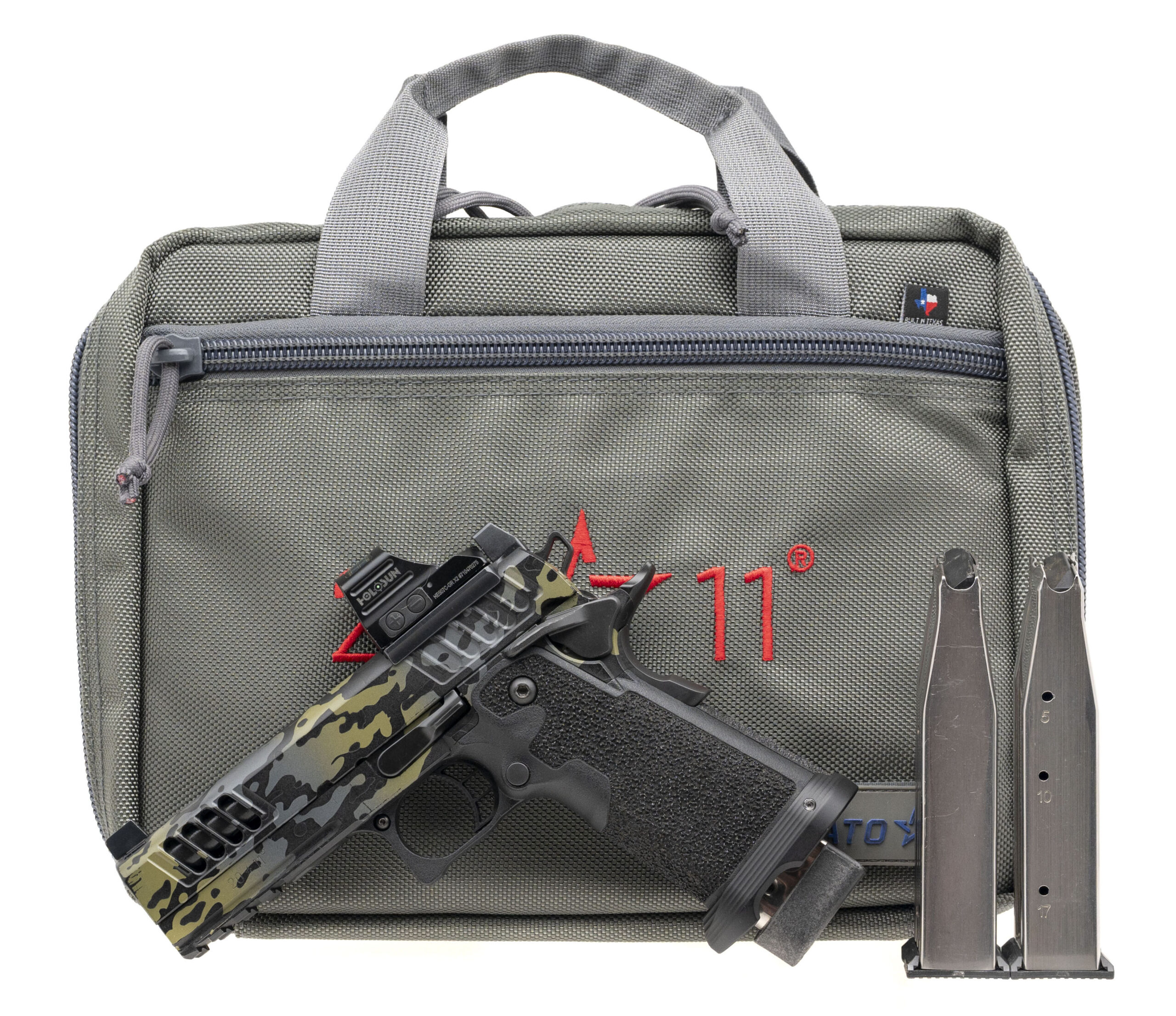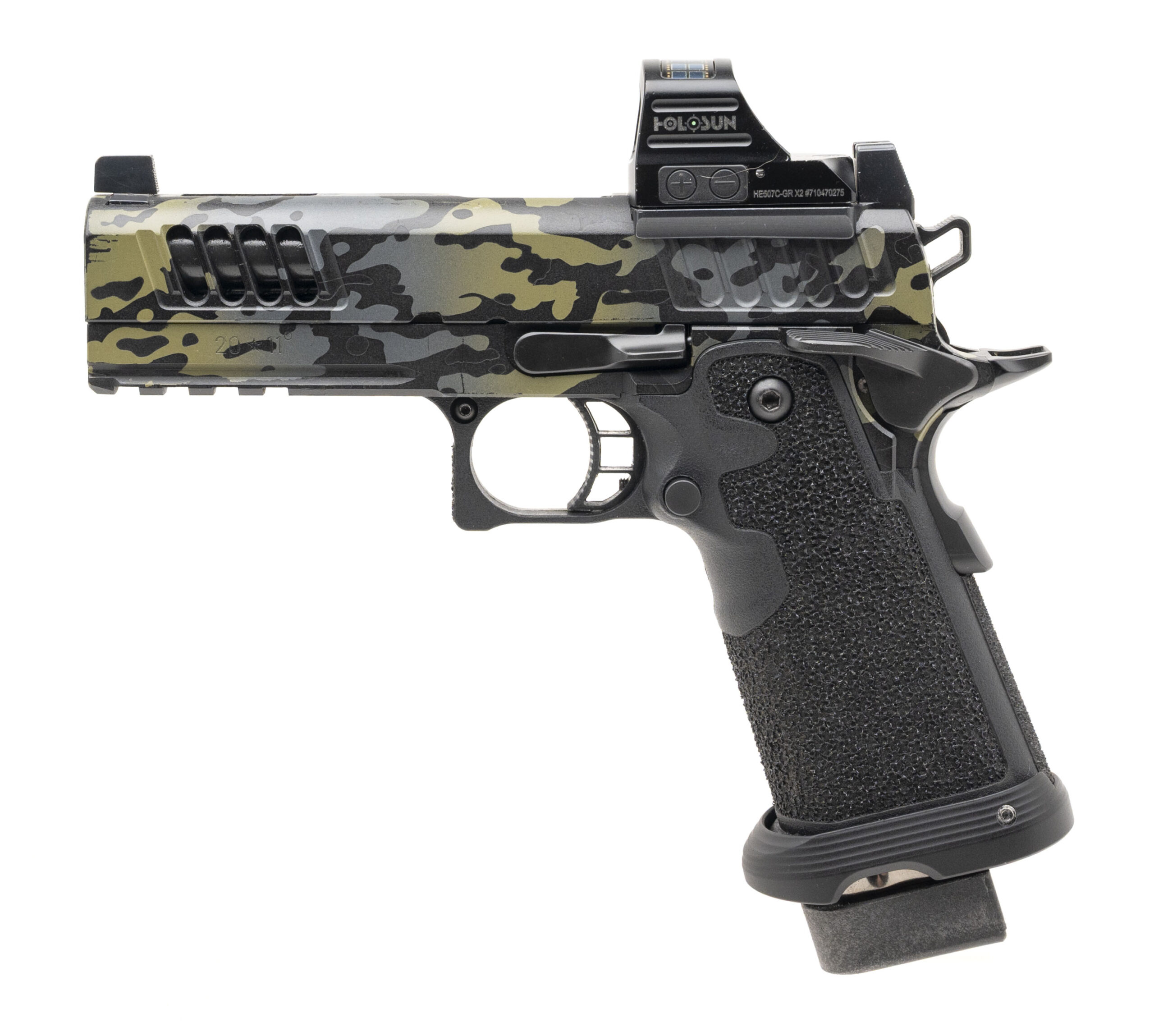 SN: TX13152. Modern production, 9mm with a 4.2" DLC coated custom ported bull barrel. Vulcan Machine Werks custom duty size 2011 pistol with a holosun 507C X2 green dot optic w/co-witnessed Trijicon suppressor height night sights, lightning cut slide, flared magwell, and a custom camo cerakote finish & stippling. Finish shows light holstering wear but the overall condition is very good. Comes with Staccato carry bag and 2 extra magazines.