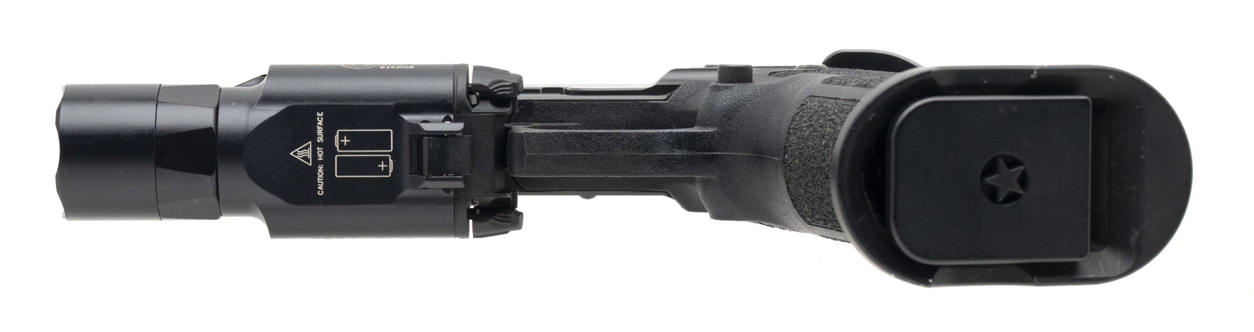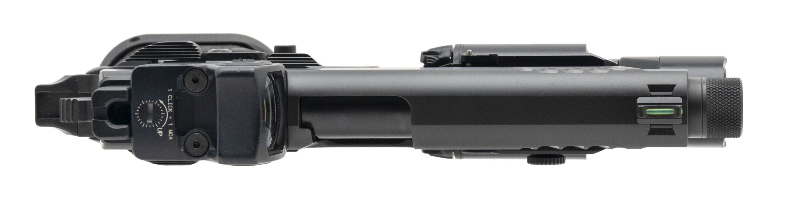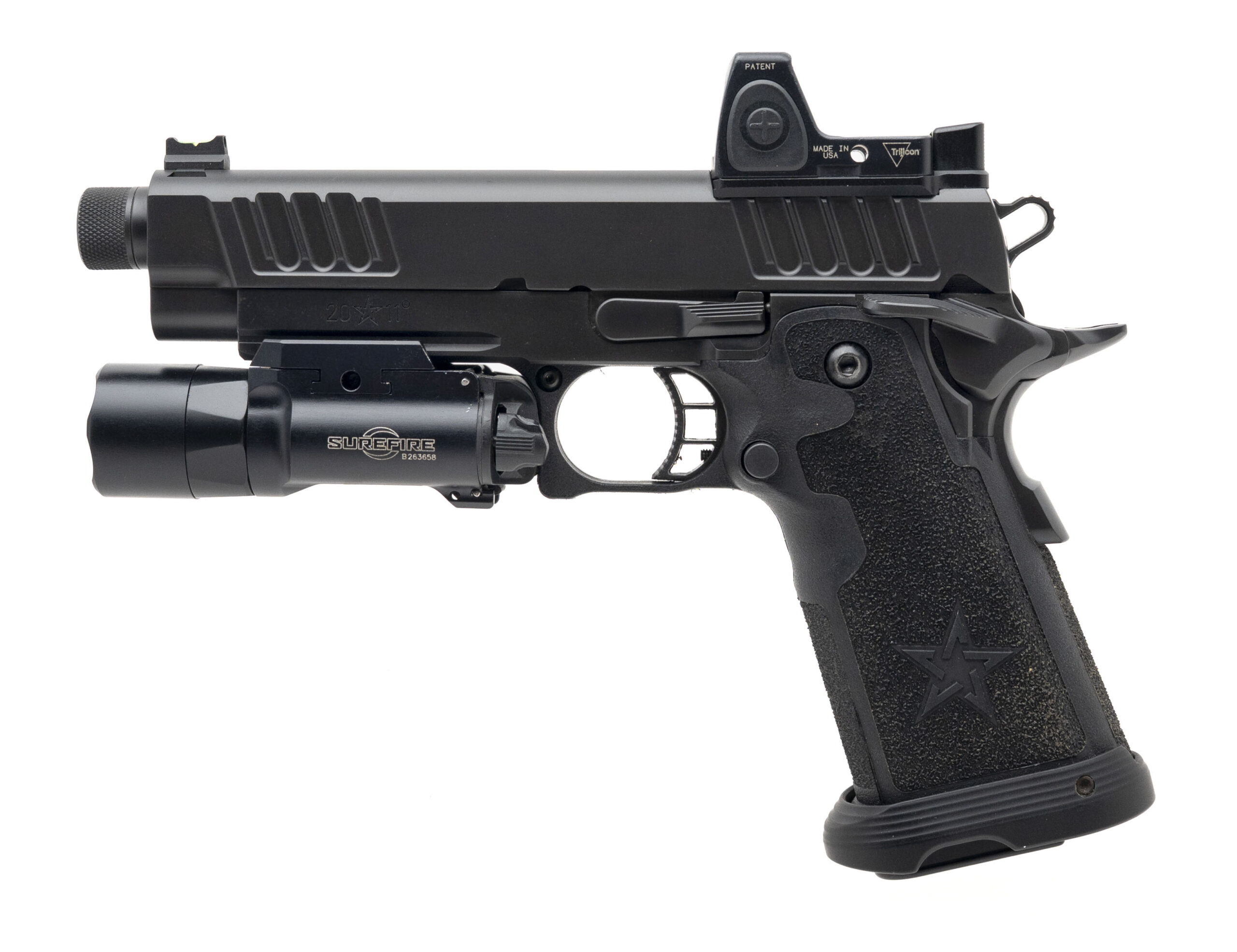 SN: P2141562. Modern production, 9mm with a 4.4" threaded DLC barrel. Duty size 2011 with a Trijicon RMR red dot optic, SureFire X300 Turbo flashlight, and flared magwell. Overall condition is near excellent.