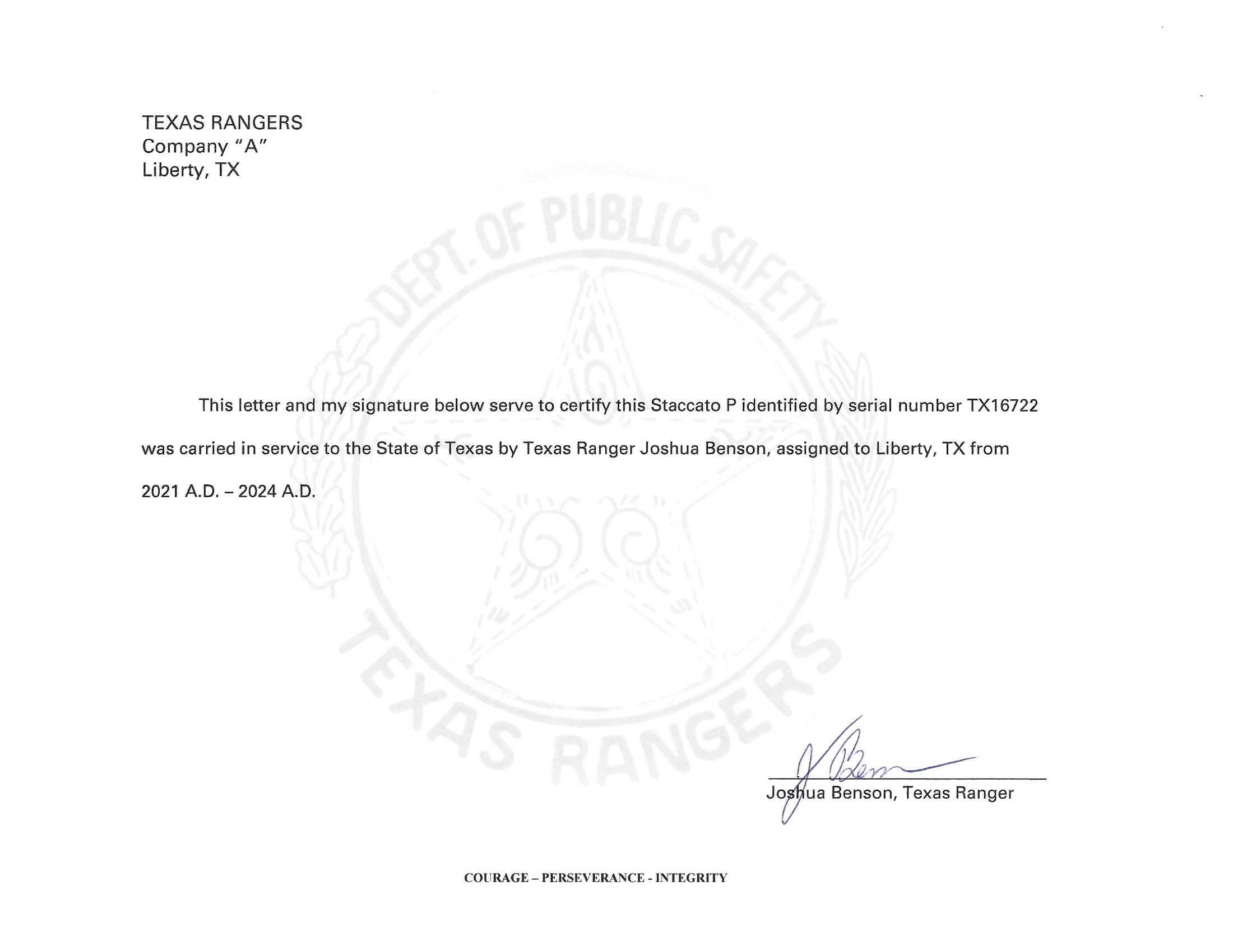 SN: TX16722. Modern production, 9mm with a 4.25" DLC bull barrel. Bore is excellent. Desirable Texas Ranger carried Staccato P. Finish is in very good condition with holster wear and wear on the rear sight. Overall condition is very good. Comes with Staccato range bag, Dawson Precision universal optics kit, and three extra magazines. Comes with a letter of certification from the Ranger who owned it. A great set!