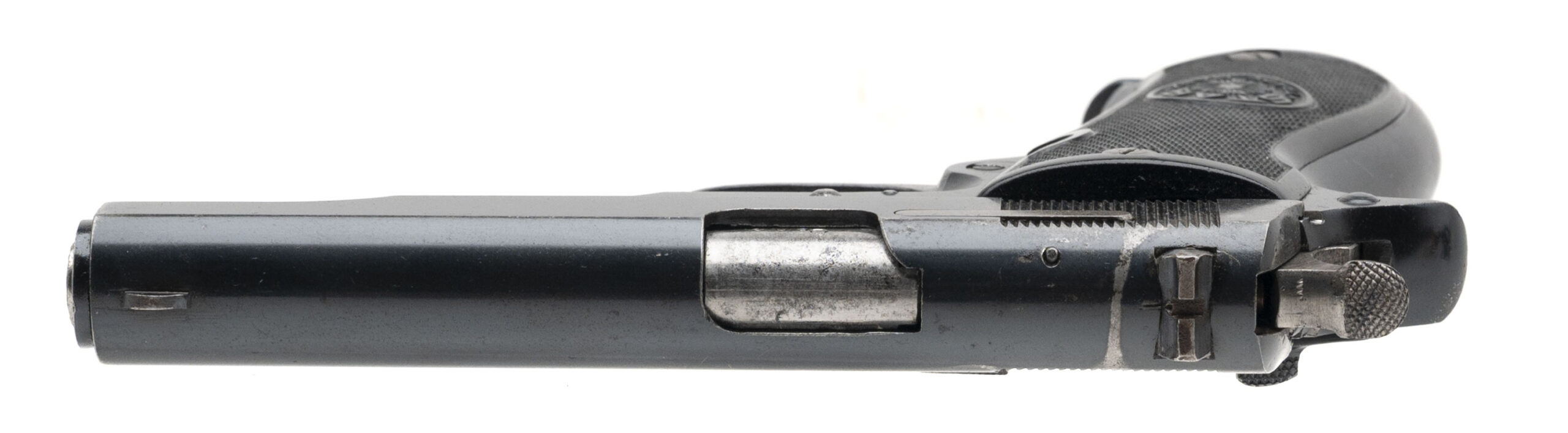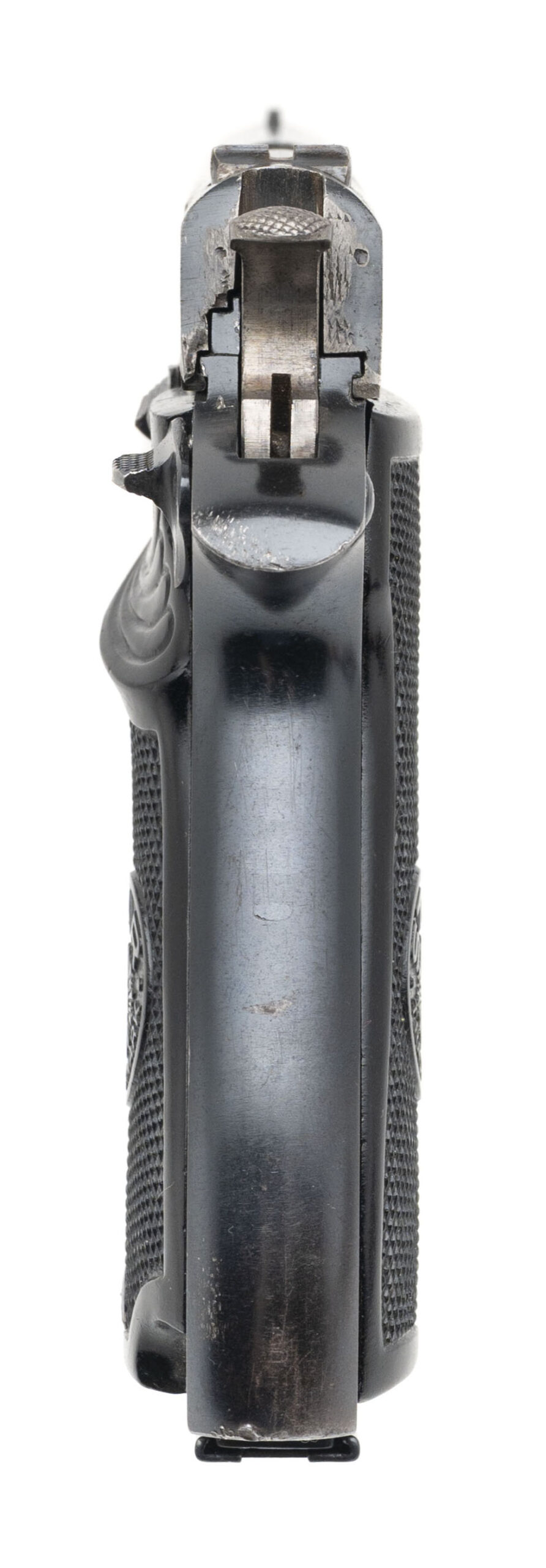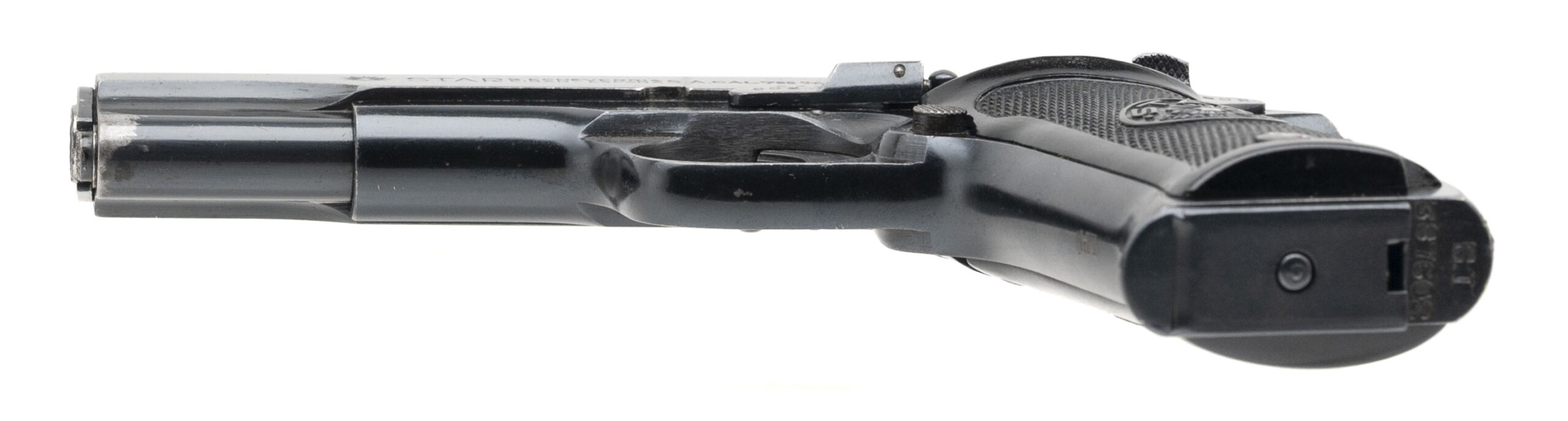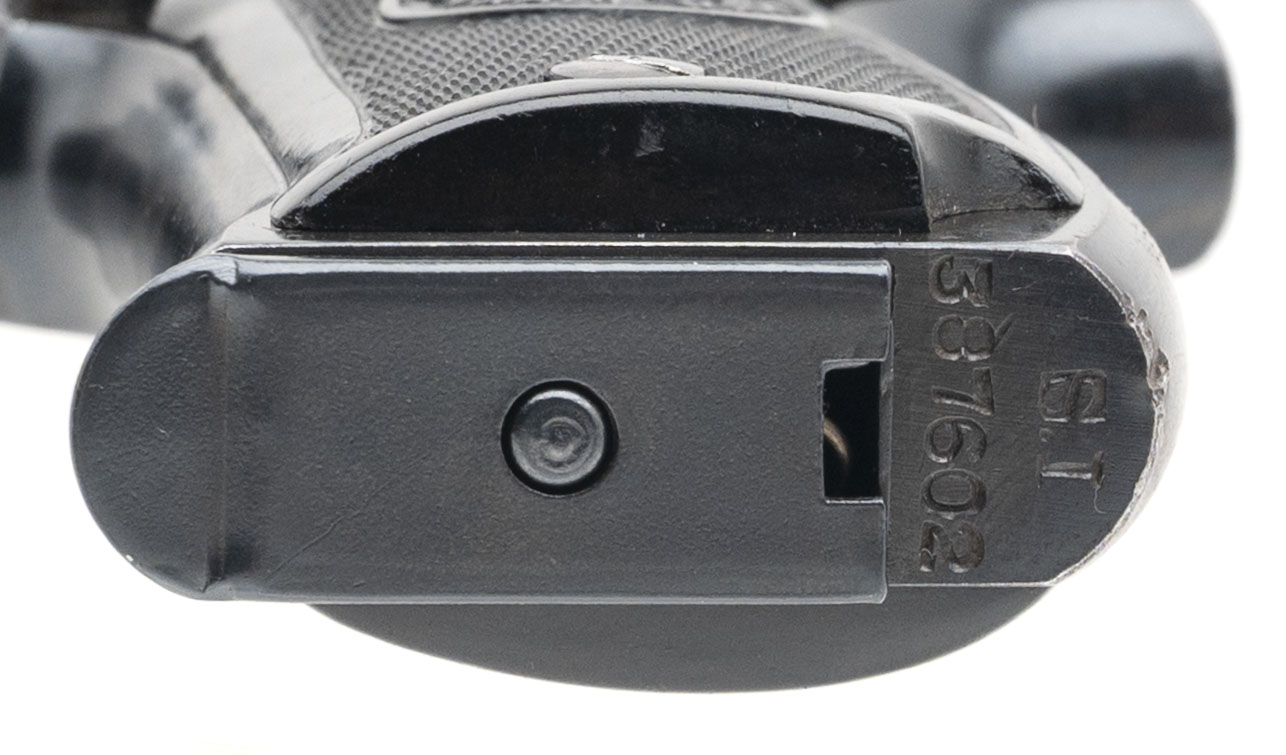 Serial number 387602. Made in 1952 with a 4-inch barrel that has a good bore with visible rifling. This steel frame/steel slide 1911 type pistol is in overall fair condition with original factory blued finish across the metallic parts that is thinning along the hard edges & worn off in three areas on the slide. The frame has some disassembly scratches under the bolt stop & the slide has areas of oxidation in the slide serrations. There is a "Made in Spain" mark on the right side of the frame & an "LPN" marking on the front strap, indicating it was issued to the West German Landespolizei (State Police). All numbers match but the magazine is an aftermarket replacement that does not actuate the bolt stop.