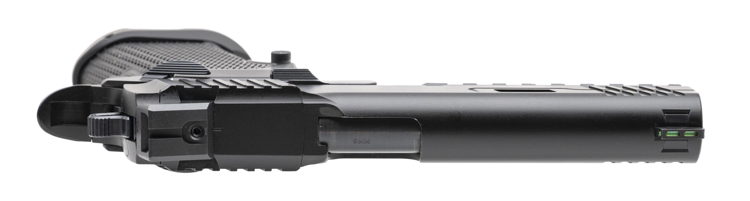 SN: 2310042412. Modern production, 9mm with a 5" bull barrel. Bore is excellent. Full size alloy frame 2011 style pistol with an optics ready/lightening cut slide, fiber-optic front sight, ambidextrous manual thumb-safety, accessory rail, flared magwell, matte black finish, and aluminum polymer grips. Accepts Glock magazines. Finish & grips show minor marks throughout. Overall condition is very good. Includes an additional magazine, and original range bag.