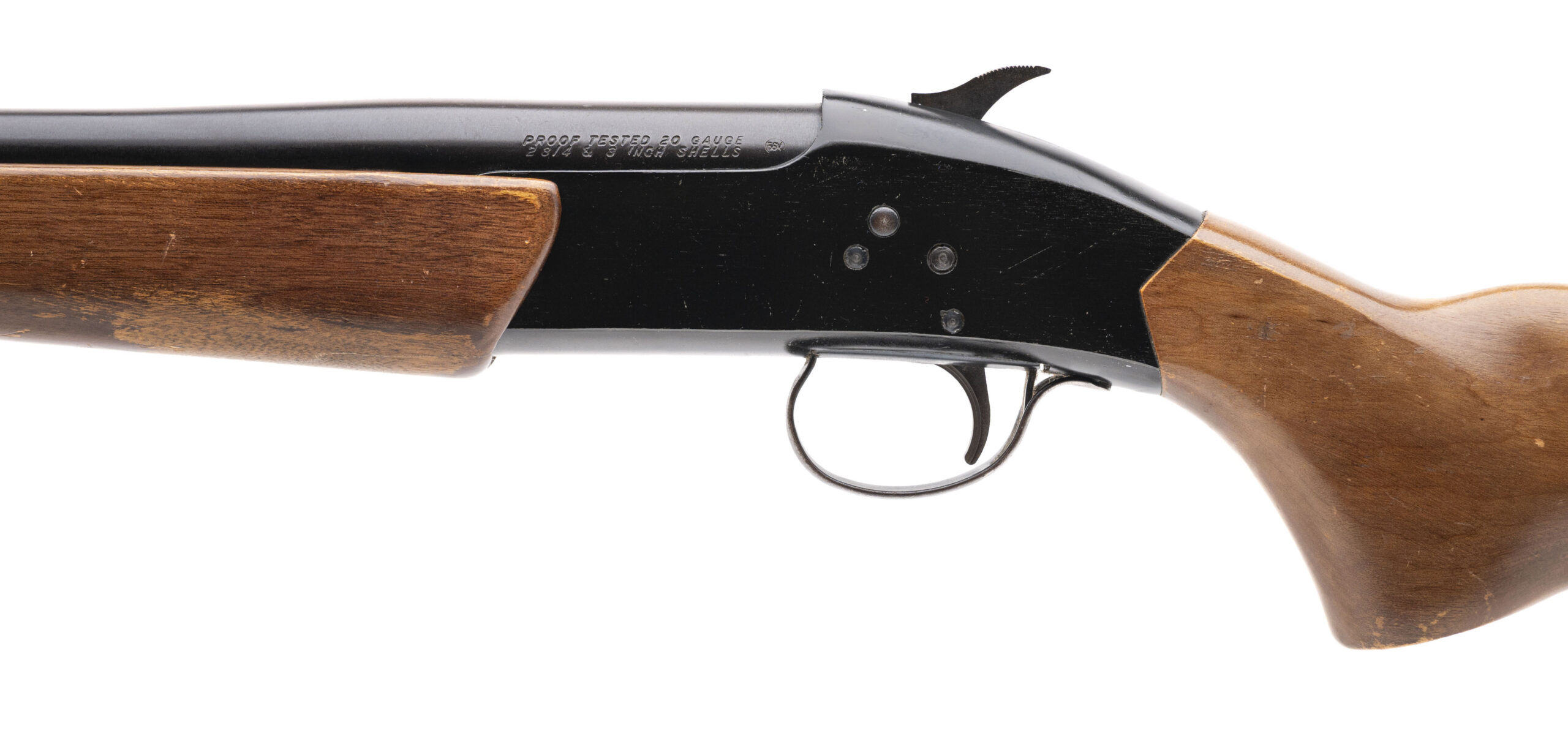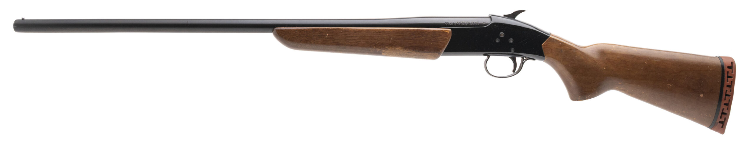 NSN, 20 gauge single shot break open shotgun with a 26" round barrel, 3" chamber, side lever opener with wood furniture and a 12" LOP to the red recoil pad. Moderate wear and handling on the furniture, some wear to the metal, bore is excellent.