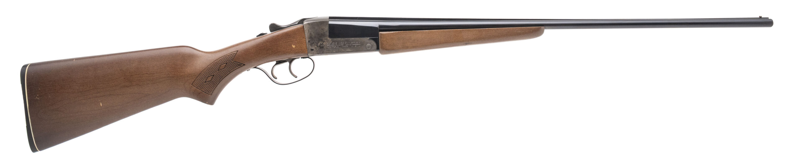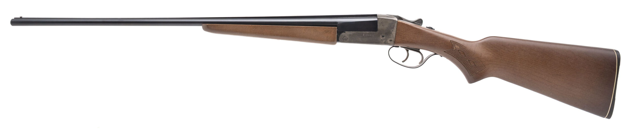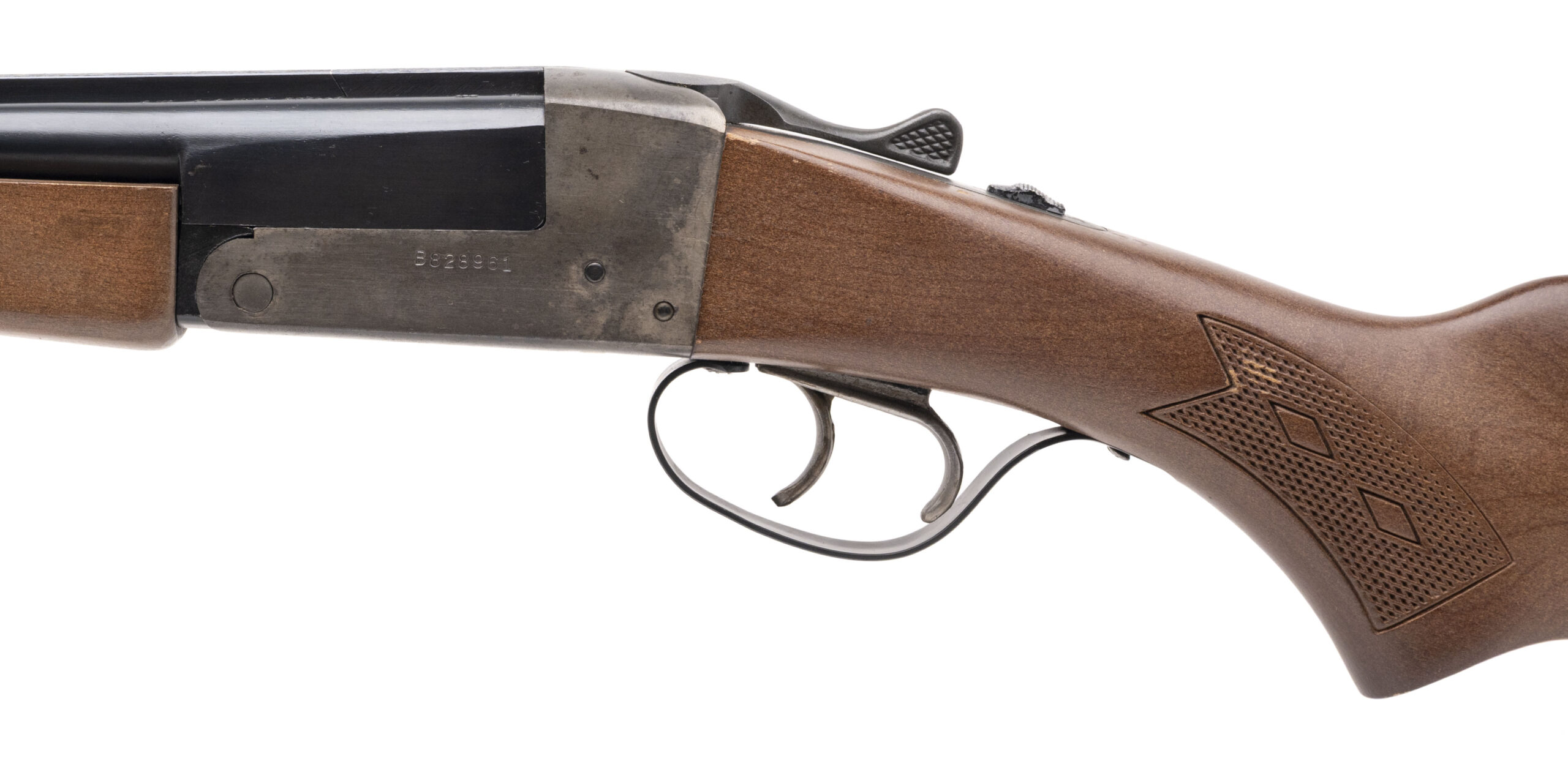SN: B828961. Made in 1975, .410 gauge with 26" barrels. Bores are excellent. Side by side field shotgun with 14.5" LOP and chambered for 2 1/2" & 3" shells. Blue finish to barrels, case hardened frame and checkered wood stock. Finish and stock show wear. Overall condition is good.