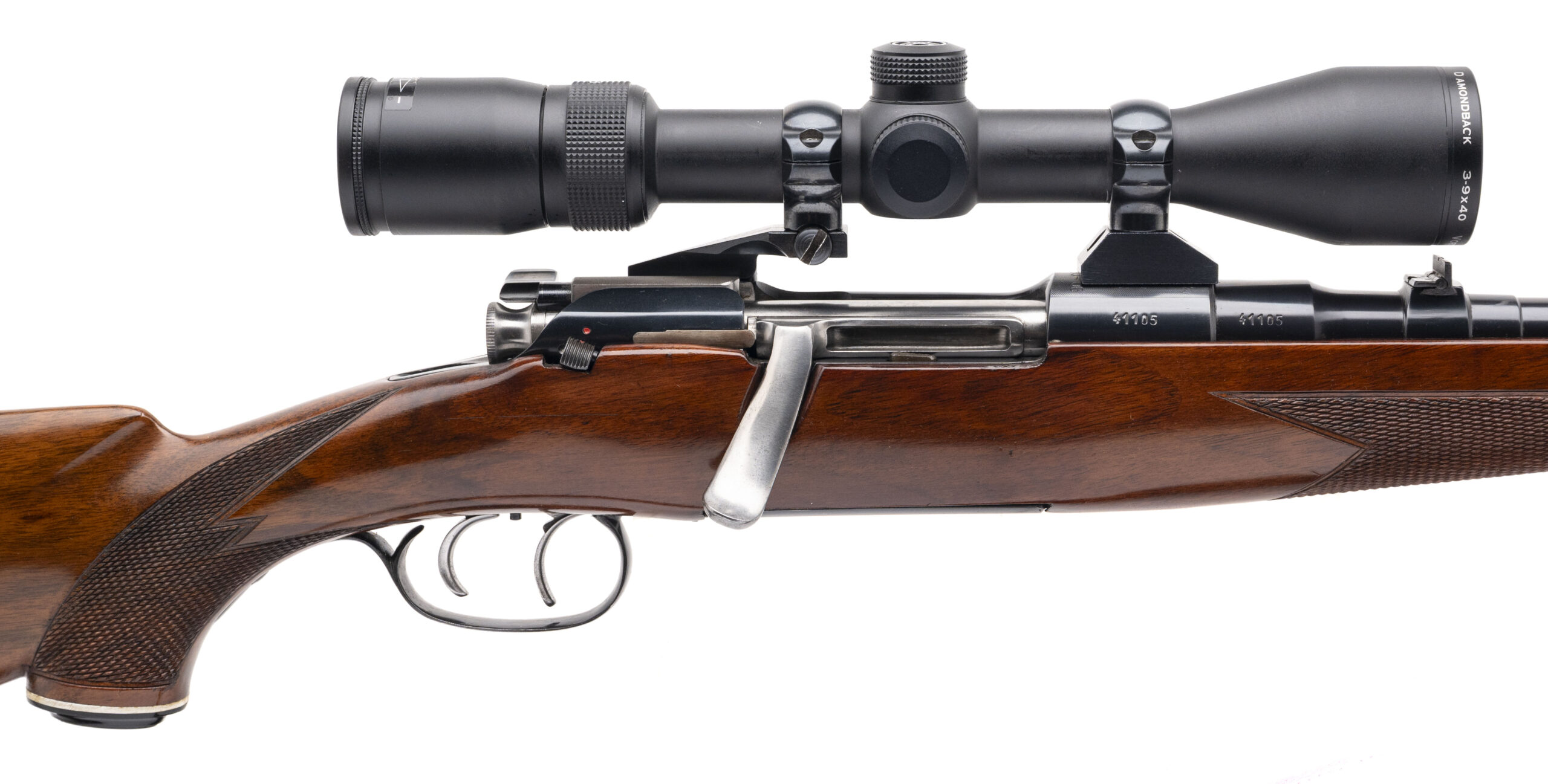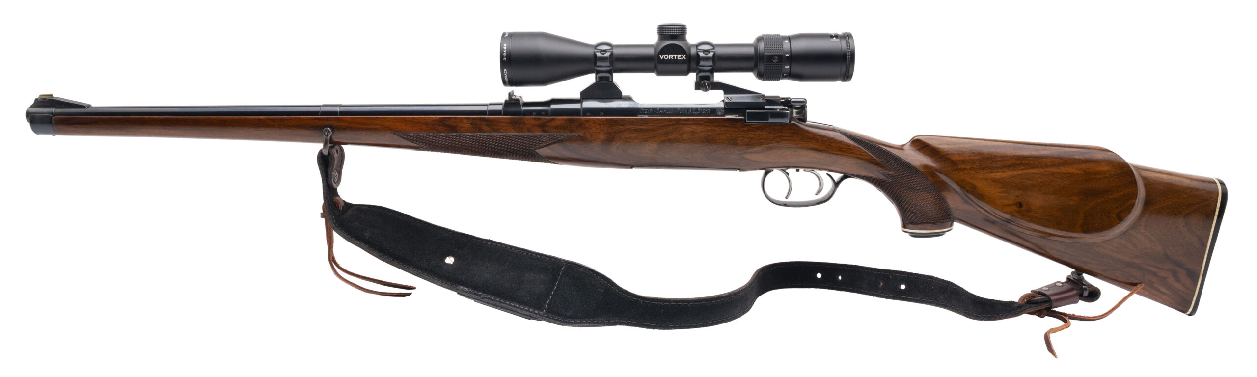 SN: 41105 made in Austria in 1963. Bolt action 30-06 with a 20” round barrel, express sights, swing mount holding a Vortex Diamondback 3-9, a spoon bolt and double set triggers in a full length Mannlicher stock with original grip cap and butt plate. Overall in very good condition with an excellent bore. Comes with leather sling.