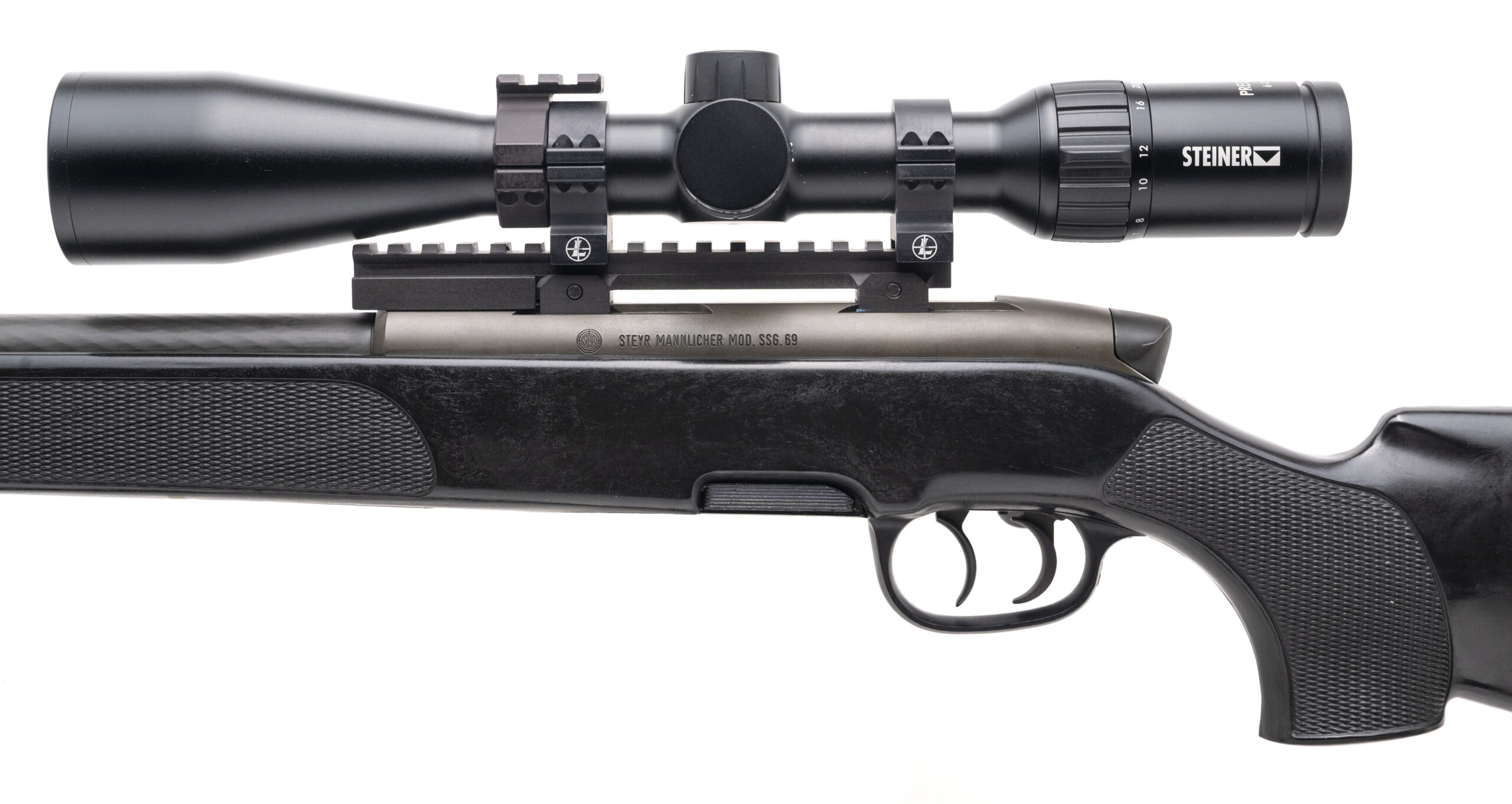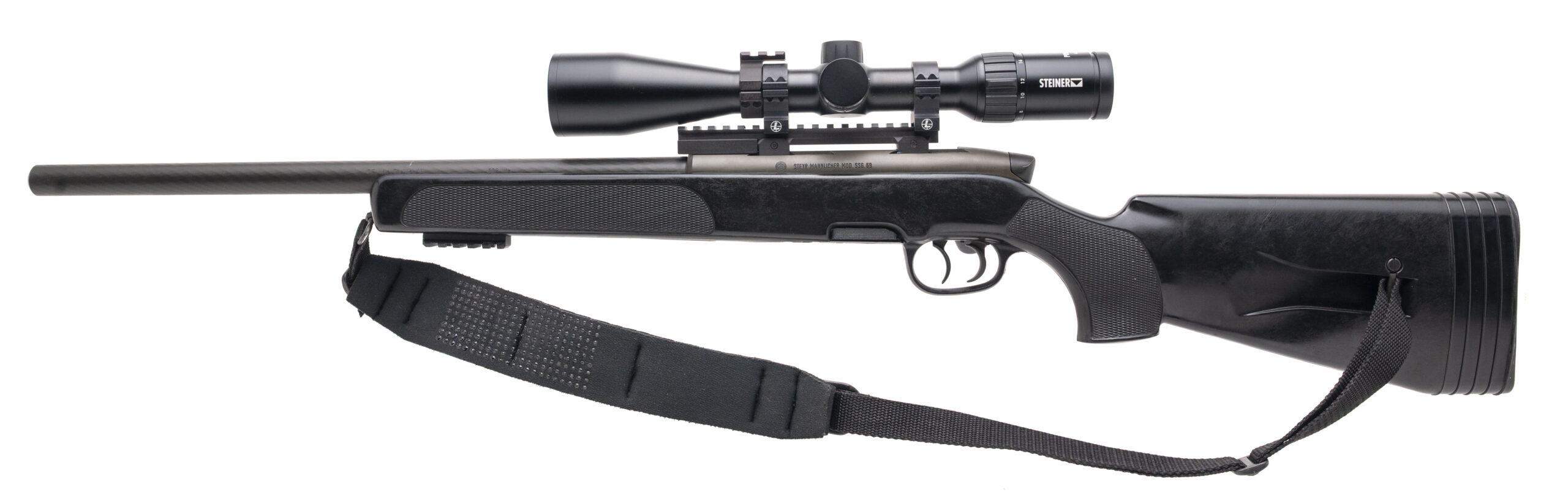 sn: 268470, made in Austria circa 1980's. Bolt action 308 sniper rifle with a 20" spiral fluted heavy contour barrel, double set triggers, detachable rotary magazine, side safety, tactical bolt knob and one piece picatinny mount with a Steiner Predator 4 6-24x50 scope in a black checkered synthetic stock with original recoil pad and spacers and an Otter Creek sling. Overall in very good condition with an excellent bore.