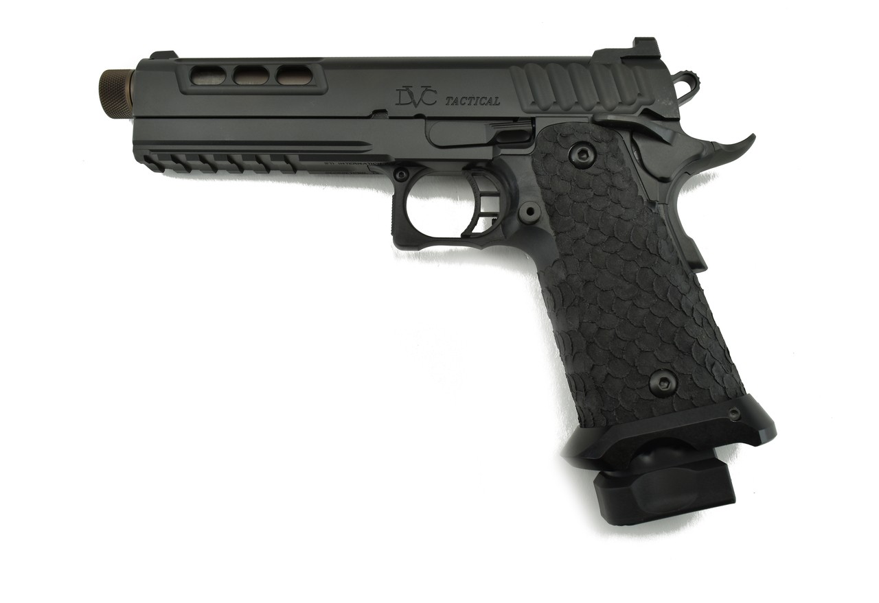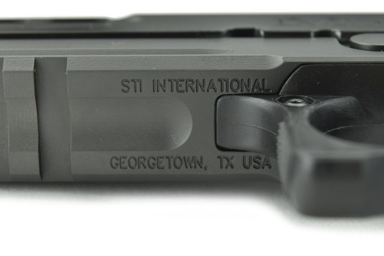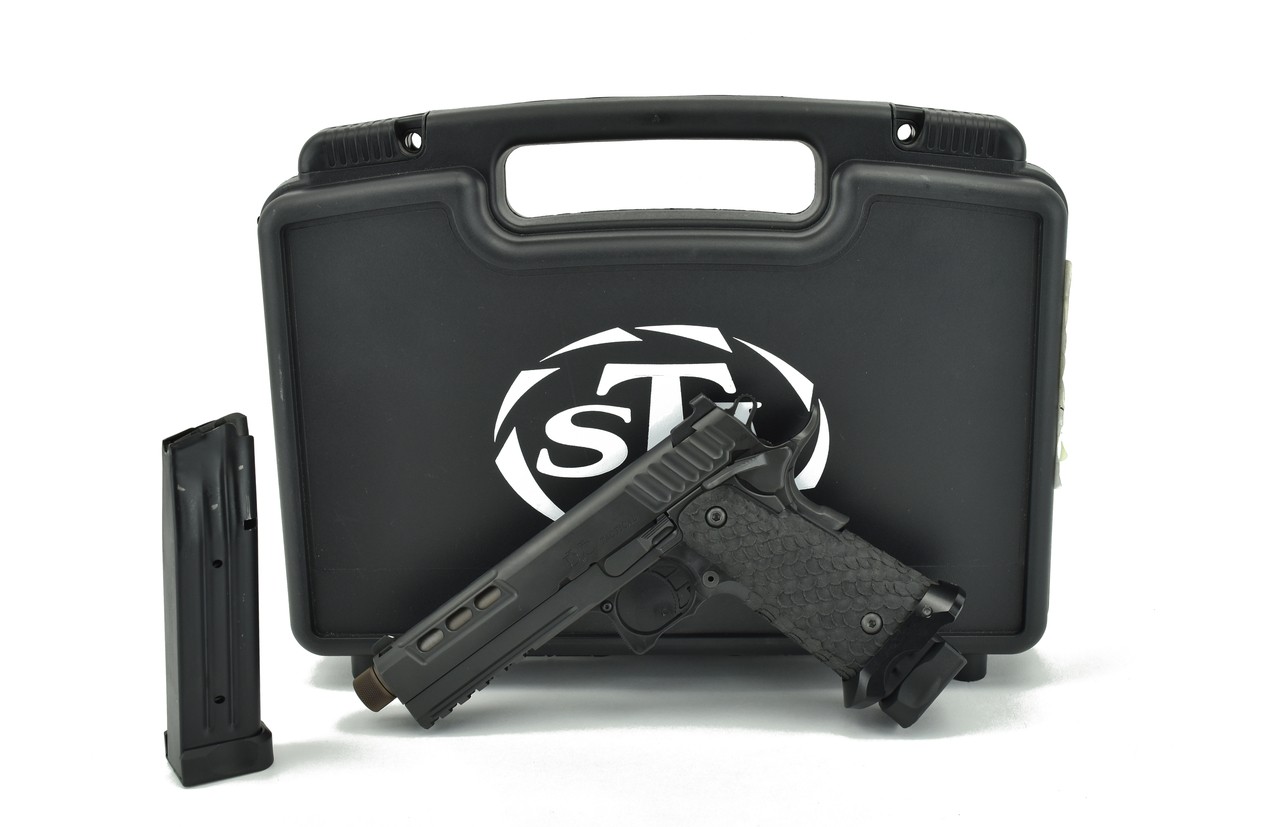 STI 2011 DVC Tactical 9mm caliber pistol. Premium grade tactical model with threaded barrel, Heinie Tritium sights, rail, stippled grip, and DLC black finish. Has 20-round magazine. Excellent condition with box and extra magazine.