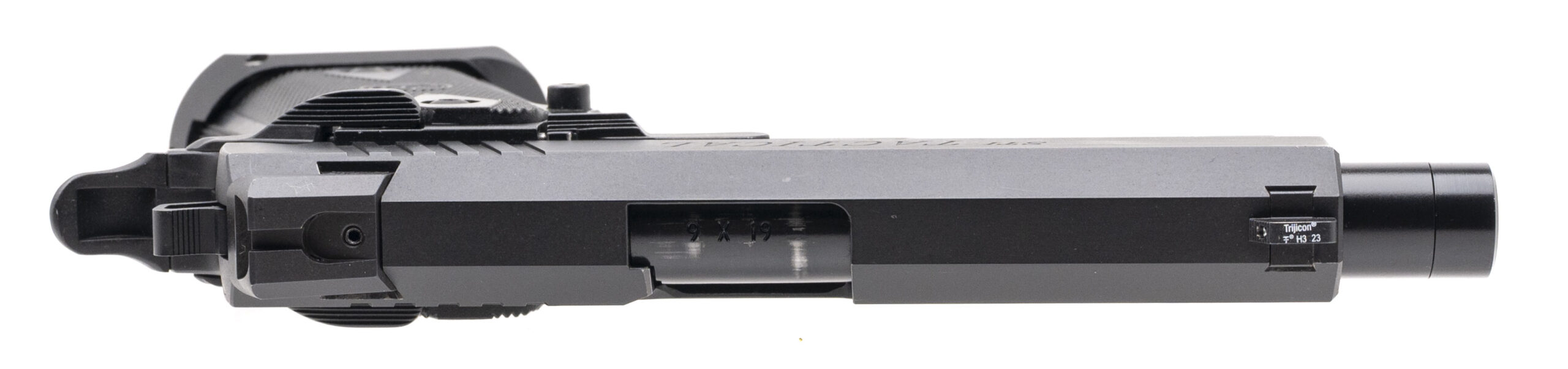 SN: SAS6069. Modern production, 9mm with an 4.25" threaded barrel. Bore is bright with strong rifling. Duty size 2011 pistol with flared magwell and Novak night sights. Overall condition is very good.