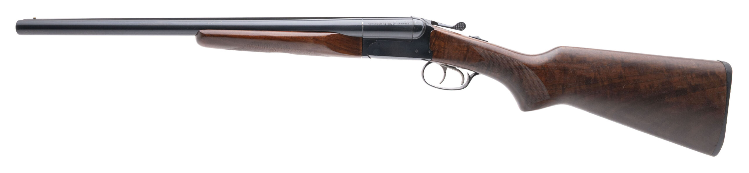 SN: CB14438-14 modern production side by side 12 gauge shotgun with 20″ barrels 3″ chambers and cylinder bore choke with double triggers and an automatic safety. Checkered wood furniture with a 14.5″ LOP to the original butt plate. Some light handling marks, overall in very good condition with excellent bores.