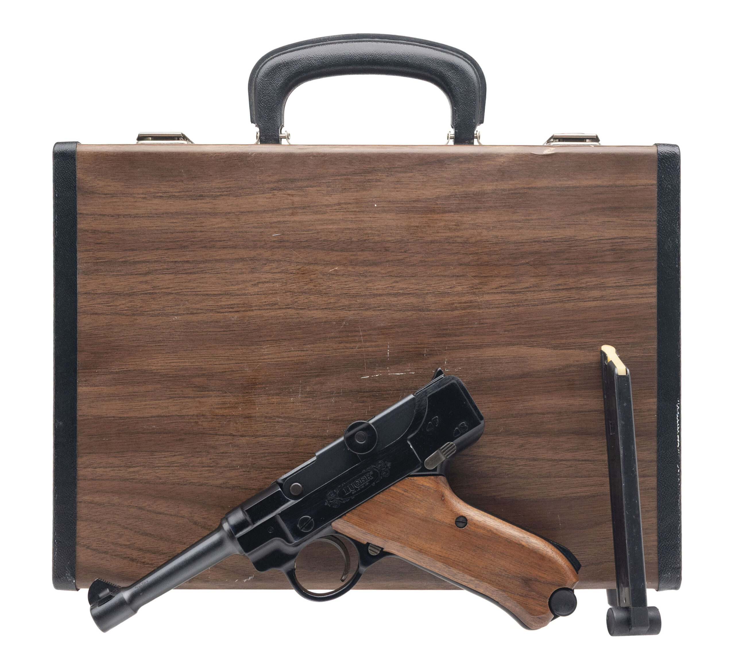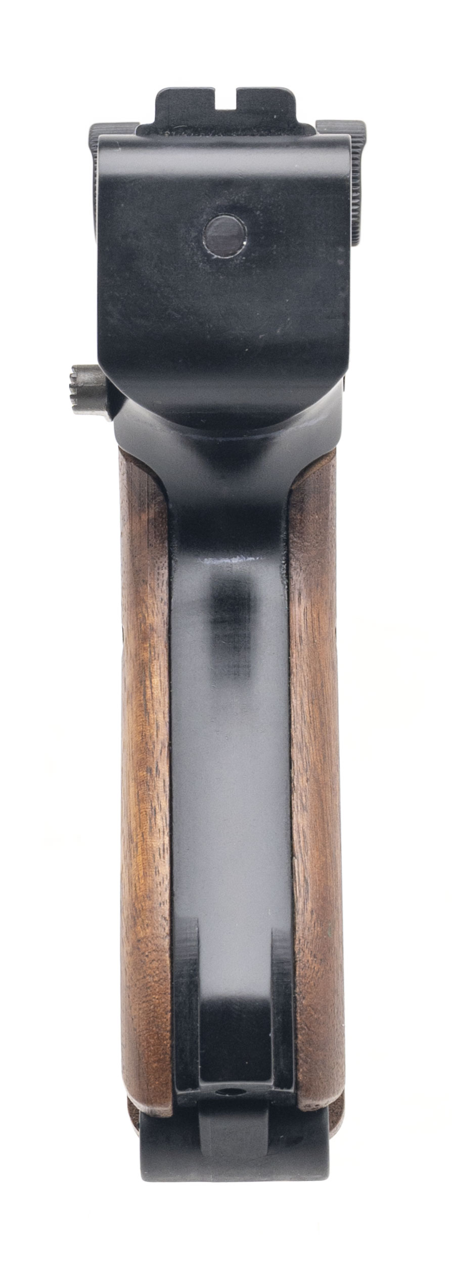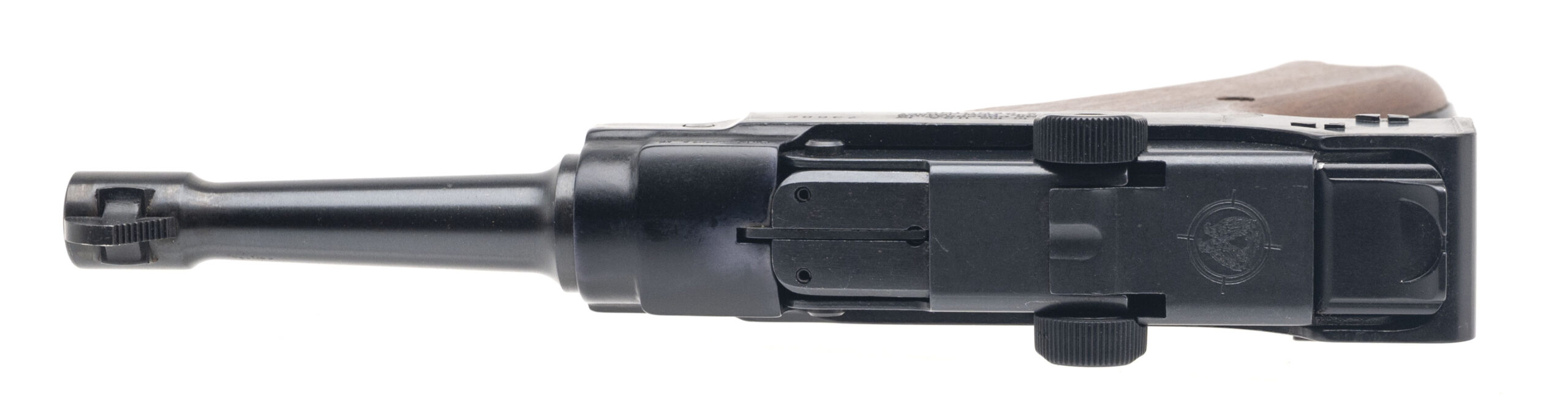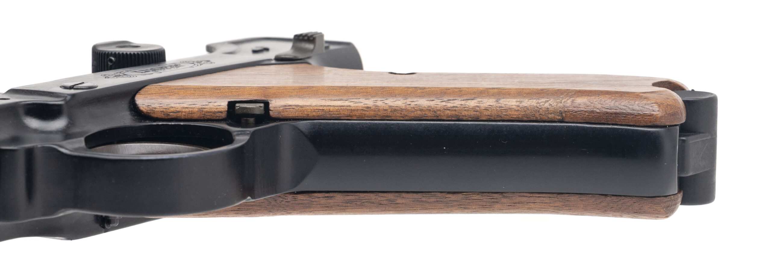 SN:73682. 1970s vintage, .22LR with a 4.5″ barrel. Bore is excellent. German inspired semi-auto rimfire pistol blued finish and wood grips. Minor handling wear to finish. Overall condition is very good. (DALLAS LOCATION)