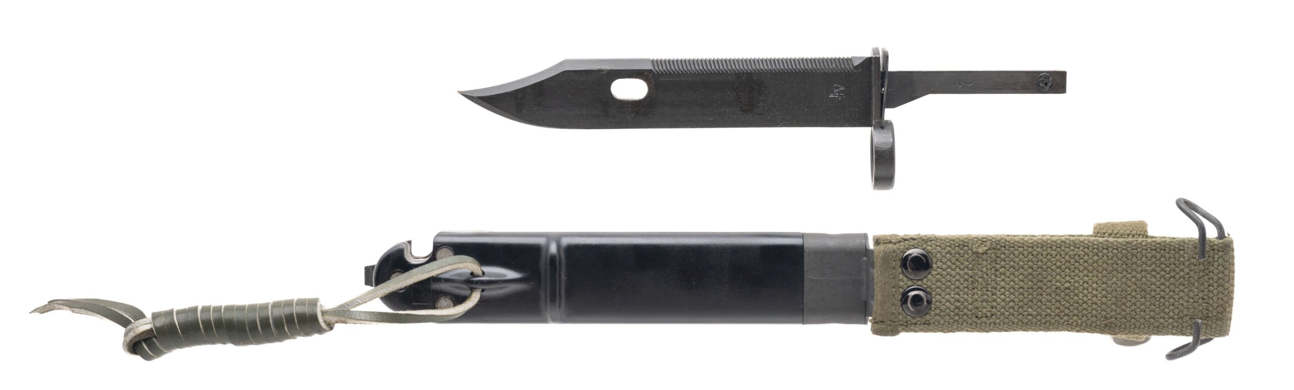 KCB-70 Stoner assault rifle bayonet & wire-cutter scabbard. Comes with green leather leg tie but the bayonet does not have grips.