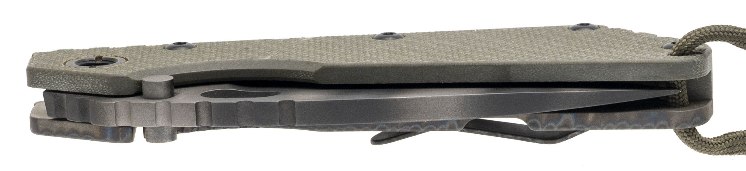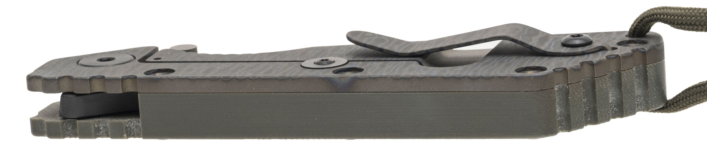 Hand made by Strider Knives this SMF features a 3.5” tiger stripe blade, textured G10 grip scale and titanium frame with a titanium clip. Notches on the thumbrest and Hinderer Lock Bar Stabilizer. Overall in excellent condition.