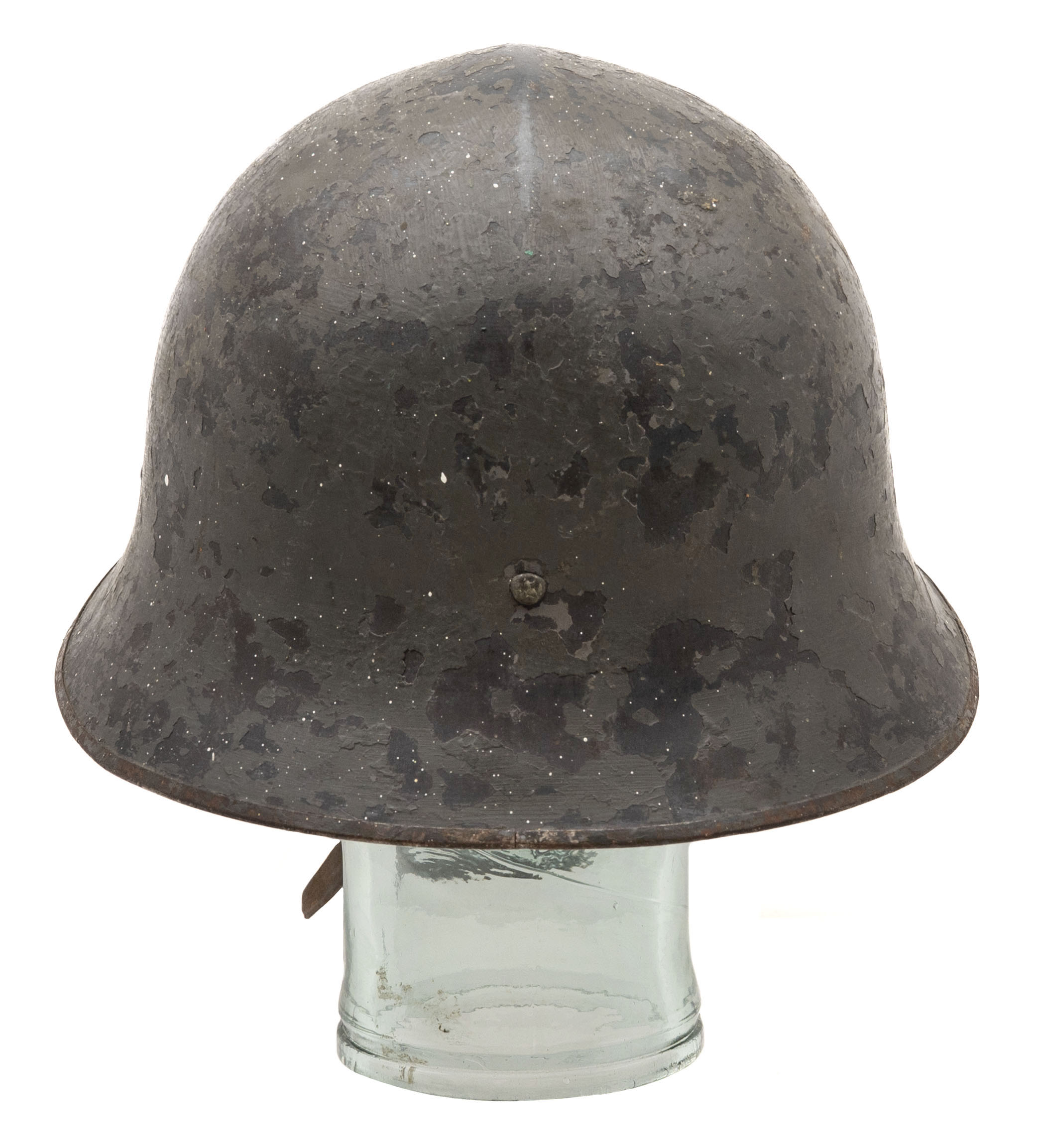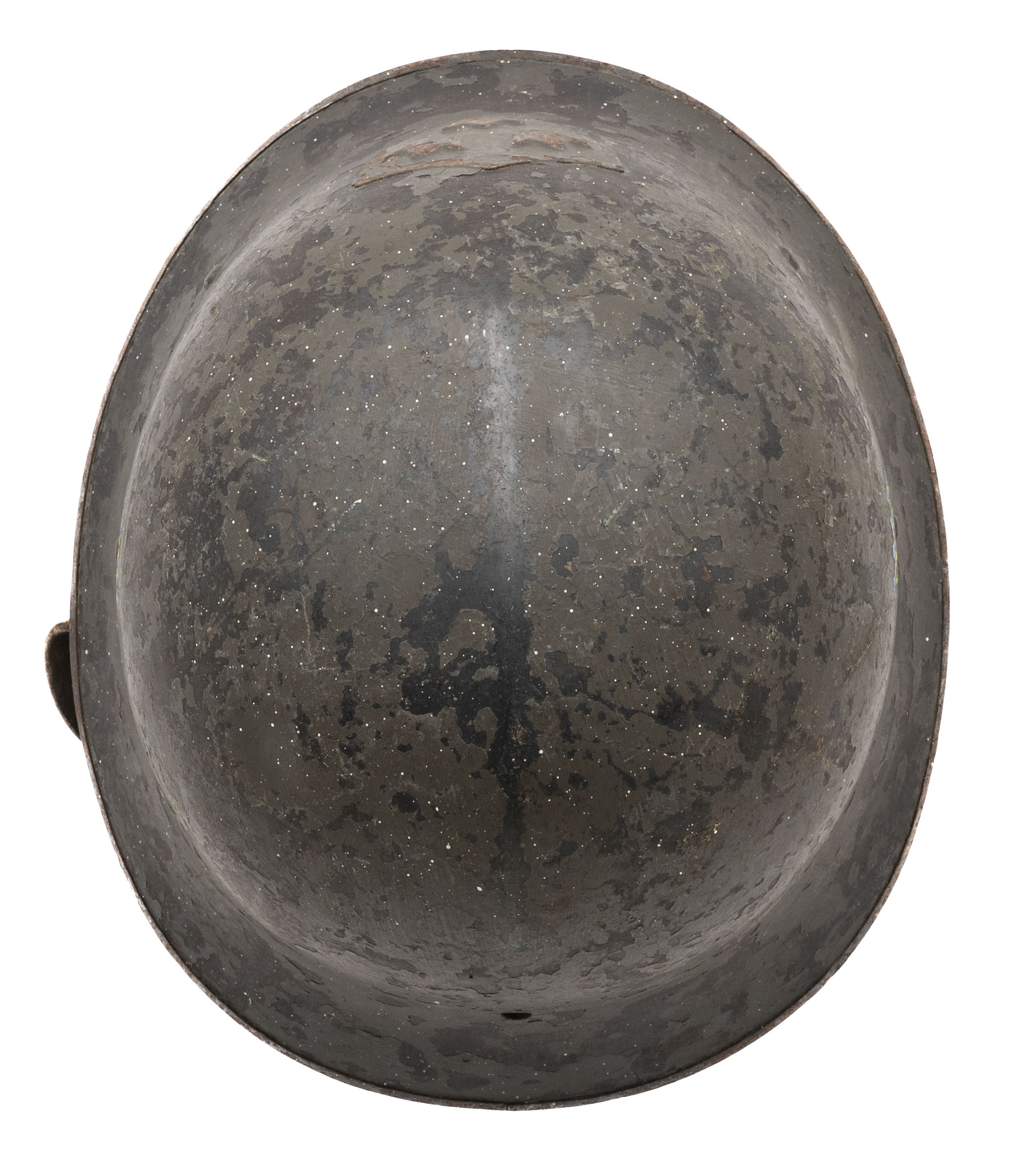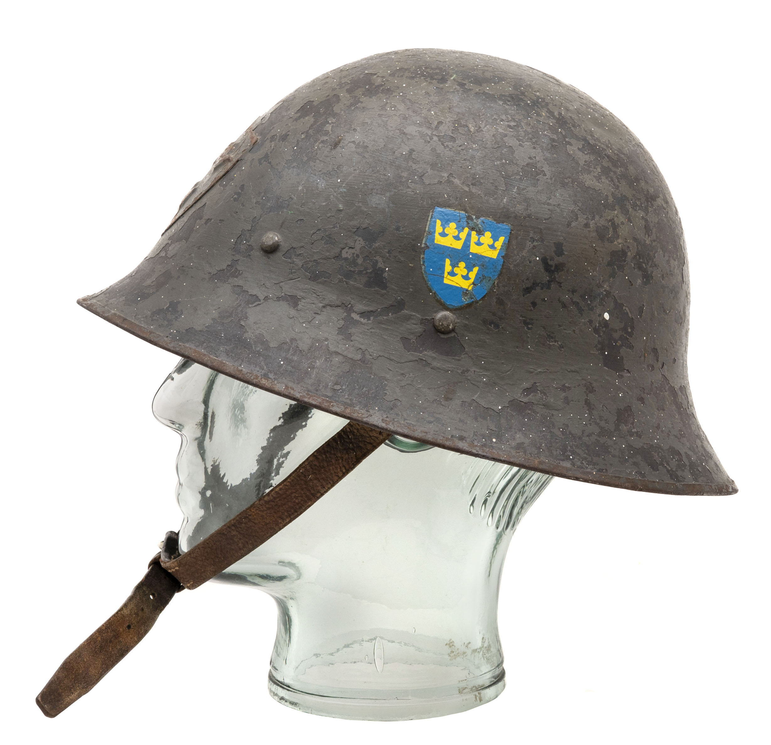 World War II era Swedish M/21 rolled-rim steel helmet in fair condition with original leather liner & chinstraps. The helmet is equipped with a Swedish royal crest on the front as well as decals on the left & right sides. The presence of the decals suggests that the helmet remained in military service beyond the Second World War.