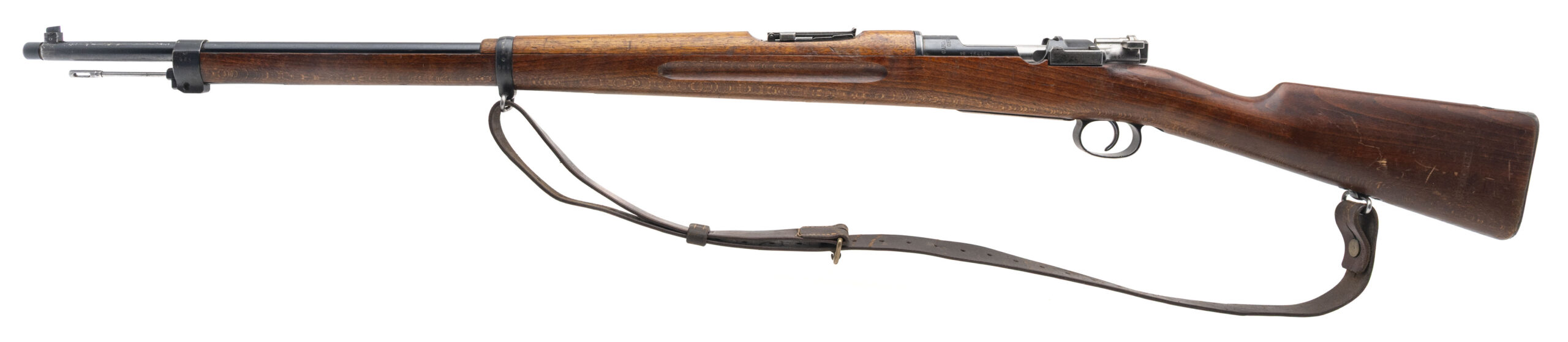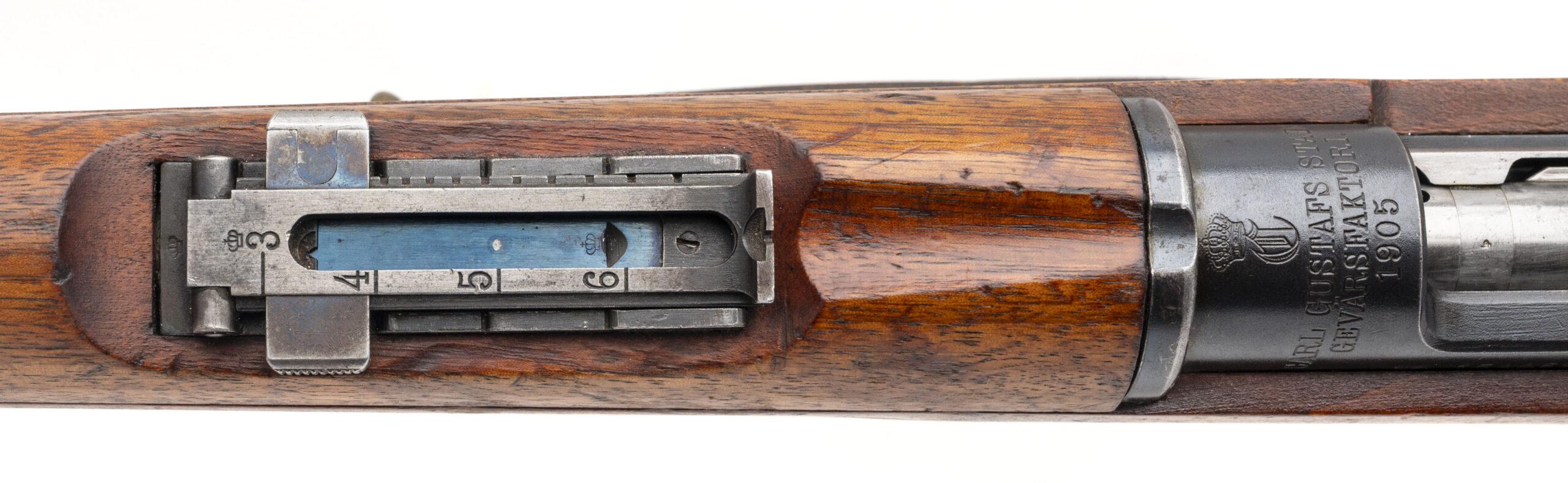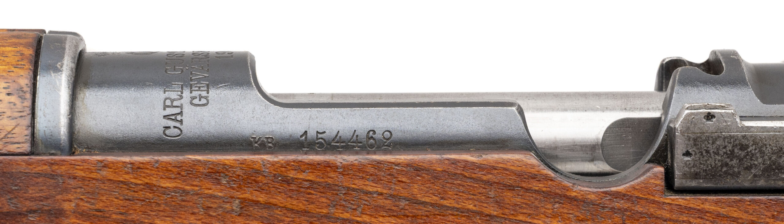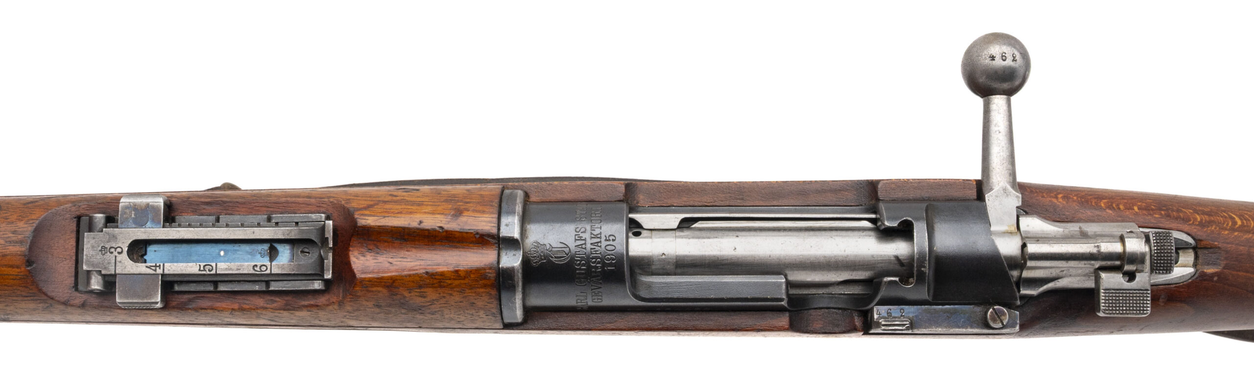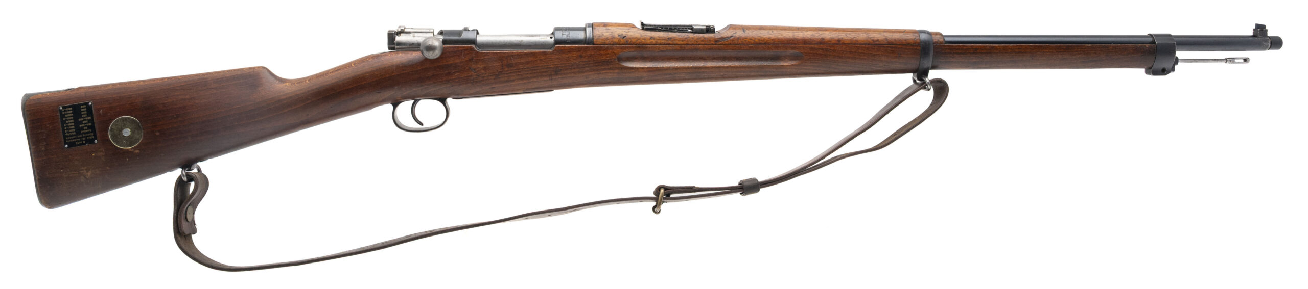 SN: 154462. Made in 1905. Bolt action rifle chambered in 6.5x55mm Swede with a 29" barrel. Overall condition is great with some minor handling wear, bore condition is excellent with sharp rifling. Has All matching number except the cleaning rod. Threaded muzzle, the brass disk seems to have been replaced with a blank one but just behind the brass disk is range chart. Has Sling.
