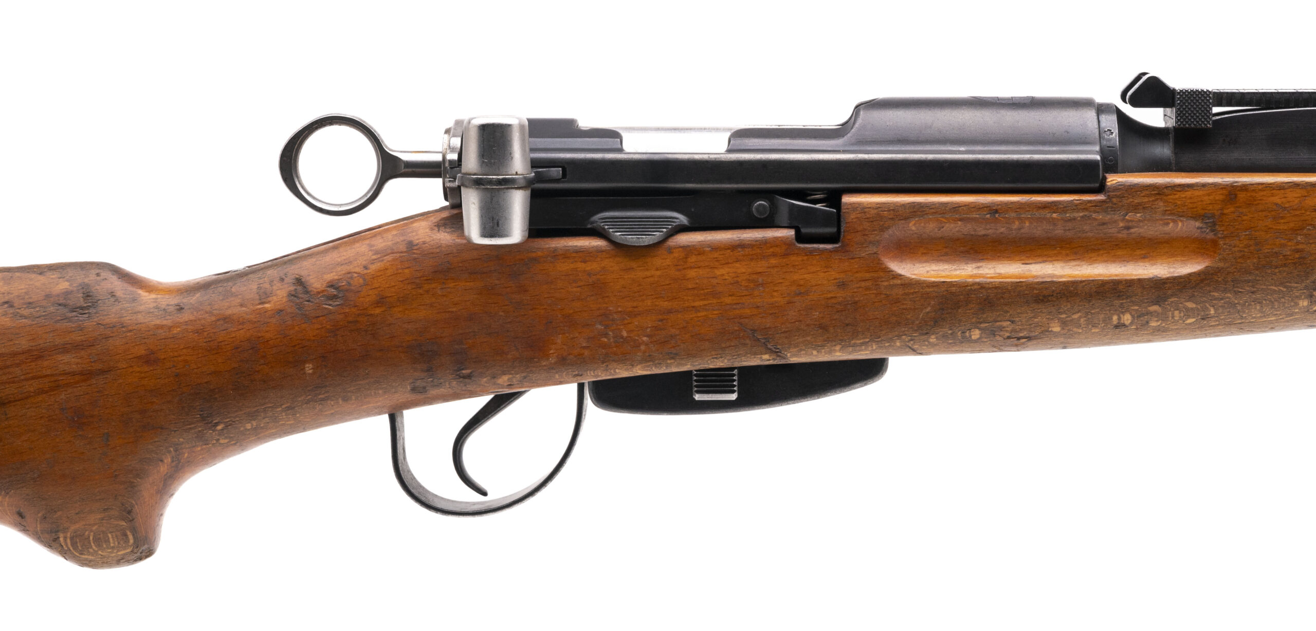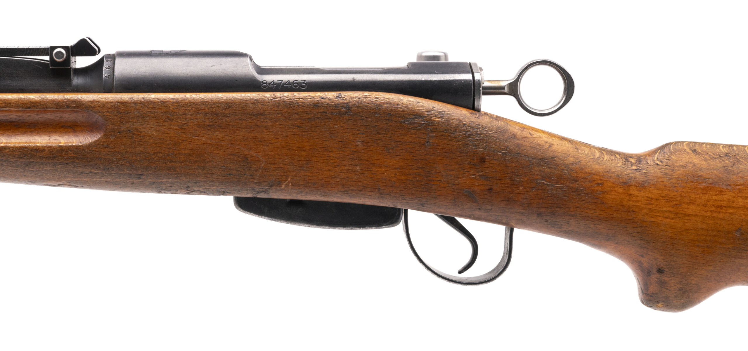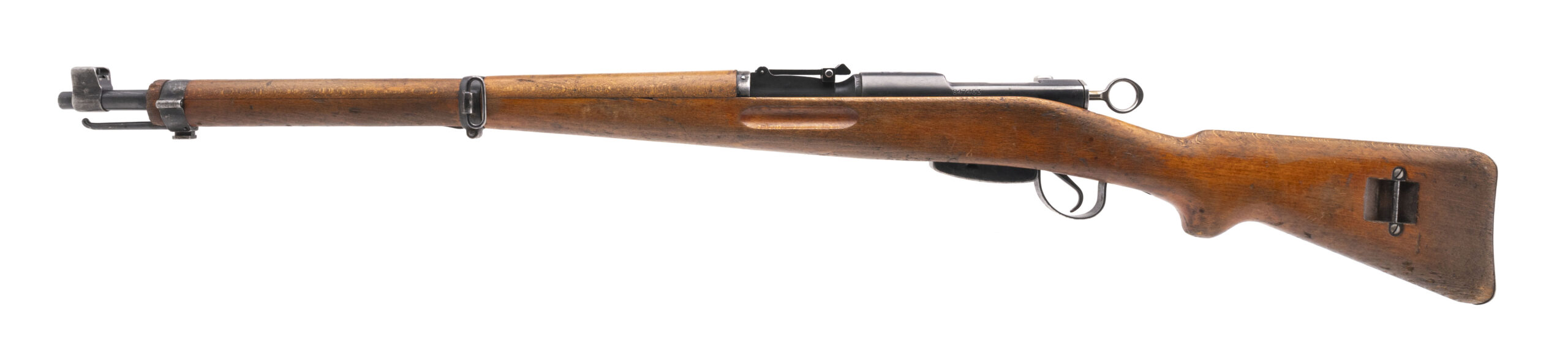 Serial No. 847463, made in 1945, 7.5x55, 26” round barrel. Bore is bright and shiny with strong rifling visible. Serial numbers are matching, barrel is import marked. 95% original finish remains with light ear noted along the edges. Stock has expected nicks, dings and scratches noted. Action is smooth and functions correctly.
