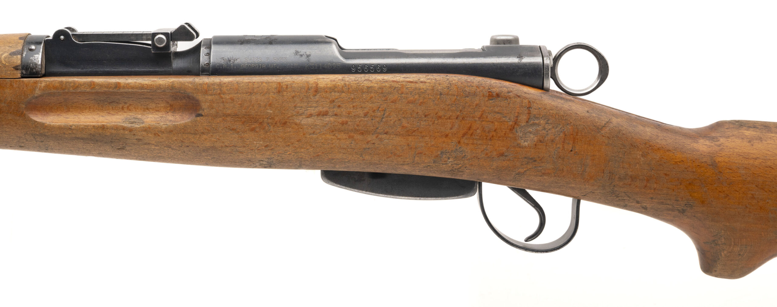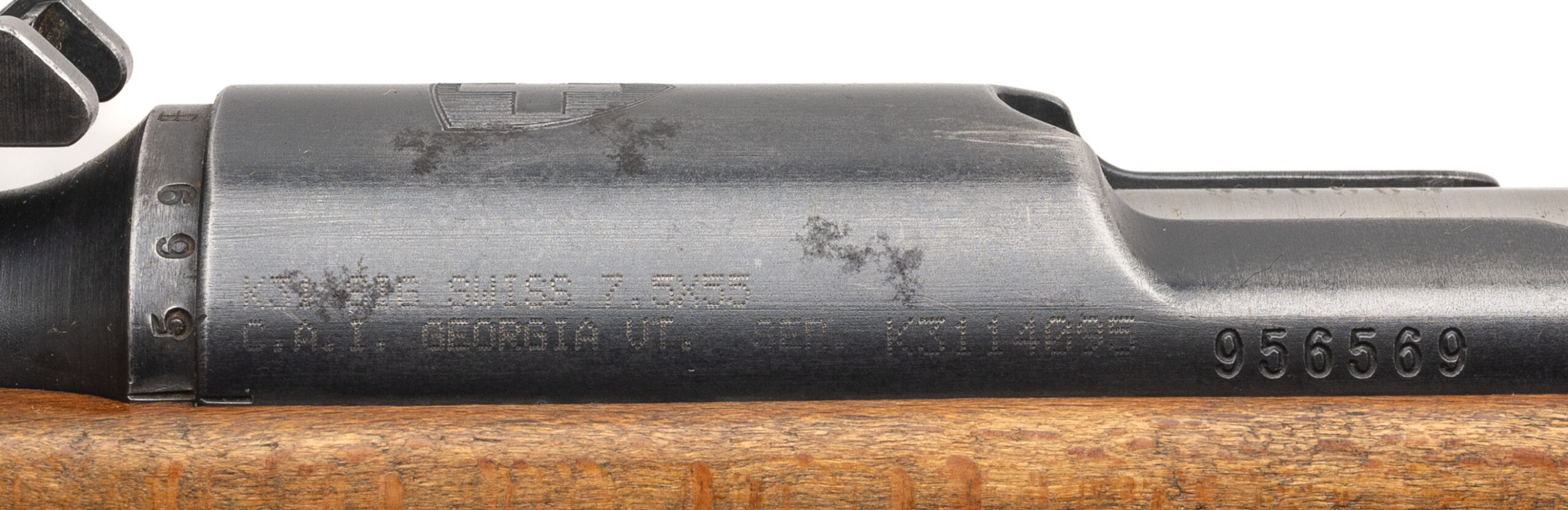Serial No. 956569, manufactured in 1951, chambered in 7.5×55 Swiss with a 25.5" round barrel. The bore is mirror bright with excellent rifling, typical of Swiss military rifles. Serial numbers are matching throughout. Metal surfaces have thinned to a light grey patina, while the stock shows service wear, most notably at the butt plate area. Overall presentation remains honest and representative of a well-maintained postwar K31. Action is smooth and functions correctly.