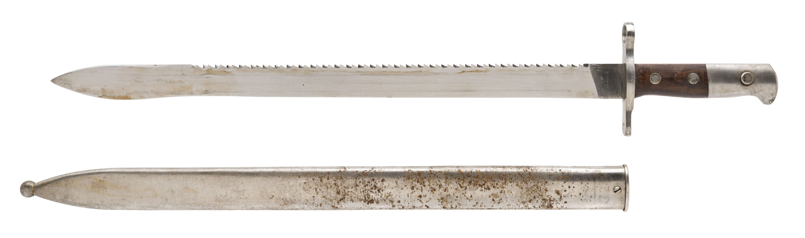 Pioneer's sawback sword bayonet for use on the 7.5mm Schmidt-Rubin M1911 carbine & M1931 Short Rifle (K31). Designated "Sägebajonett Mod. 1914" ("Sawing Bayonet Model 1914"), this item was produced by Waffenfabrik Neuhausen & has an 18.75-inch blade as well as a metal scabbard. Condition is excellent.