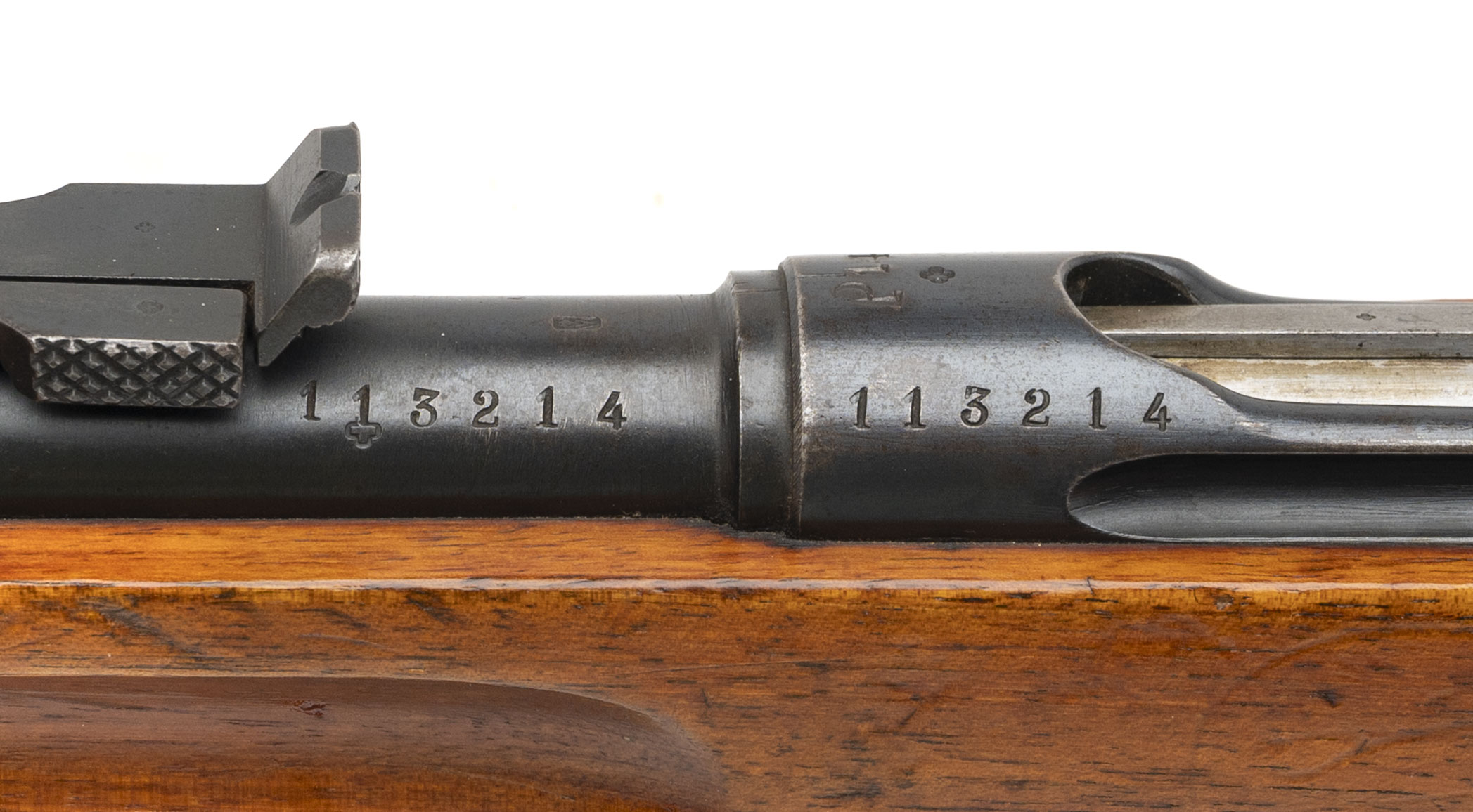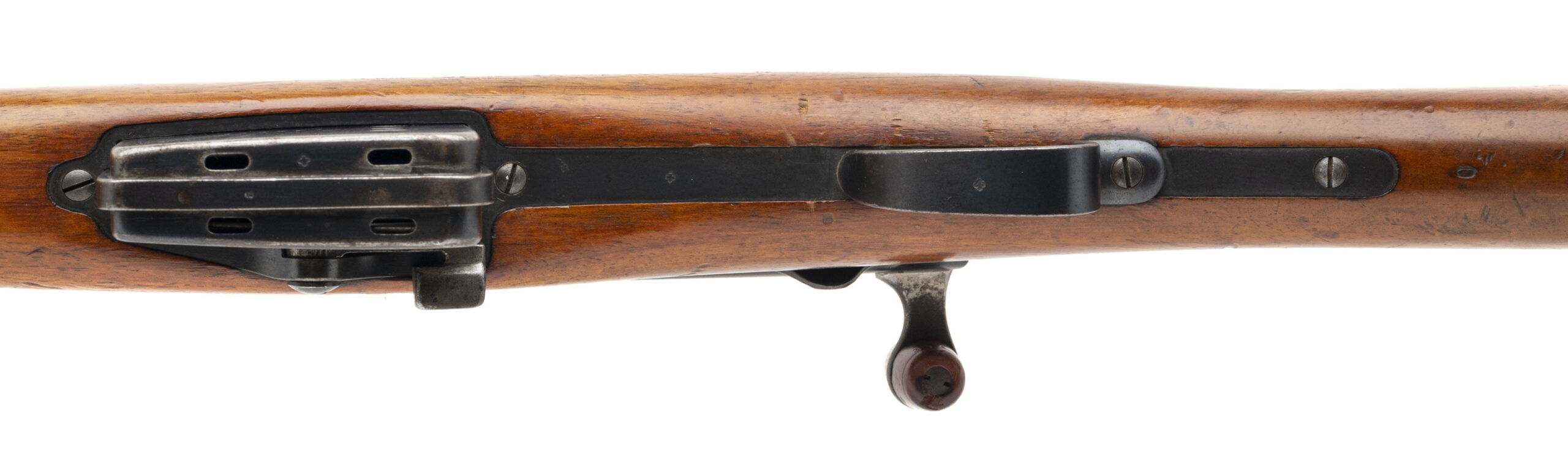 Serial No. 113214, manufactured in 1892, chambered in 7.5 Swiss with a 30.7" round barrel. The bore is bright and shiny with strong, well-defined rifling. Serial numbers are matching throughout, including the magazine. The stock shows only light handling impressions and remains in very good overall condition. Action is smooth and functions correctly. A well-preserved and attractive example of an early Swiss straight-pull service rifle.