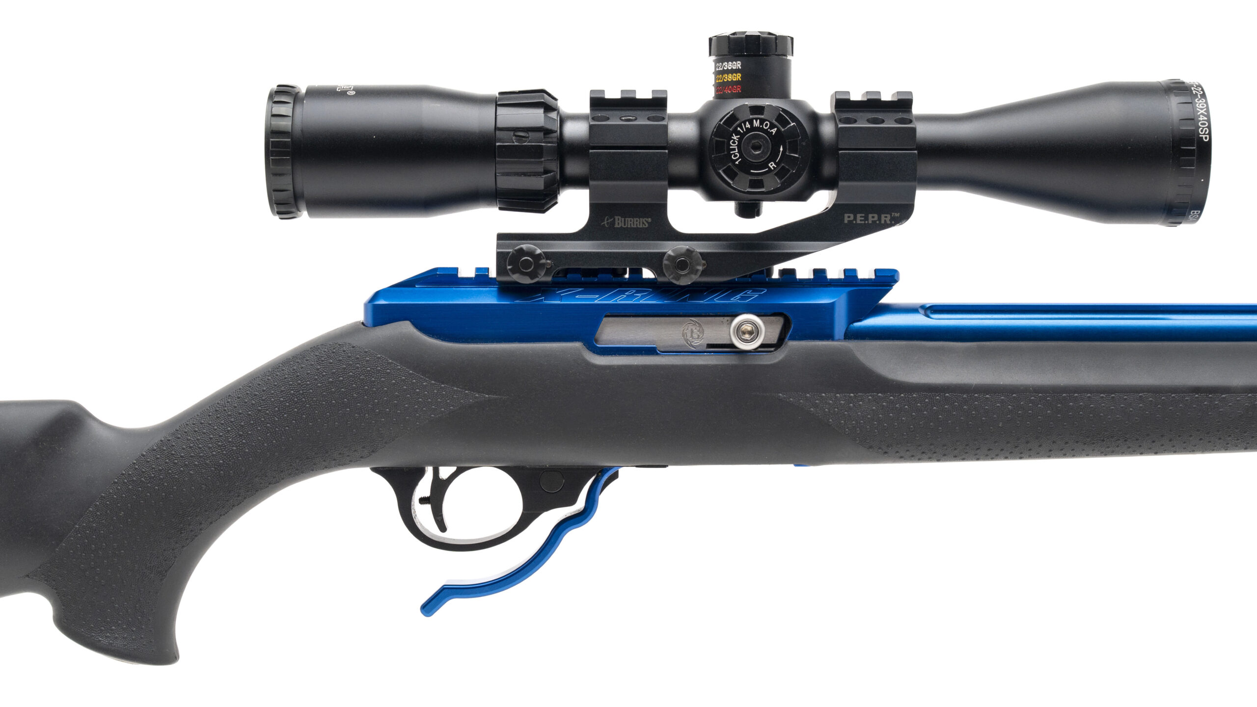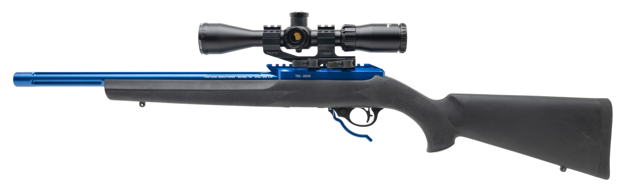 SN: TSX-06526. Modern production, .22LR with a 16" fluted threaded barrel. Bore is very good. Semi-auto precision rimfire rifle with a BSA SWEET-22-39X40SP scope, bright blue finish, and black Hogue overmolded stock. Overall condition is excellent.