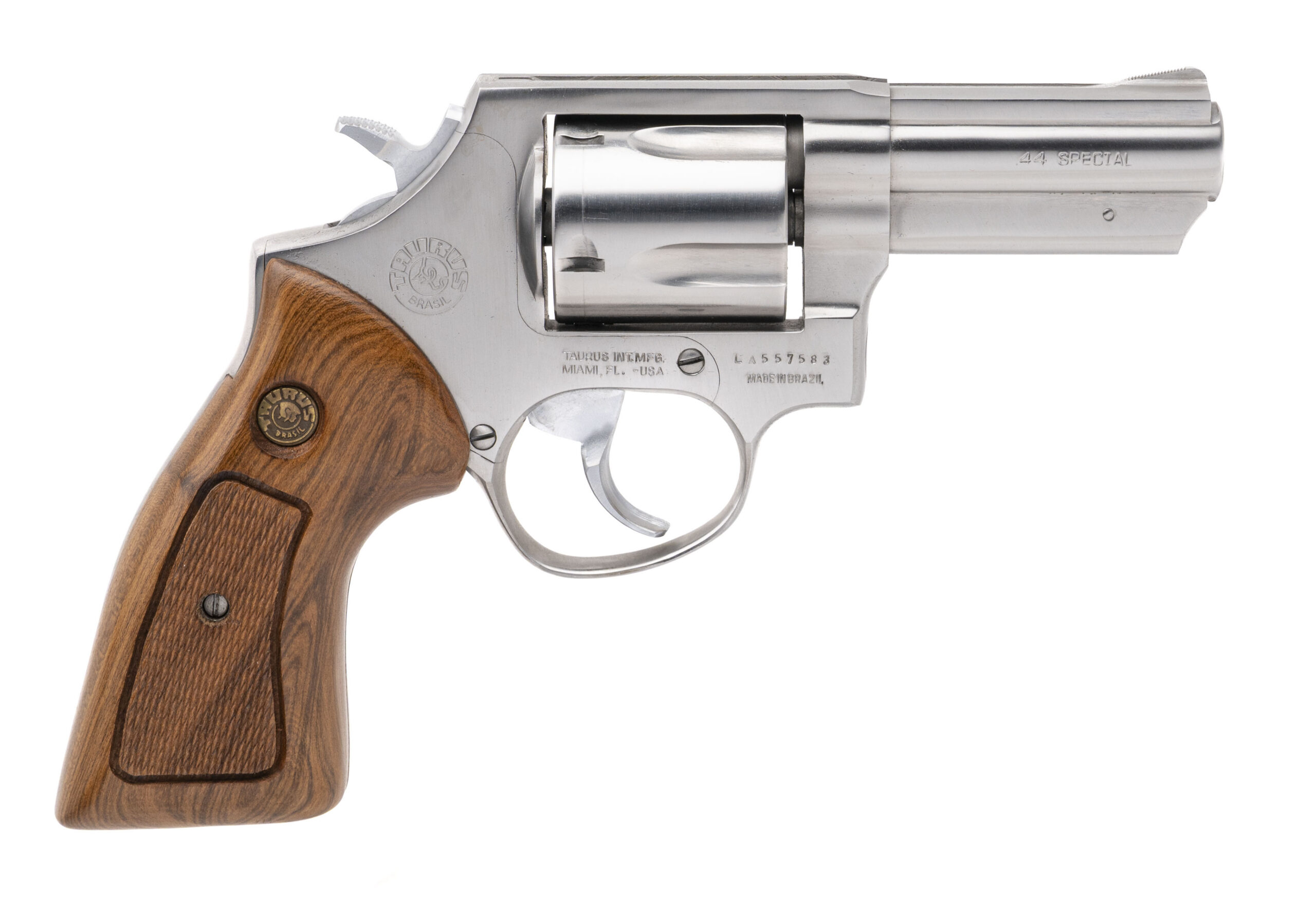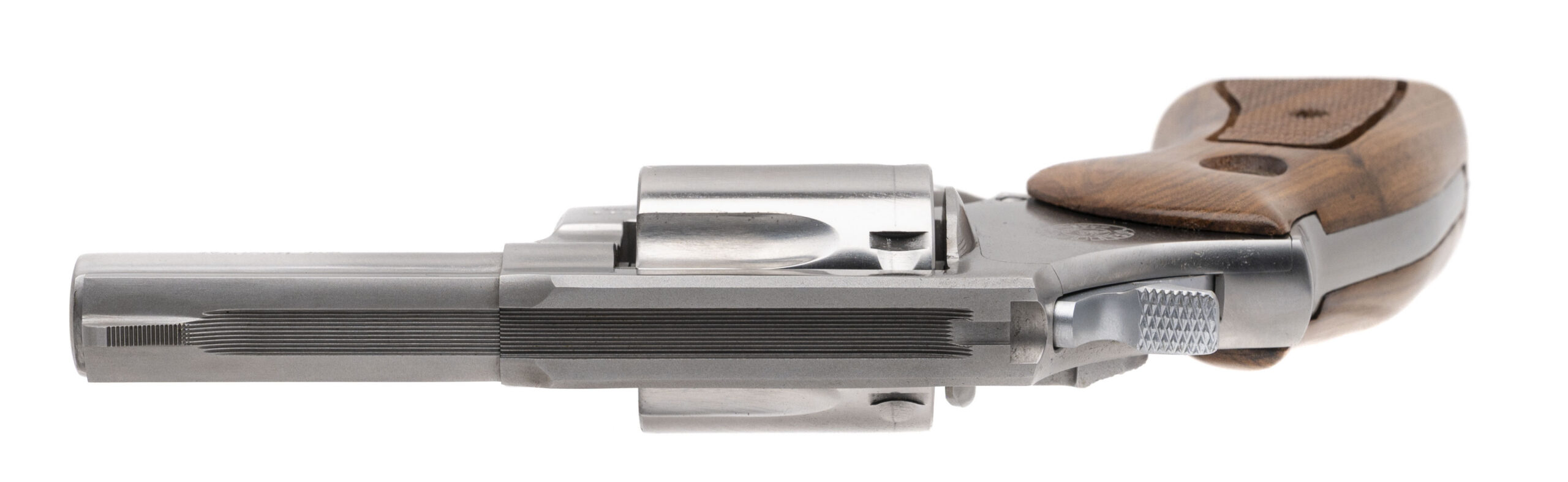SN: LA557583. 1990s vintage, .44 SPL. with a 3" barrel. Bore is very good. Stainless steel frame double-action revolver with a 5rd cylinder, and checkered wood grips. Metal shows light handling marks. Overall condition is very good. Includes original box.