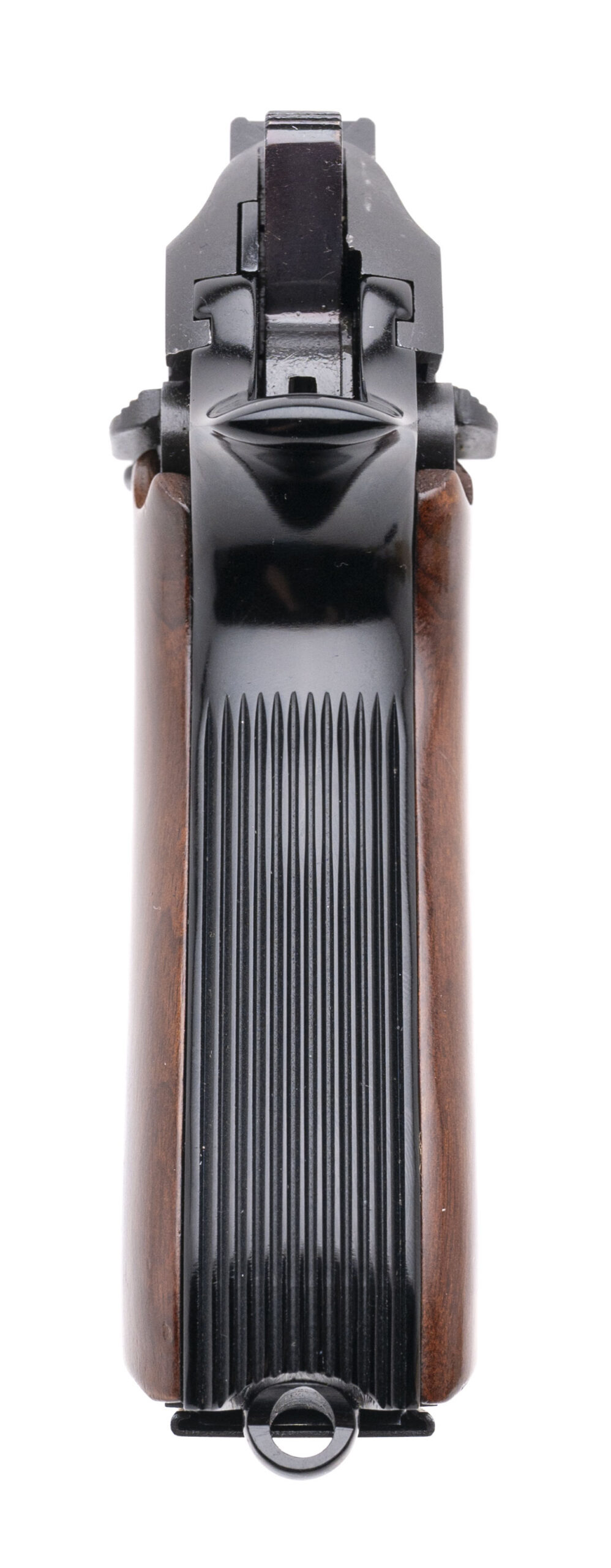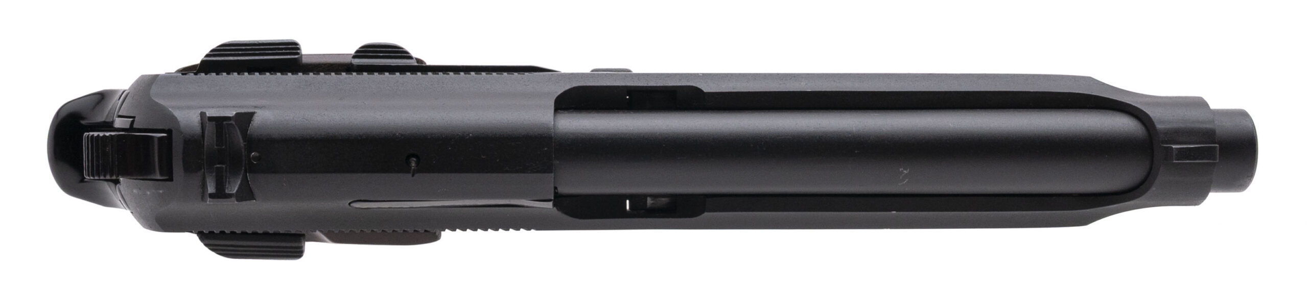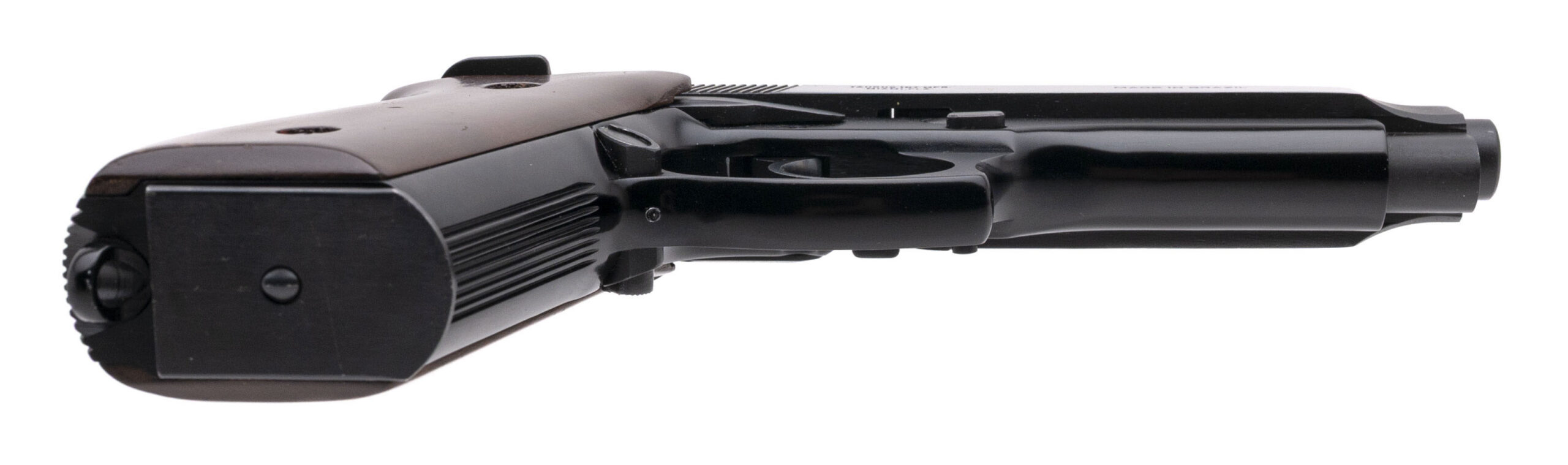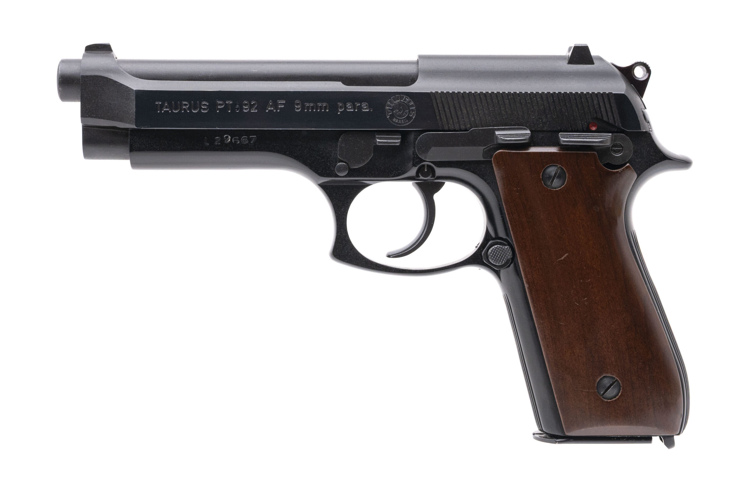 SN: L29667. 1980s vintage, 9mm with a 4.9" barrel. Bore is excellent. Brazilian made double-action alloy frame pistol with an ambidextrous manual thumb-safety, matte black finish, and wood grips. Finish & grips show light marks. Overall condition is very good. Includes an additional magazine, and original box.