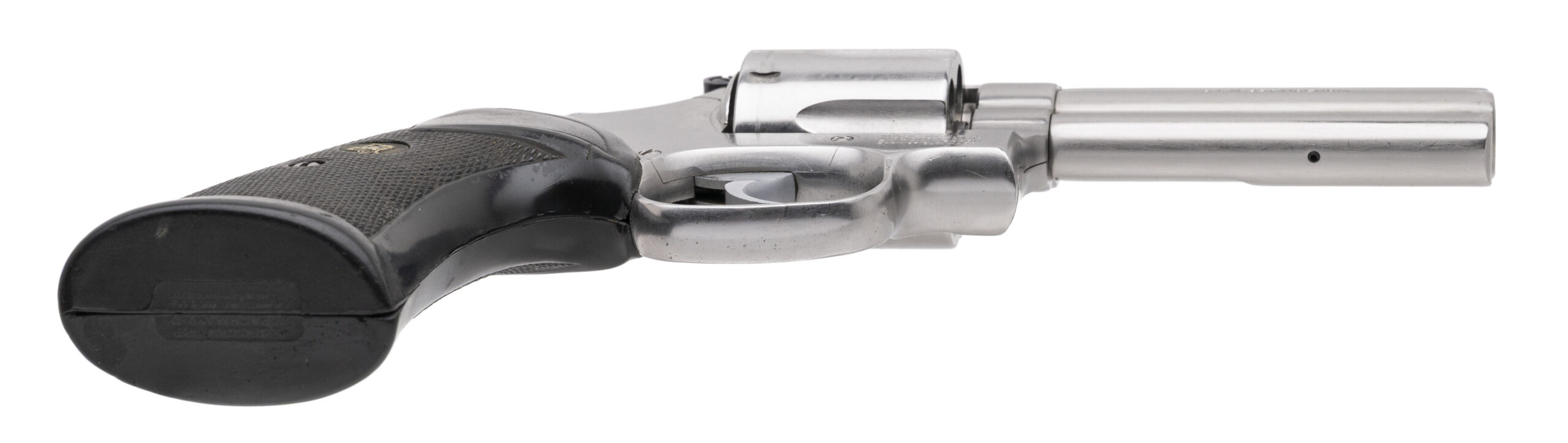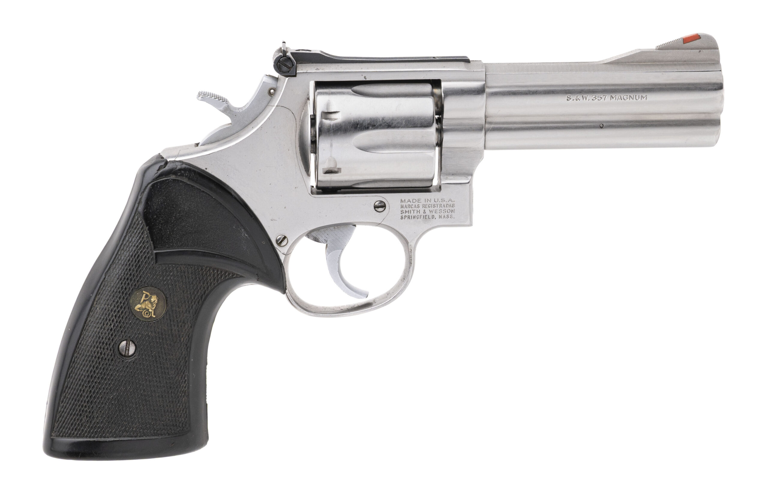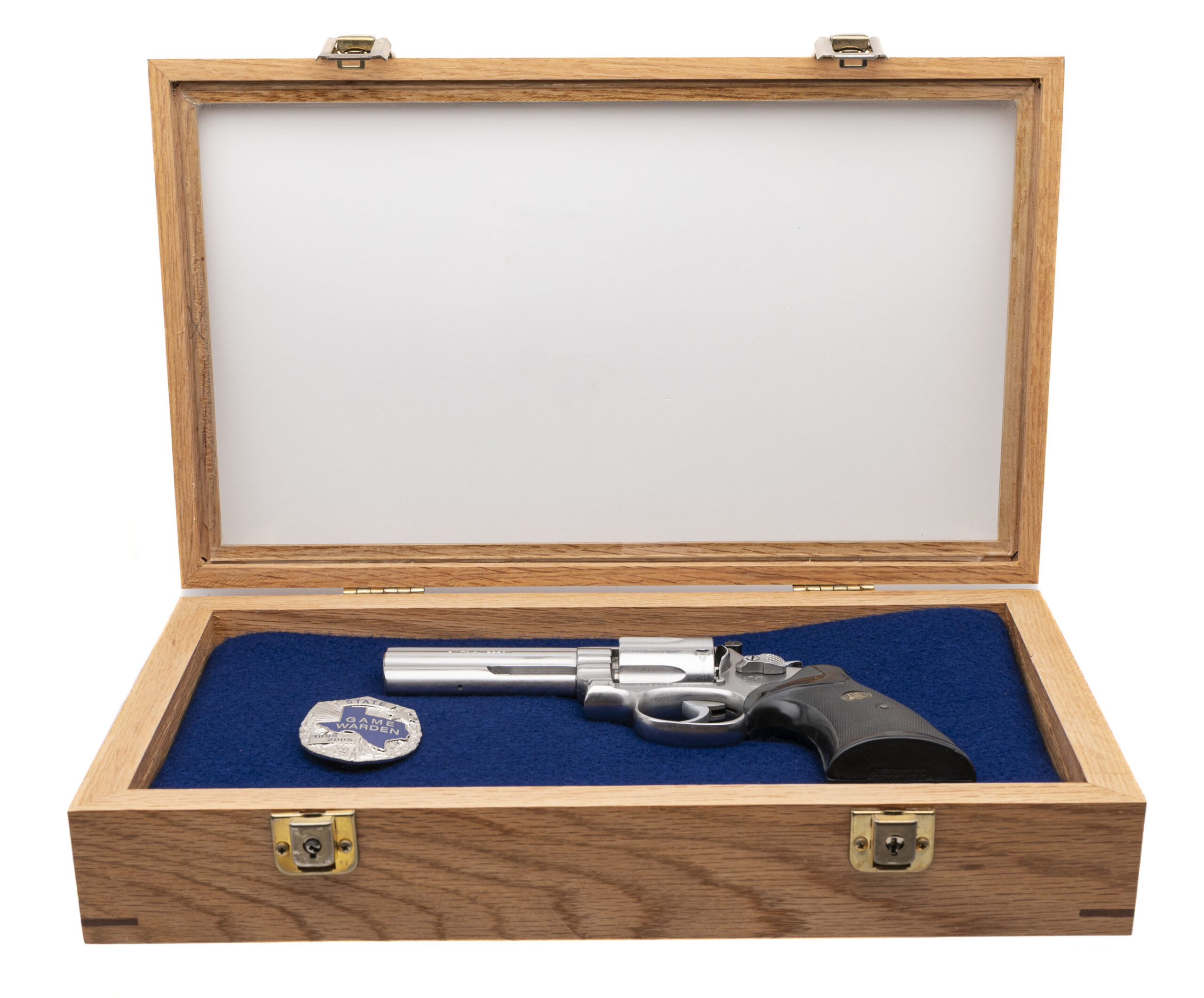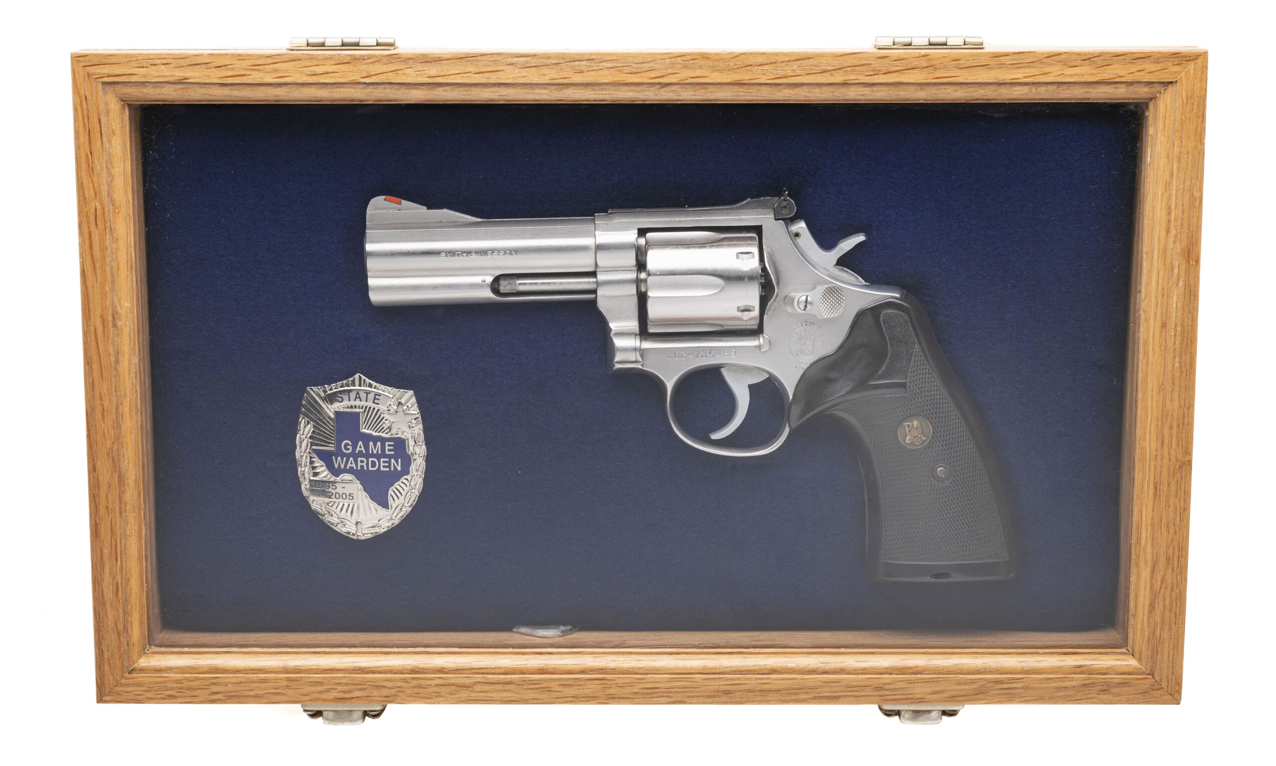 SN: AEJ4382. 1990s production, .357 Magnum with a 4" barrel. Bore is very good Stainless steel L-frame double action revolver with Pachmayr grips. This model was issued to the Texas Parks & Wildlife Department and contains the specialized serial number used by the agency. Metal shows light marks but the overall condition is very good. Comes with a wooden presentation box w/blue outliner and State Game Warden badge.