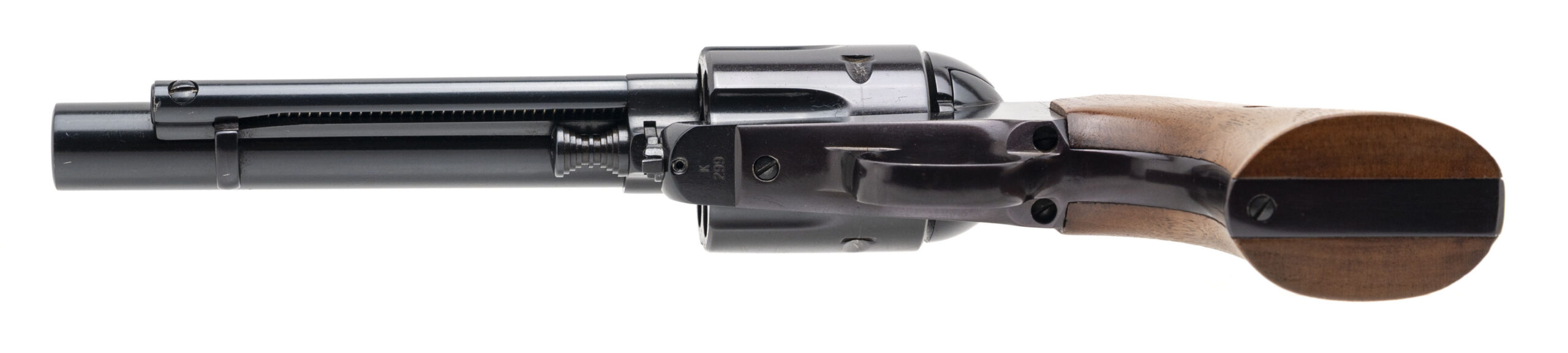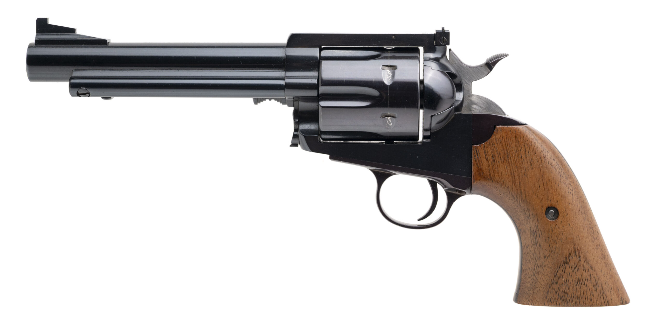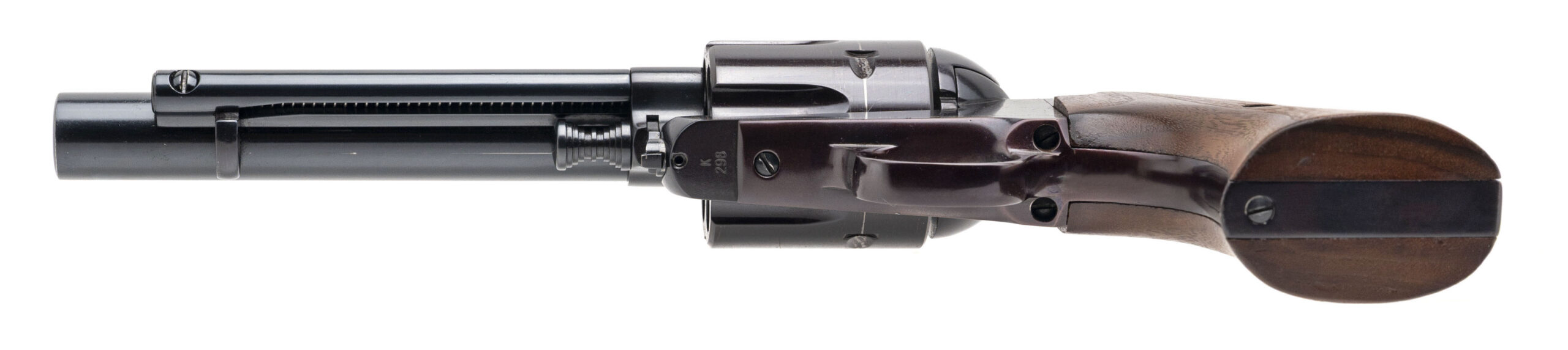 SN: K298 & K299. Made circa 1988-97, .44 MAG. with a 5.5" barrel. Bore is excellent. Rare and desirable 1 of 1,200 made single-action only revolvers with consecutive serial numbers paying homage to the legendary firearms author & enthusiast, Elmer Keith, and his renowned Number Five revolver. These revolvers feature a reoriented left side loading gate & ejector, counter clockwise rotating 6rd cylinder, fixed ramp front blade sight, adjustable rear sight, blue finished steel frame, and lacquered walnut wood grips. Overall conditions are very good. A beautiful pair of sought after bespoke revolvers.