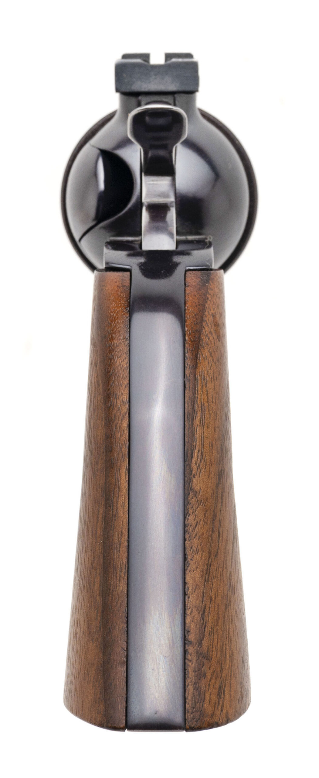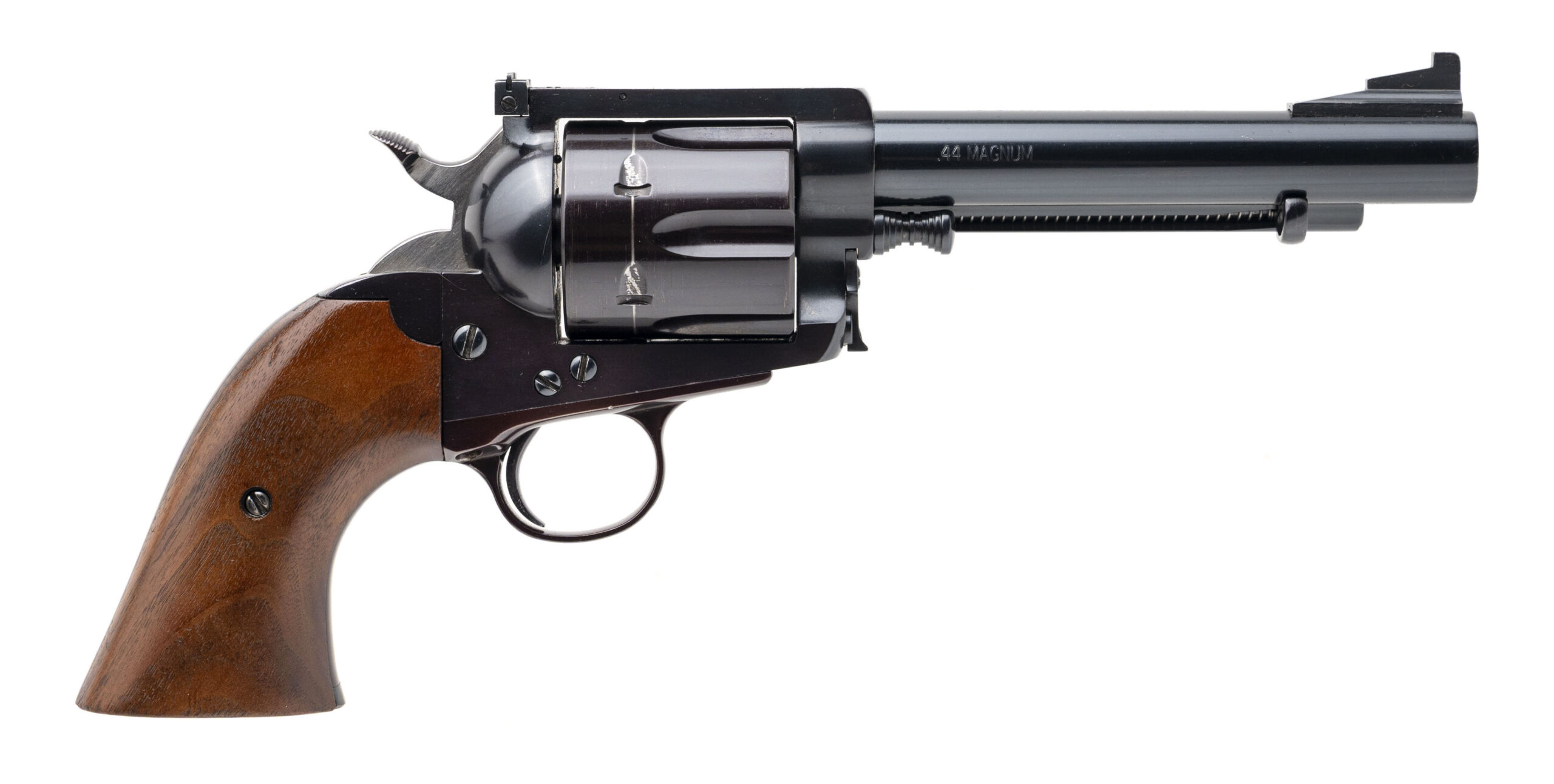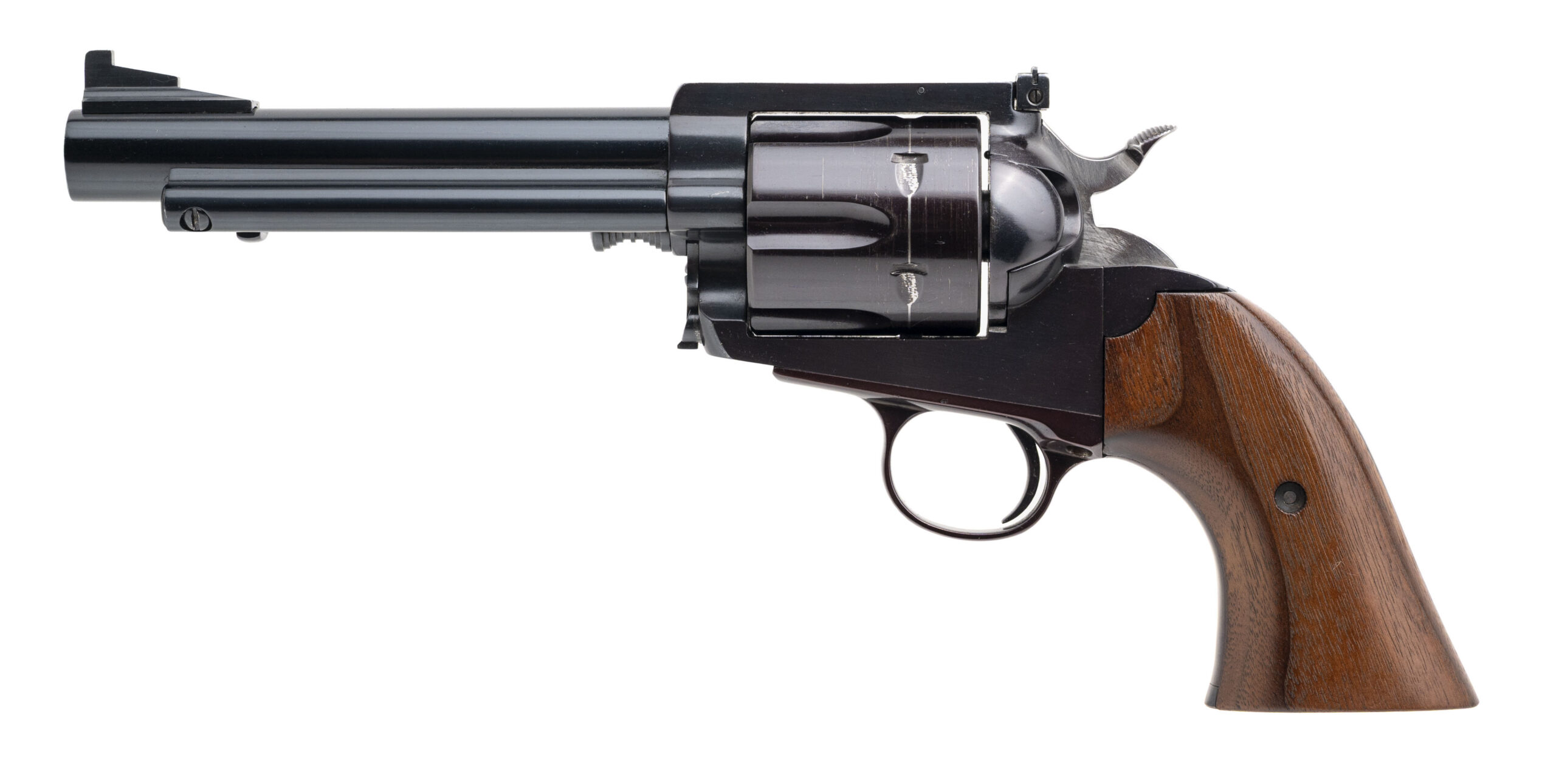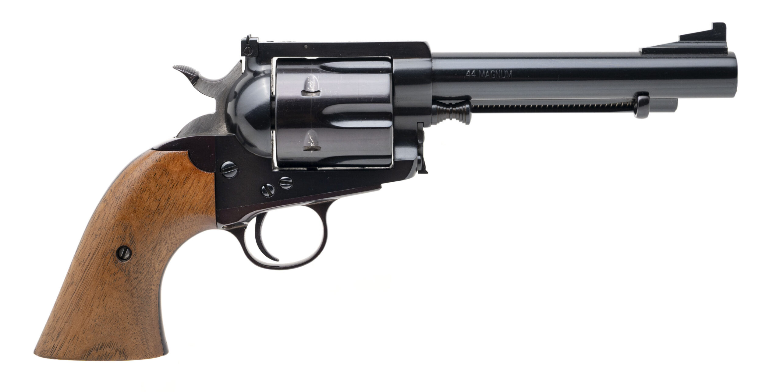SN: K298 & K299. Made circa 1988-97, .44 MAG. with a 5.5" barrel. Bore is excellent. Rare and desirable 1 of 1,200 made single-action only revolvers with consecutive serial numbers paying homage to the legendary firearms author & enthusiast, Elmer Keith, and his renowned Number Five revolver. These revolvers feature a reoriented left side loading gate & ejector, counter clockwise rotating 6rd cylinder, fixed ramp front blade sight, adjustable rear sight, blue finished steel frame, and lacquered walnut wood grips. Overall conditions are very good. A beautiful pair of sought after bespoke revolvers.