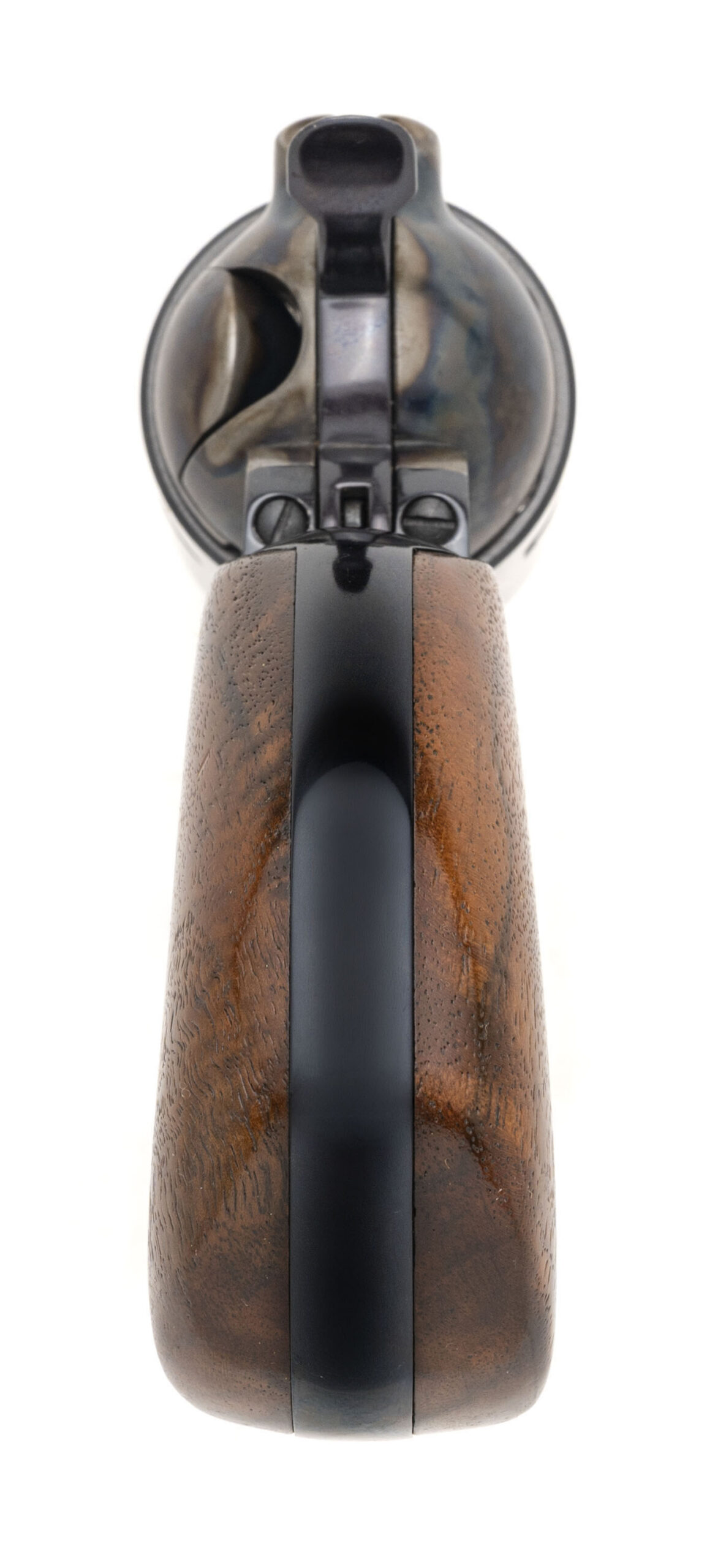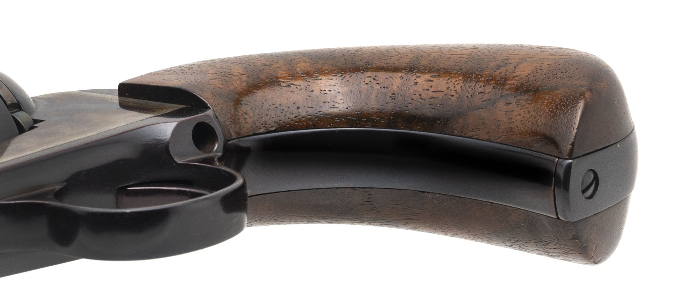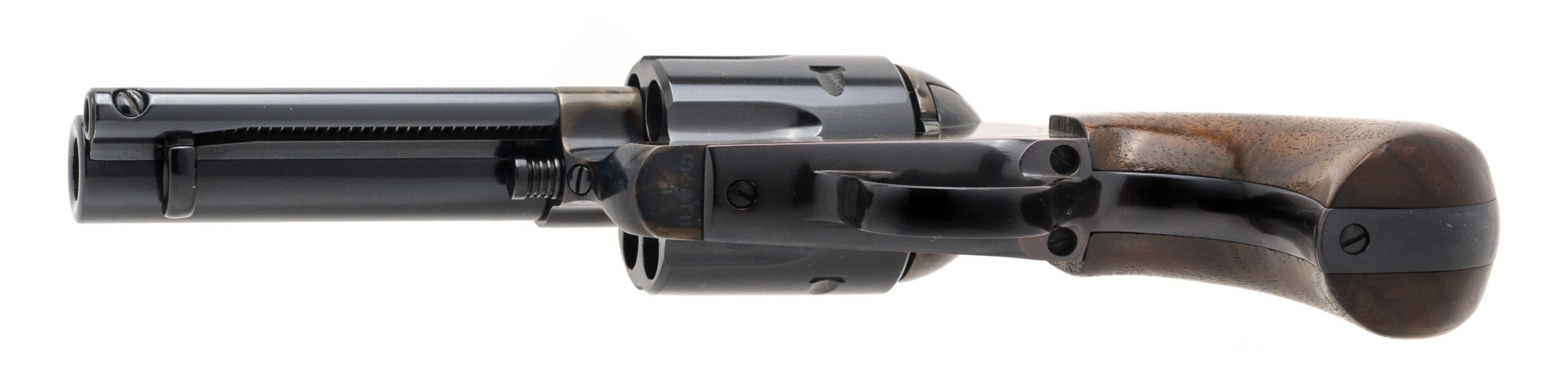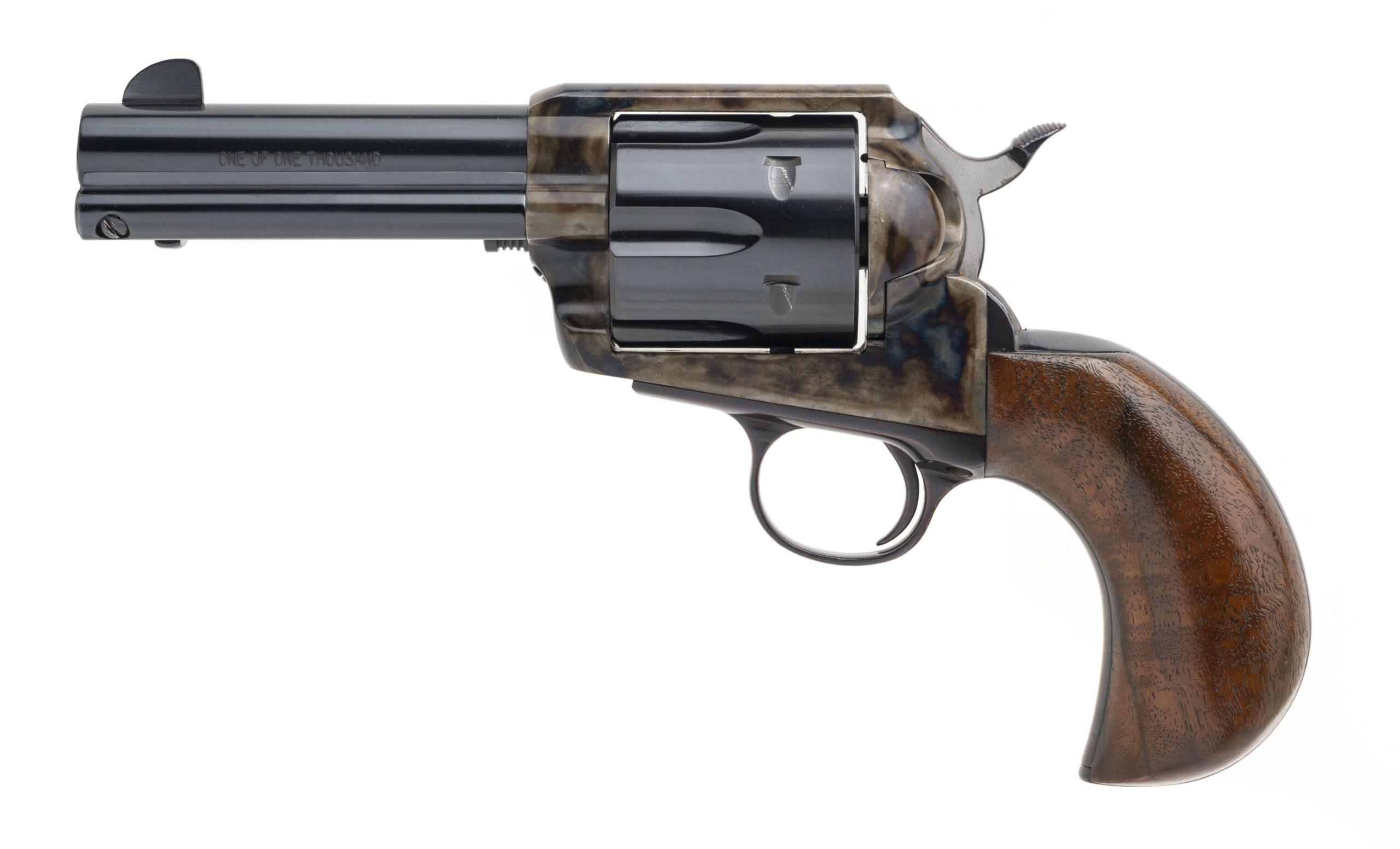 SN: BHJW-269. 1990s vintage, .45 Cal with a 4" barrel. Bore is excellent. Rare and desirable single-action only color case hardened steel frame revolver with a bladed front sight, left side loading gate, 6rd cylinder w/counter-clockwise rotation, blued finish, and wood birds head grips. Finish shows light handling marks. Overall condition is very good.