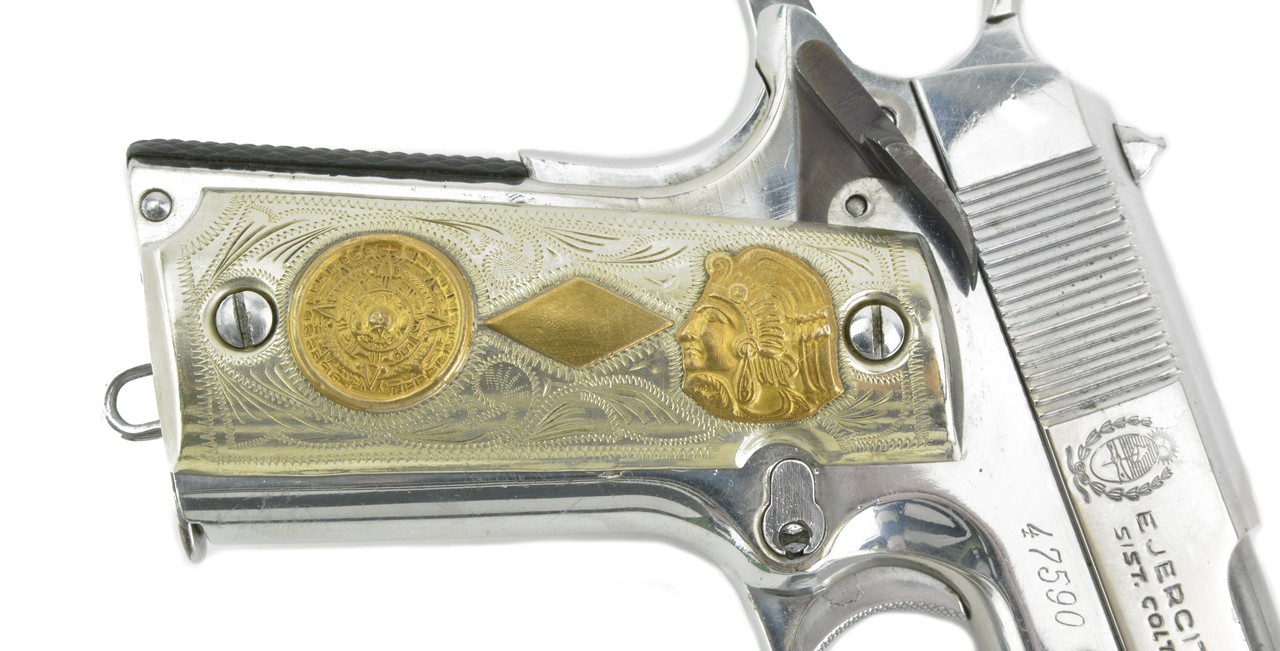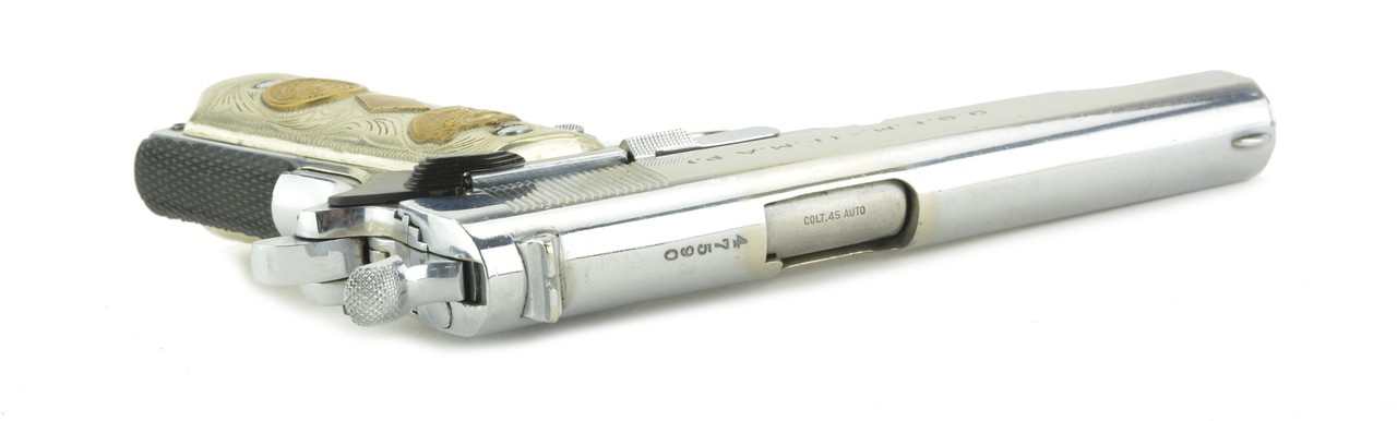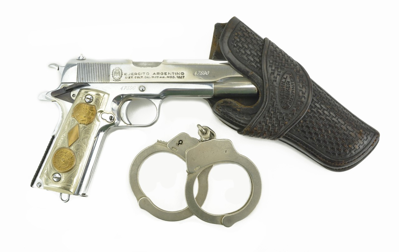 Texas ranger Lone Wolf Gonzaullas D.G.F.M. 1927 .45ACP caliber pistol. Owned by Texas Ranger “Lone Wolf” Gonzaullas 1911 Argentine 1911 once owned by Legendary Texas Ranger Manuel Trazazas Gonzaullas also known as “Lone Wolf Gonzaullas”. This gun has been refinished and has Mexican silver grips along with several other replacement parts. This gun comes with a letter from a gentleman named Floyd Hilton who explains his grandfather was friends with Ranger Gonzaullas and would stop by to visit on a regular basis. Mr. Hilton also became friends with Ranger Gonzaullas and asked Ranger Gonzaullas for one of his old pistols and Ranger Gonzaullas brought him this gun. He became a lawman himself and carried this gun and added the later after-market parts. Along with this gun and letter comes a A.W. Brill basket weave holster and a pair of handcuffs with Mr. Hilton’s last name “Hilton” engraved in cursive. Lone Wolf Gonzaullas is one of the most famous rangers in the Ranger Force. Along with the letter Mr. Hilton is biographical information on Ranger Gonzaullas. Very fine historical Texas Ranger piece.