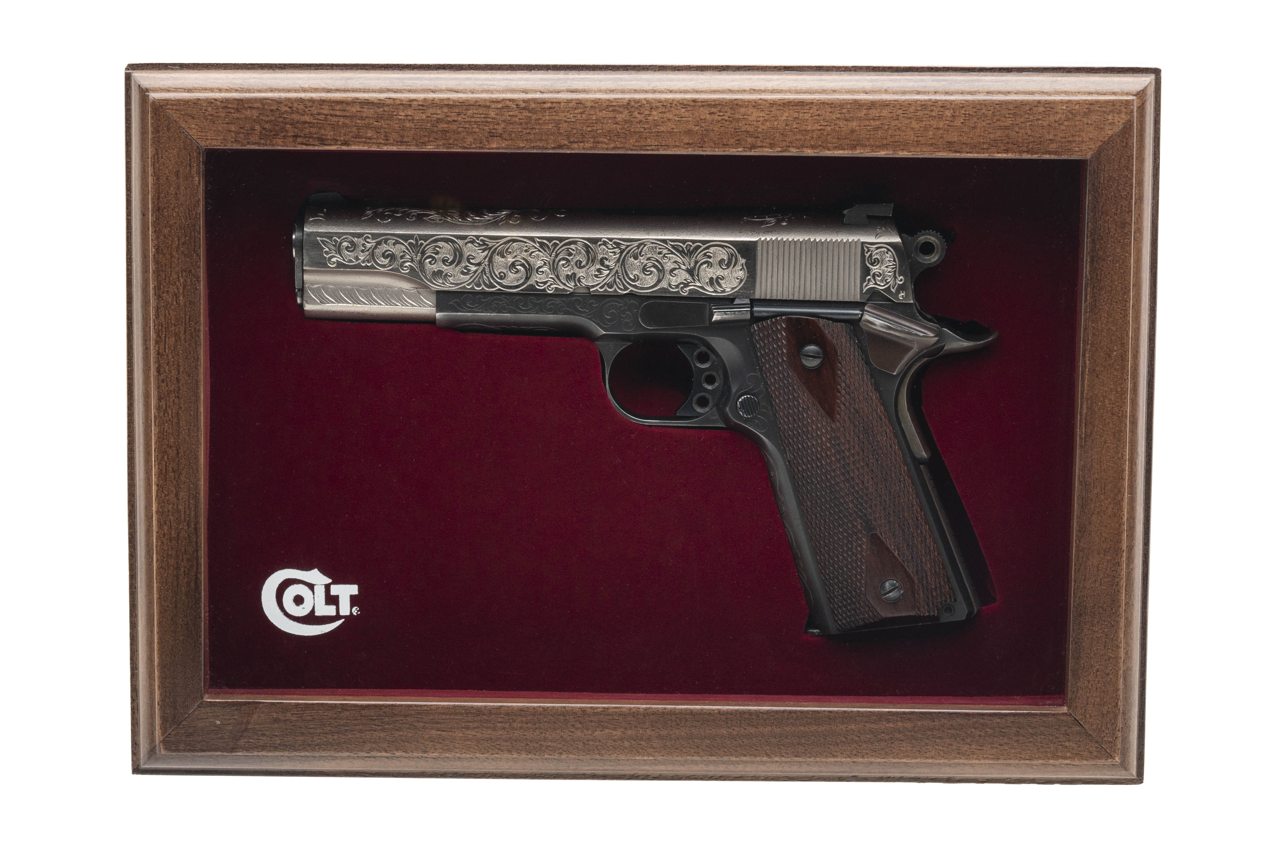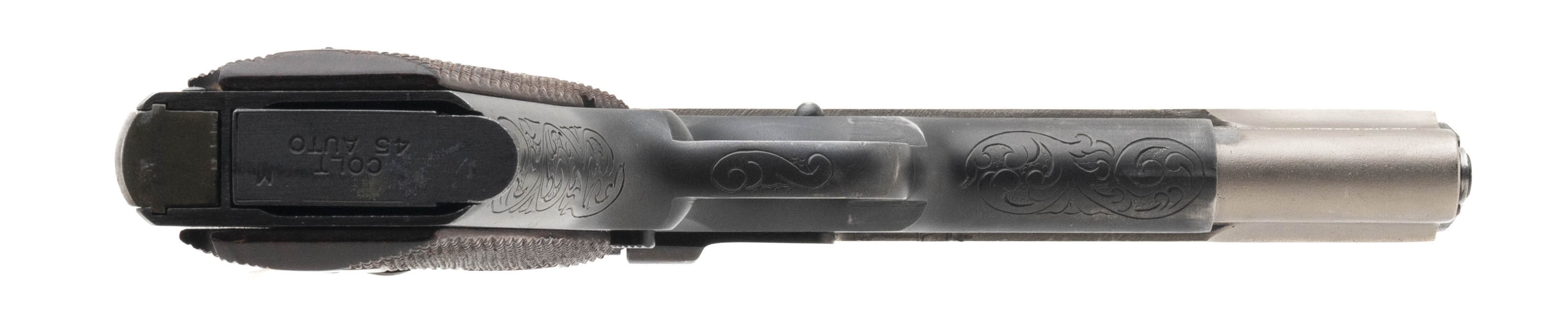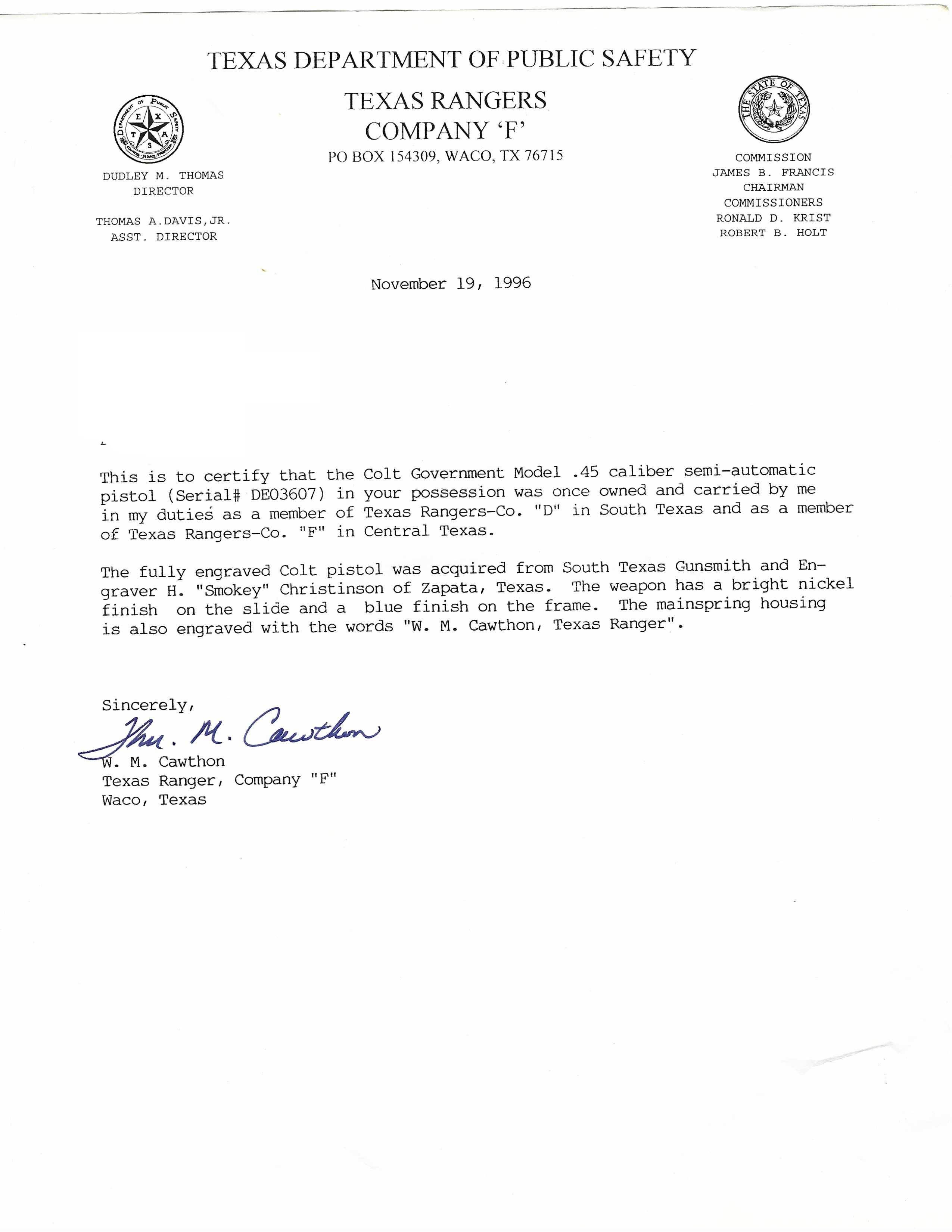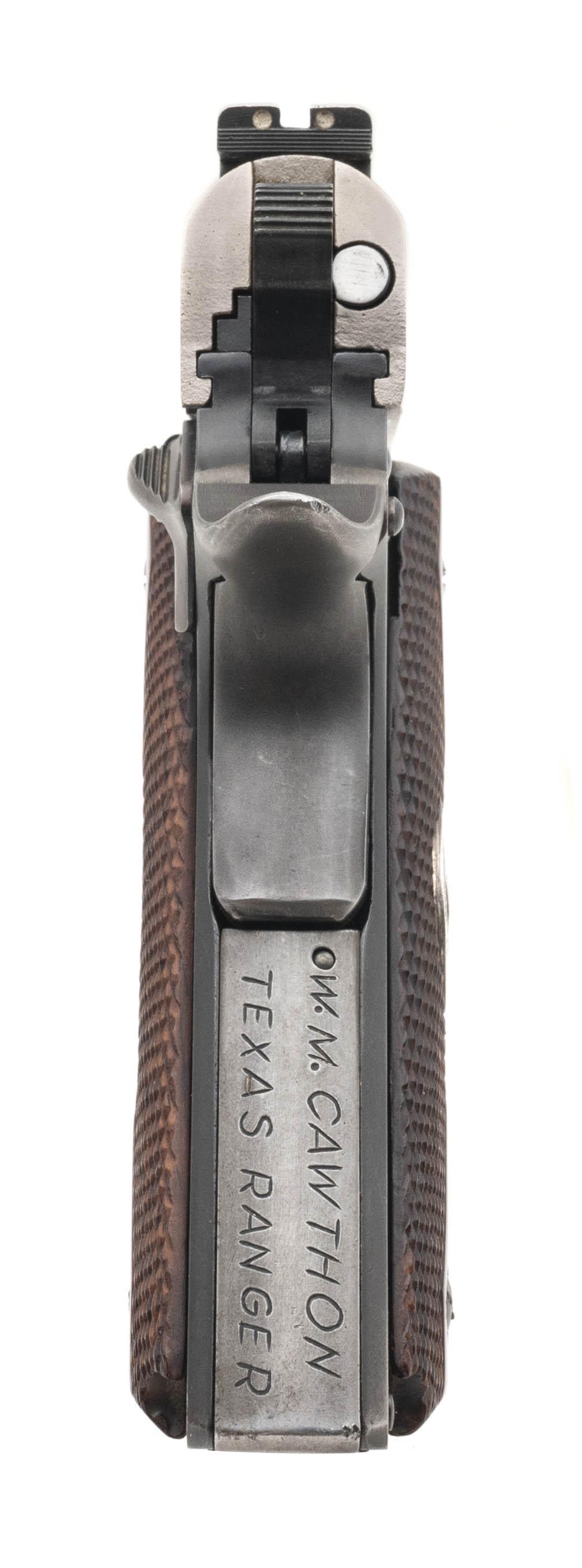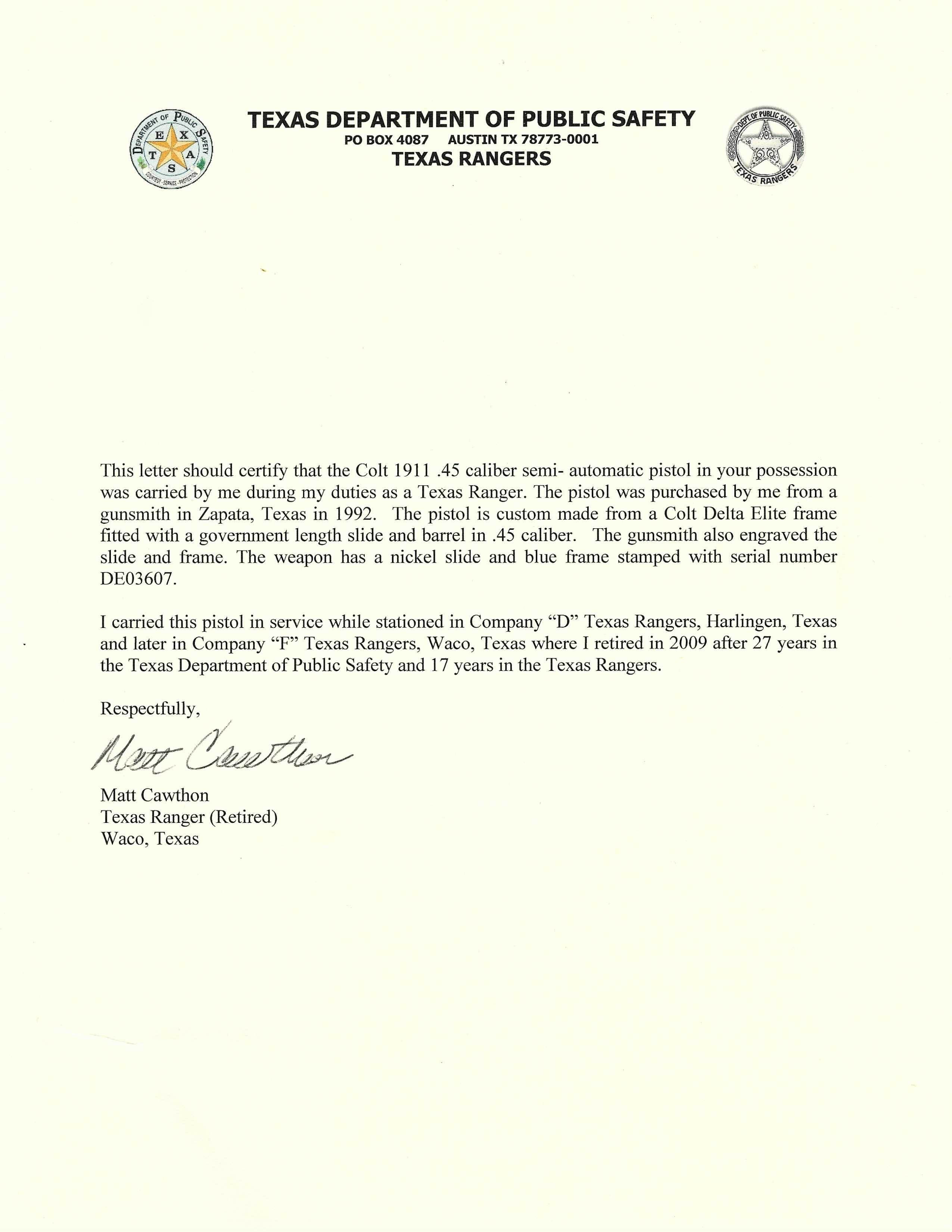 SN: DE03607. Made in 1987, .45 ACP with a 5" barrel. Documented custom built and engraved Colt 1911 pistol owned by retired Texas Ranger Matt Cawthon. The gun has a 2-tone finish and is custom engraved. The mainspring housing is inscribed "W.M. CAWTHON / TEXAS RANGER". The wooden grips have a Texas Ranger emblem inlaid into them. The gun comes with letters from Ranger Cawthon detailing the history of the gun and it's use by him. A neat and historical piece.