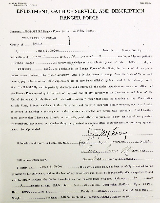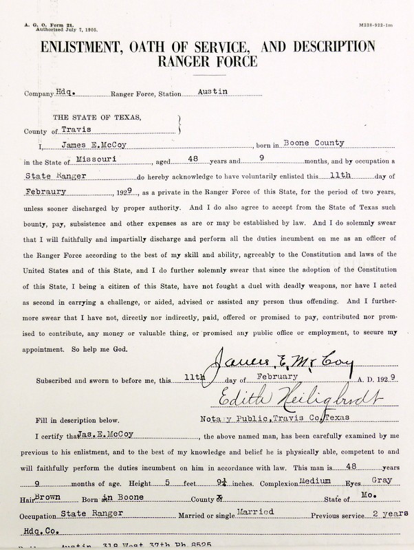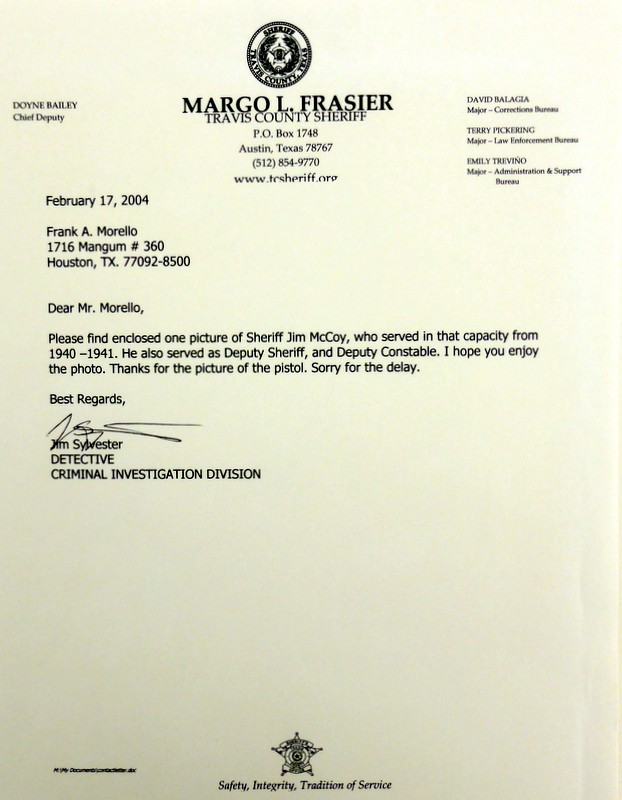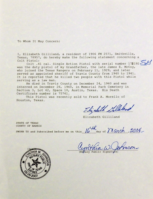 Texas Ranger Owned Colt Single Action revolver. Texas Ranger single action belonging to Ranger James E. Mc Coy and later Sheriff James E. Mc Coy of Travis County. Gun was shipped to Walter Tips in Austin Texas in 1897 and has factory letter (Walter Tips was a prominent Colt dealer in Austin and supplied revolver to many Texas Rangers). Gun comes with impeccable provenance including a letter from Mc Coys granddaughter attesting to the authenticity of gun and mentioning in the letter that Ranger Mc Coy killed two men with his revolver in his service as a lawman. Included are many documents such as Mc Coys State of Texas warrant of authority issued to every Ranger giving them the ultimate authority over other law enforcement officers, also document of enlistment, oath of service and physical description. Copies of pages from his book Trails and Trials of a Texas Ranger the legendary Ranger Adjutant General W.W. Sterling writes of Mc Coy, “Ranger Jim Mc Coy, one of the Best men in the service” Included are several photos of one of General Sterling, with Frank Hammer who orchestrated and killed Bonnie and Clyde, and a photo of captain John Hughes known as the “Border Boss” because of his exploits along the Mexican border. Also included are documents detailing McCoys time as Sherriff of Travis County and of his earlier time as Deputy Sherriff and Deputy Constable and photos of him in later years. This Is a fine compilation of documentation seldom found with historic Texas Ranger Revolvers.
