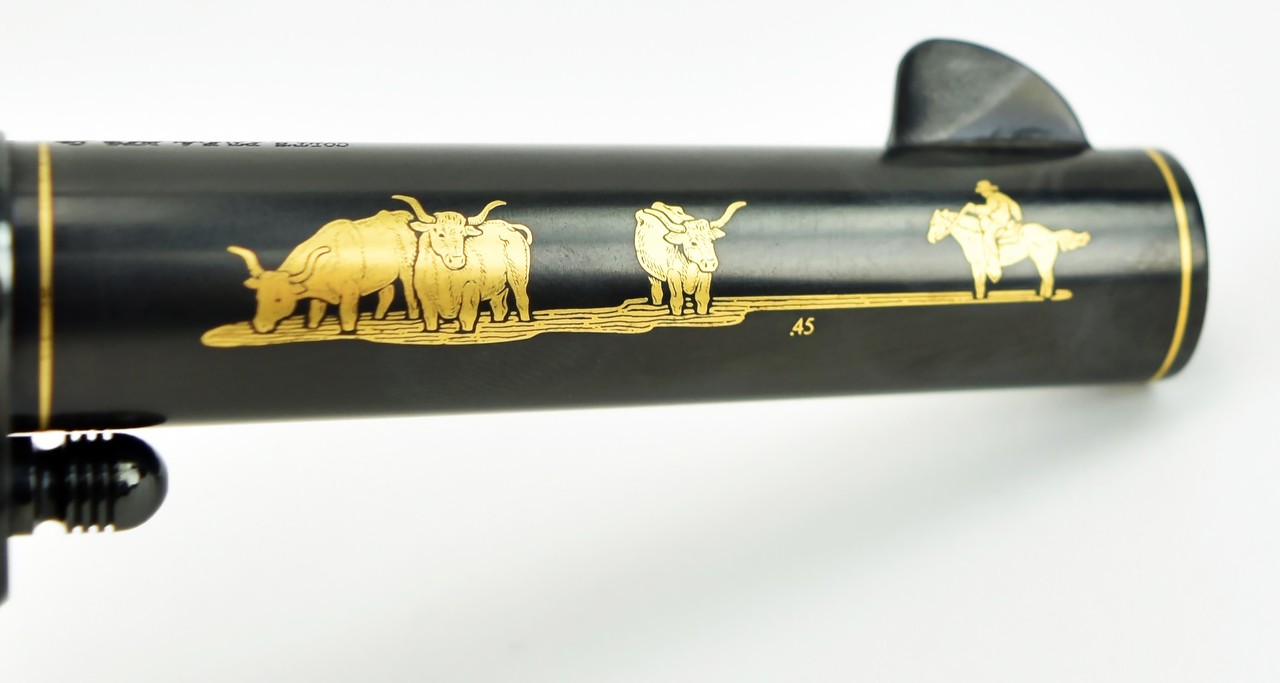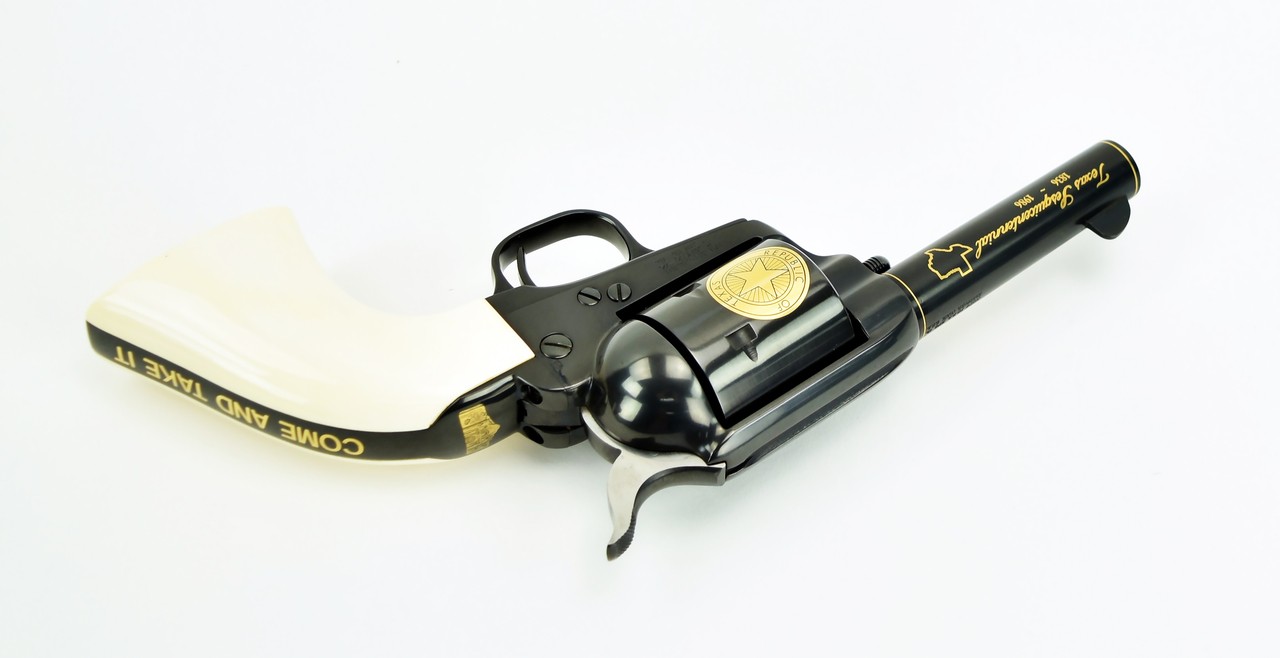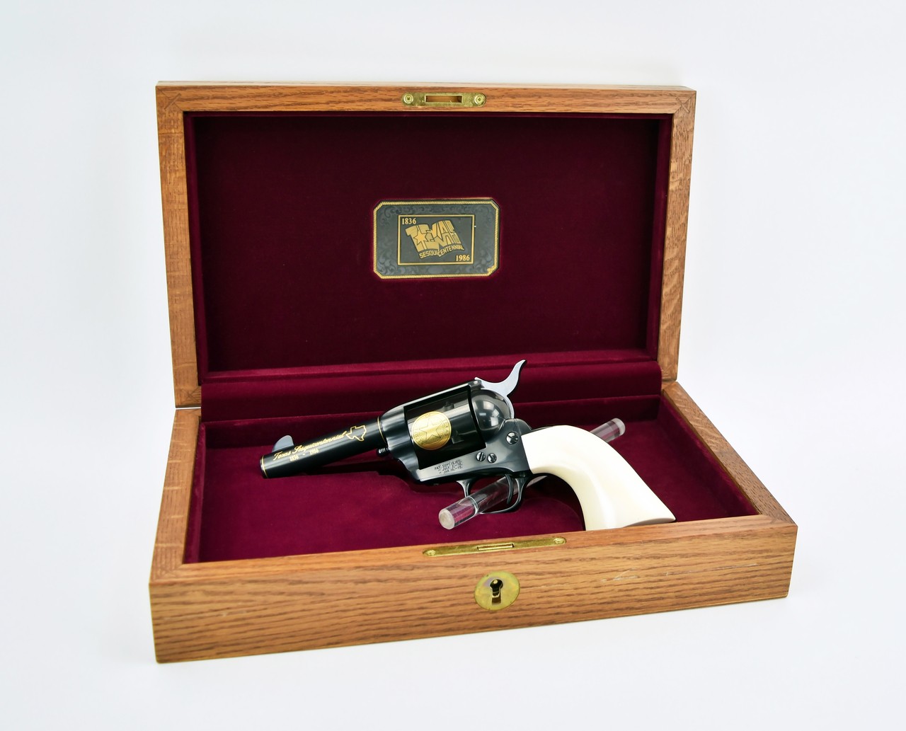 Colt Single Action Texas Sesquicentennial Commemorative Sheriff’s model. Has all blue finish with gold inlay. Beautiful grips. Only 1000 made in 1985, this one is number 111 with wooden presentation case.