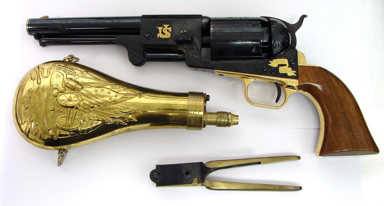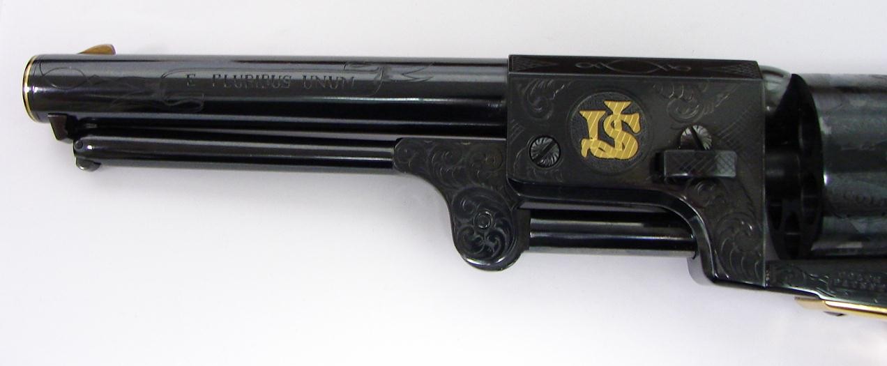 The North Limited Edition Colt 3rd Model American Historical Foundation Dragoon. Beautifully engraved and gold inlaid with high luster blue finish. A beautiful set in presentation case with accessories.