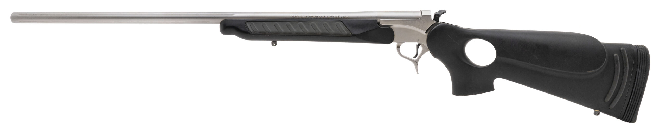 SN: PS54808. Modern production .243 Win with a 28" barrel. Stainless steel single shot rifle with fluted barrel and synthetic stock. Shows hunting use and wear, overall very good condition.