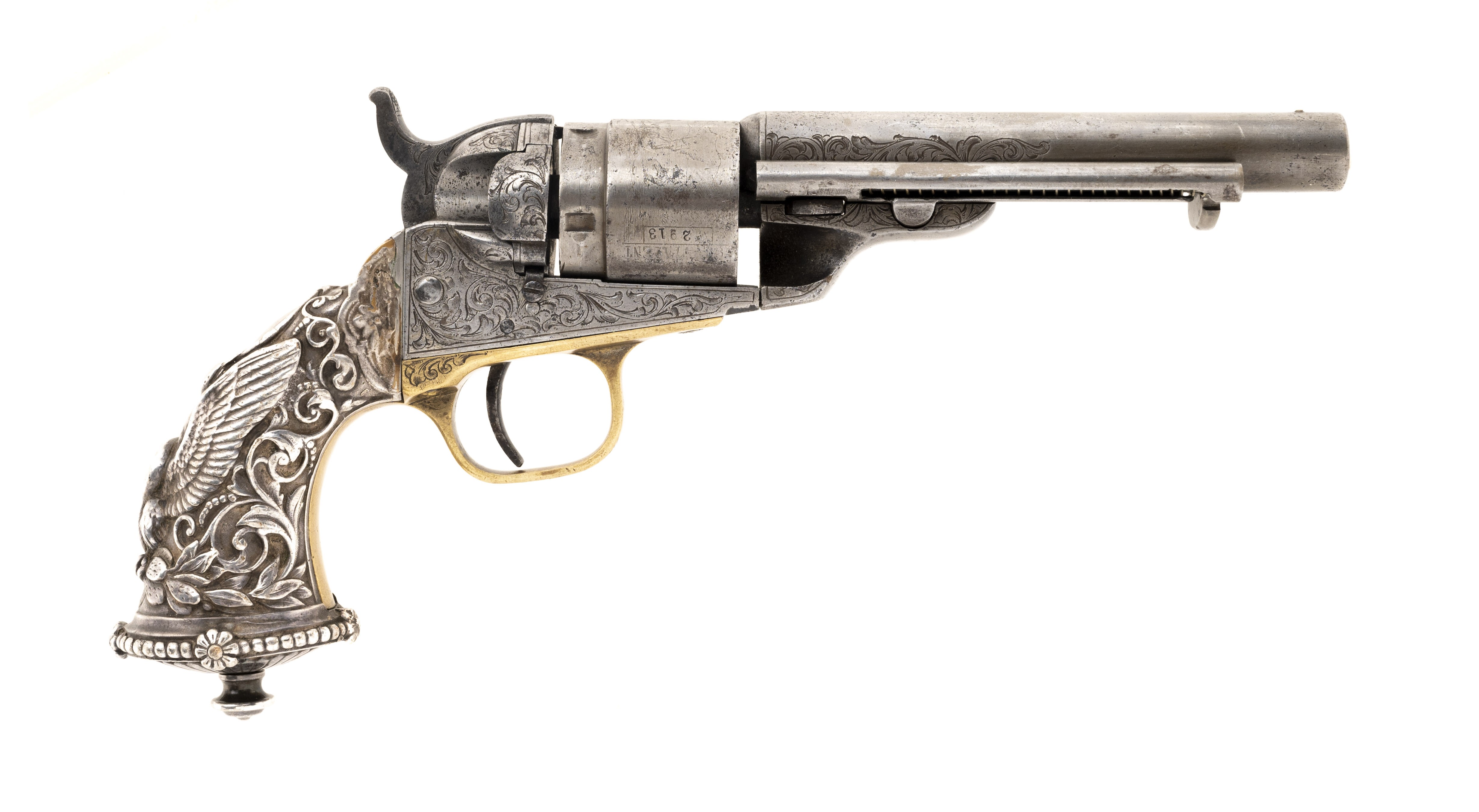 Serial Number 12913. Made in 1870s. New York style engraved gun with very fine Tiffany Style Grips. The metal has been cleaned, but remains sharp. Numbers all match. Grips are excellent, but are not original tiffany grips. Action works well. Gun comes in an old case that has been relined.