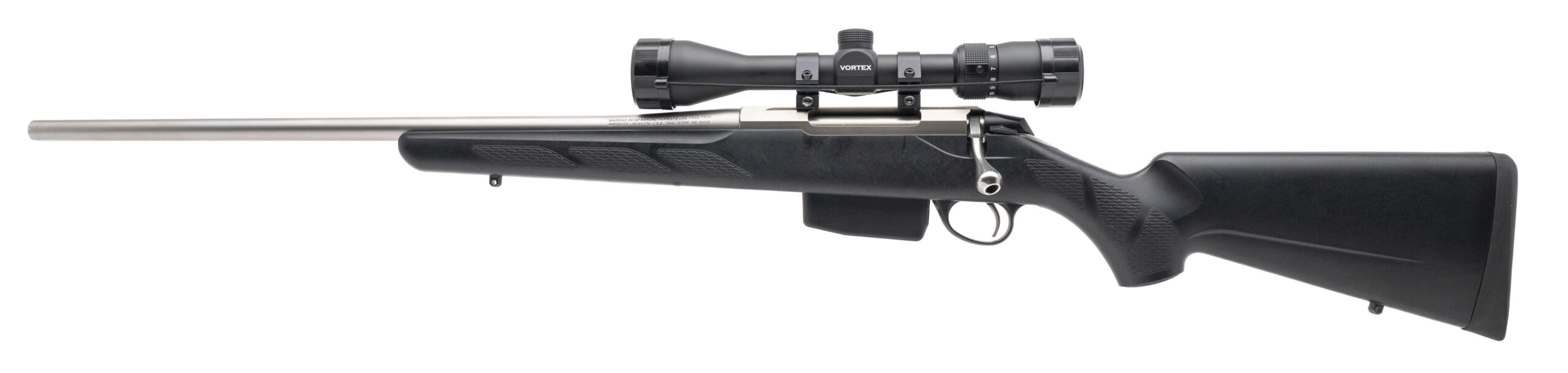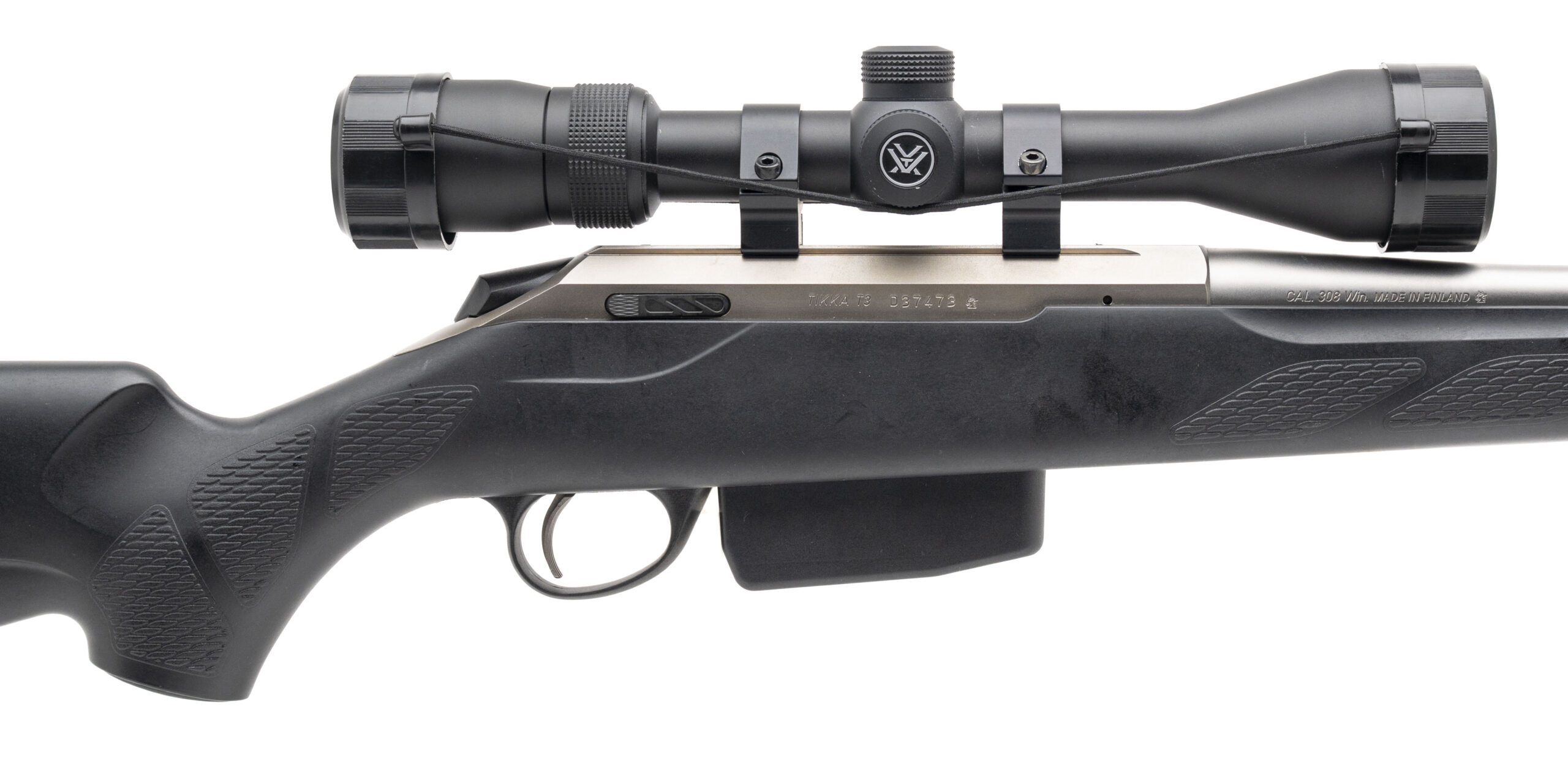 SN: D37473. Modern production, .308 WIN. with a 22" barrel. Bore is excellent. Finnish made left-handed bolt-action rifle with a Vortex Diamondback 4-12X40 scope, stainless steel finish, and black synthetic stock. Overall condition is excellent.