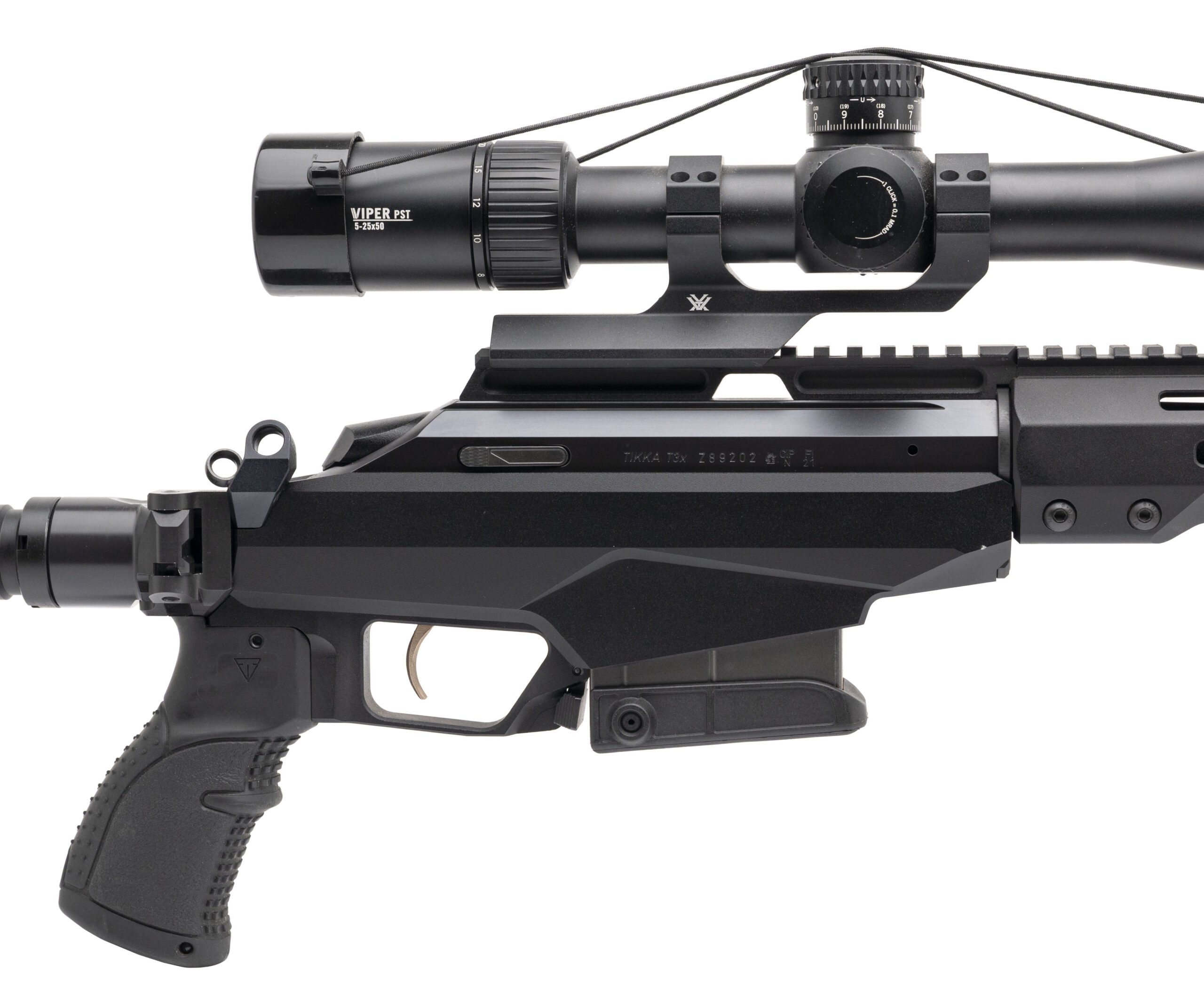 SN: Z89202. Modern production, .308 with an 24" barrel w/SF muzzle brake. Bore is bright with strong rifling. Left hand bolt action tactical rifle with a Vortex Viper PST 5-25x50mm scope, Harris 1A2 Ultralight bipod, and a side-folding stock. Overall condition is excellent.