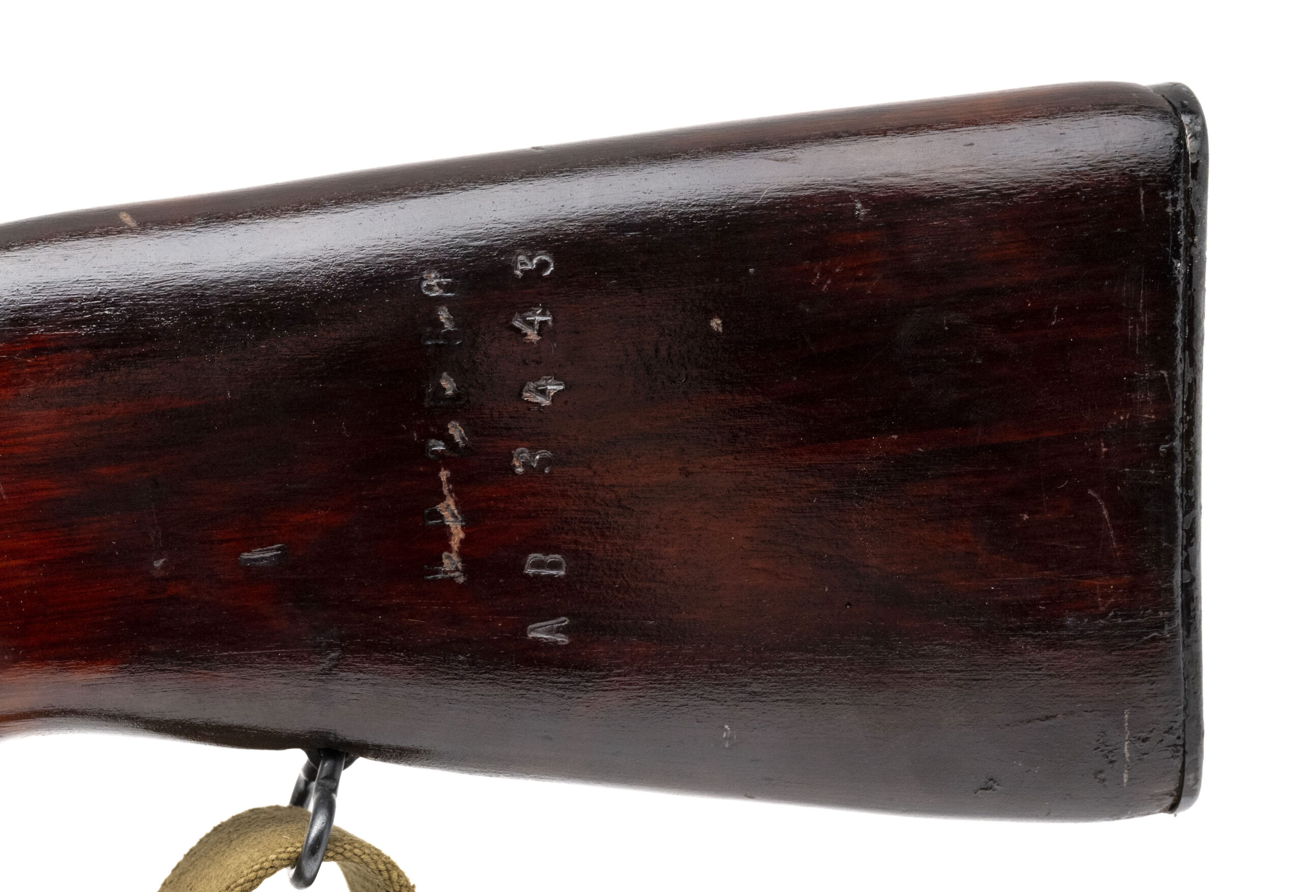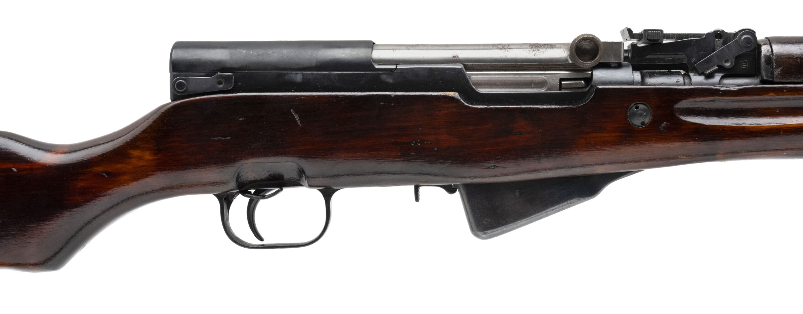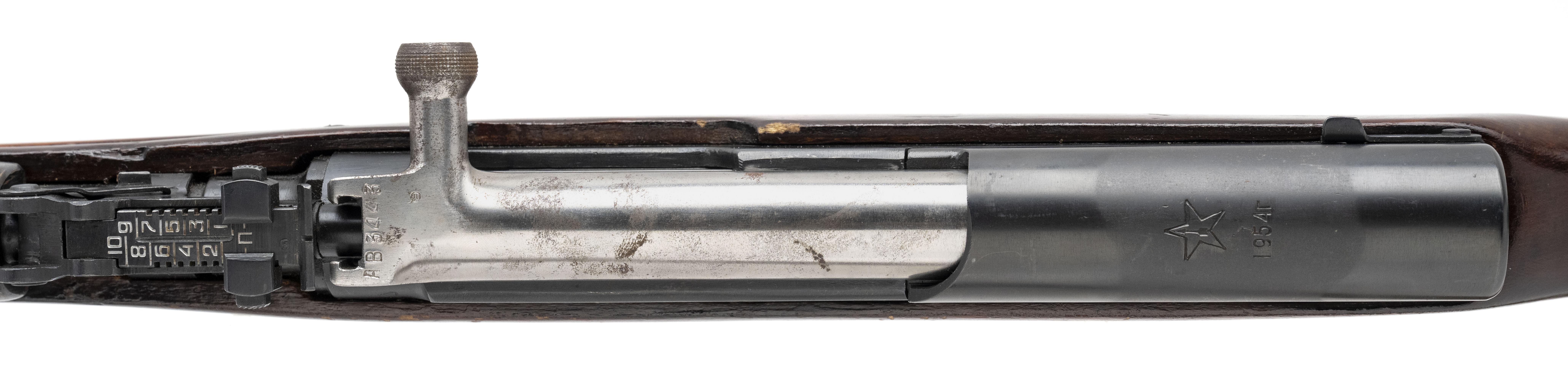 SN: RH227065 (importer; original AB3443). Semi-automatic rifle made by Tula Arsenal in 1954. 20½" barrel chambered for 7.62x39mm. Very good condition for a rifle of the era with indicators of a factory rebuild. Bolt and trigger guard match receiver, while stock and magazine are force-matched. Gas tube has receiver serial in electropencil, suggesting it is also a refit part. Wood stock has a few larger handling marks and a large scratch on the left from the trigger guard to the bayonet relief. Comes with canvas and metal sling dated 1969.