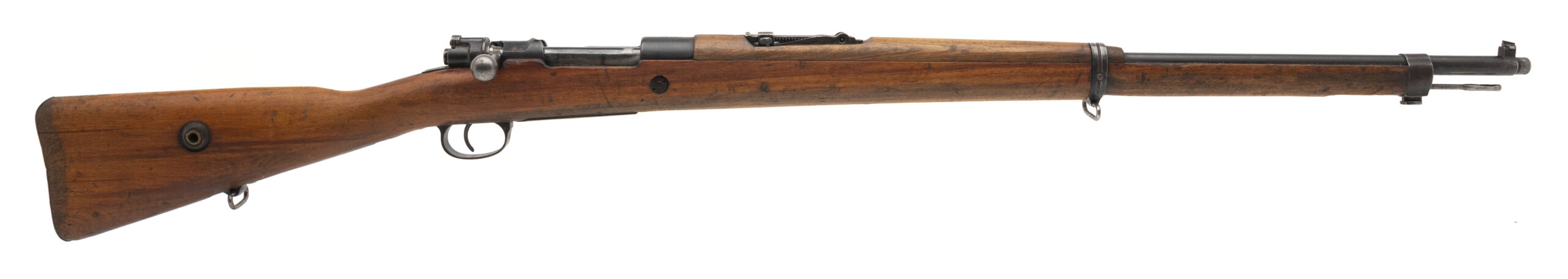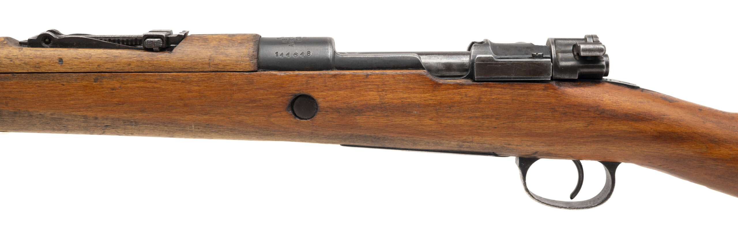 Serial No. 144648, manufactured in 1945, chambered in 8mm Mauser with a 29½" round barrel. The rifle remains in overall very good condition, showing light handling wear consistent with service use. Metal surfaces have aged to a uniform dull grey patina. Serial numbers are non-matching. The stock has been lightly sanded and remains solid, with only minor handling impressions noted. Action is smooth and functions correctly. A clean, representative example of a late-production Turkish Model 1938 rifle.