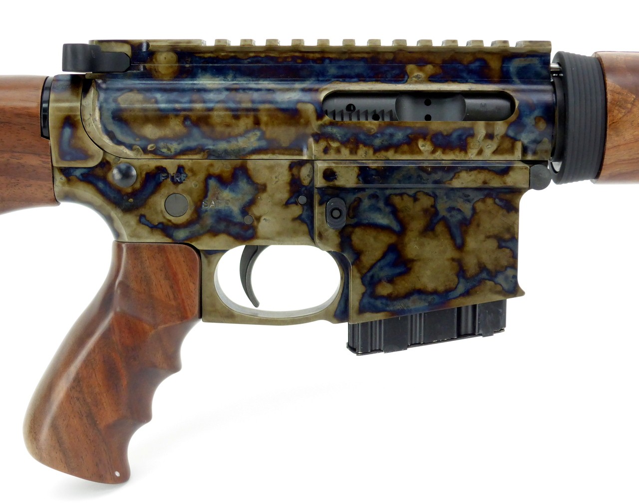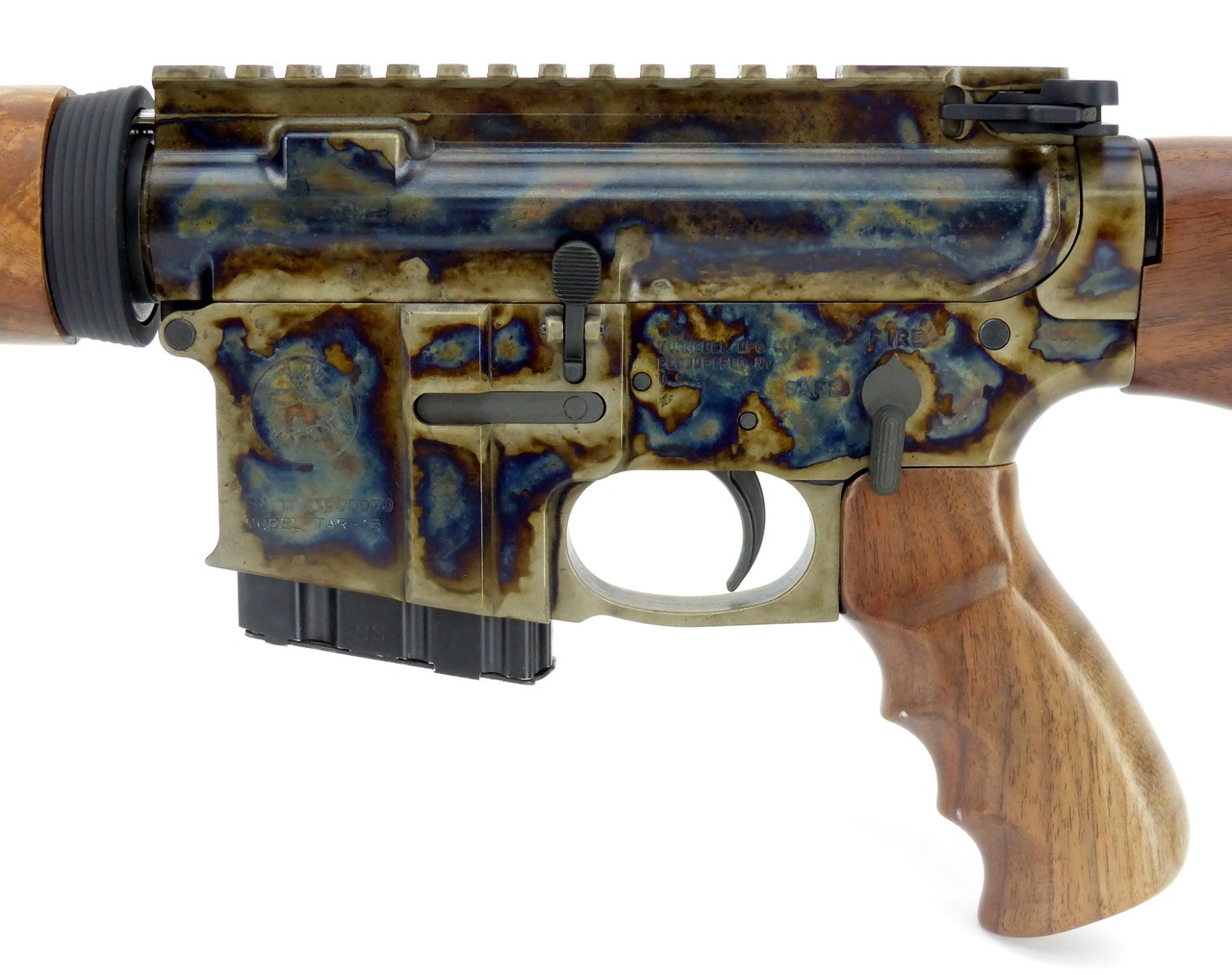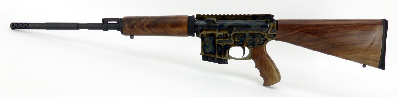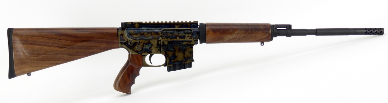 Turnbull TAR-15 .223 Rem caliber rifle. Standard 16” barrel carbine gas system American black walnut wood furniture color case hardened receiver. Chrome-lined barrel. Steel muzzle break. Comes with 2 five-round magazines. New
