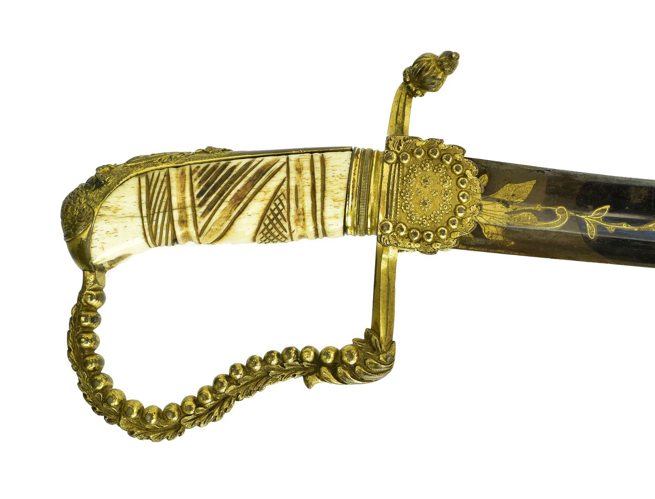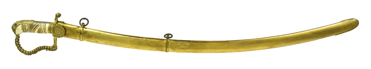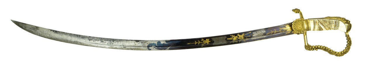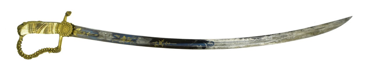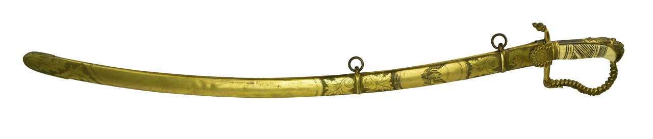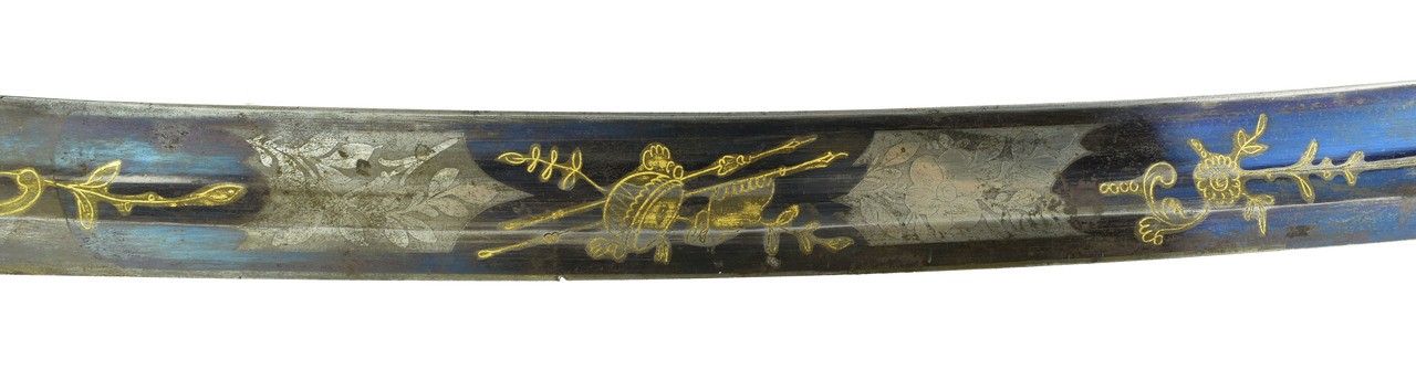 U.S. Cavalry Officers Saber. Circa 1820-1840. Scabbard is marked Gen. Owen (we are not sure who he is). Blade is approximately 29” with fire blue finish, floral motifs, and panopolys of arms. Pommel has an eagle holding a shield. Ivory grip. Quillion is fancy. Langets have oak leaves and acorns with decorations in center. Scabbard has floral motifs with a Federal eagle. A handsome Saber!