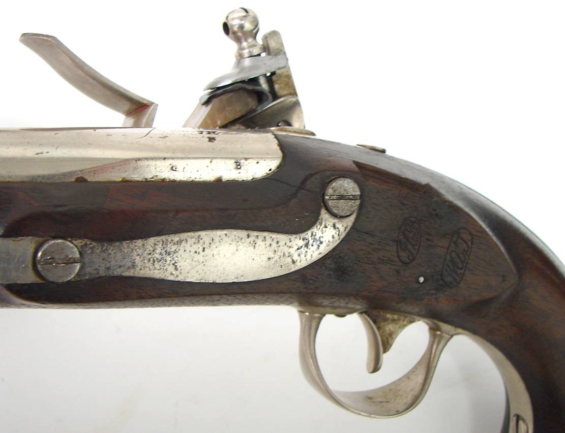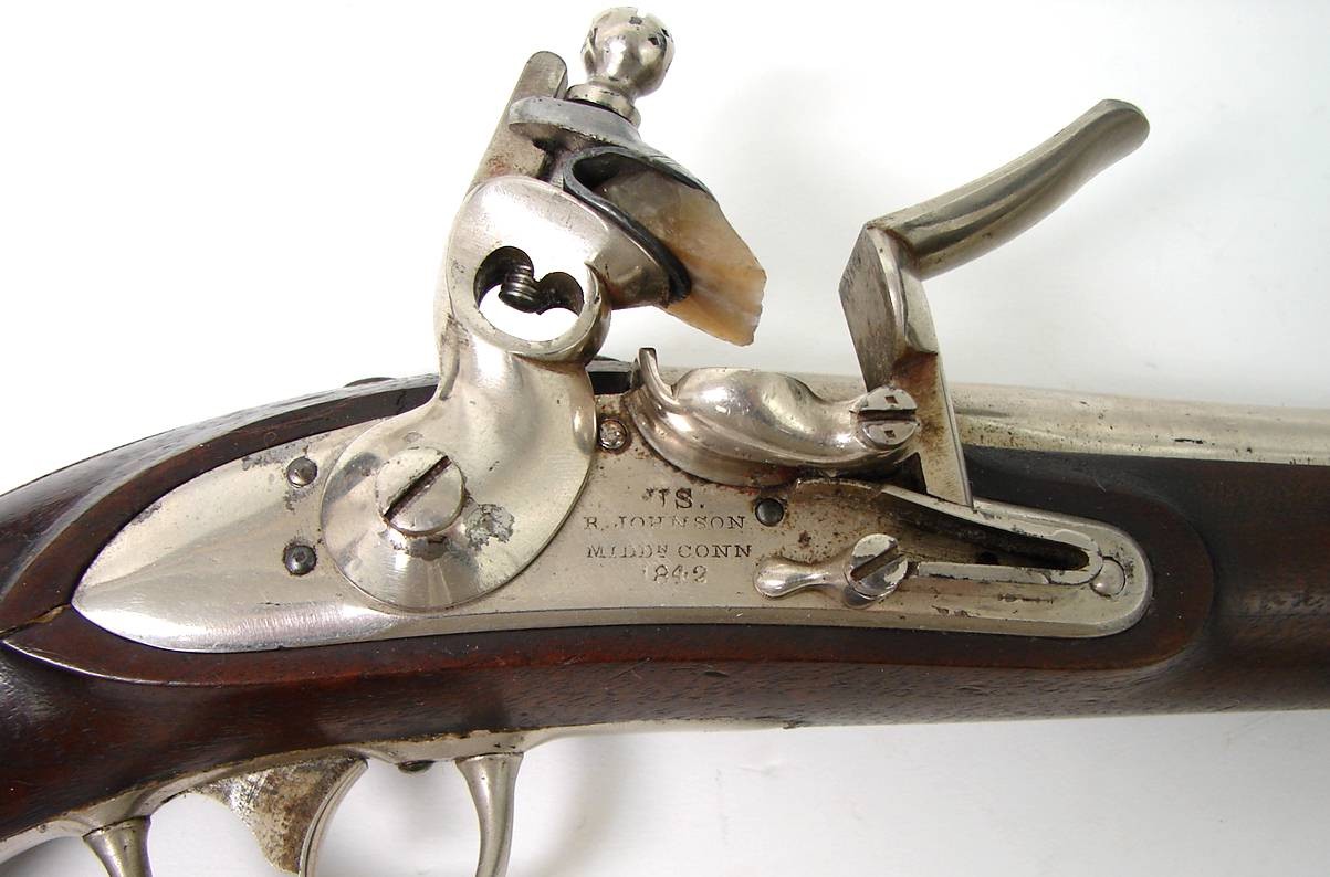 U.S. Model 1836 flintlock by Johnson dated 1842. Excellent stock with crisp cartouches. Stock has a small chip out near the cartouches. Overall about excellent.