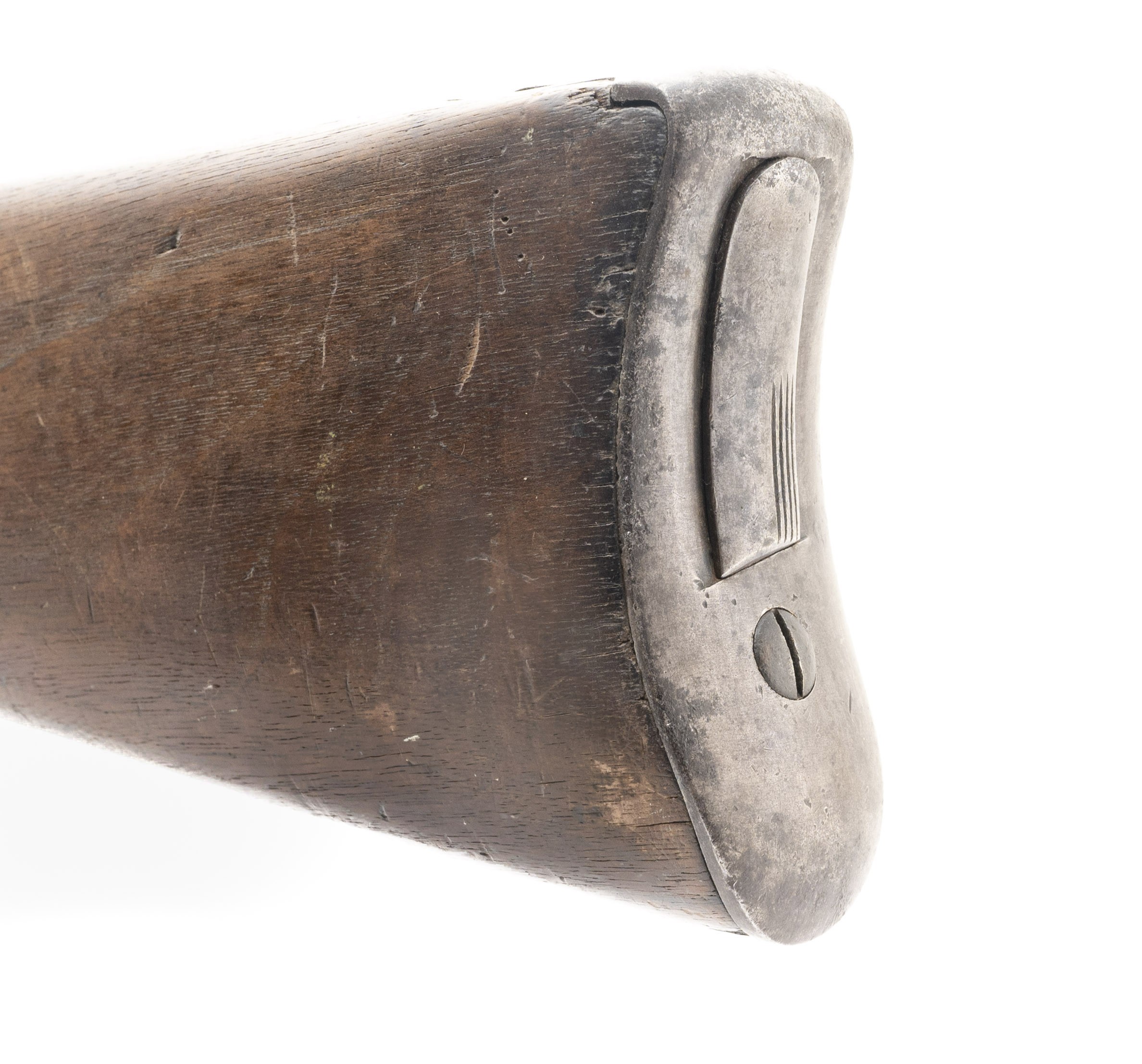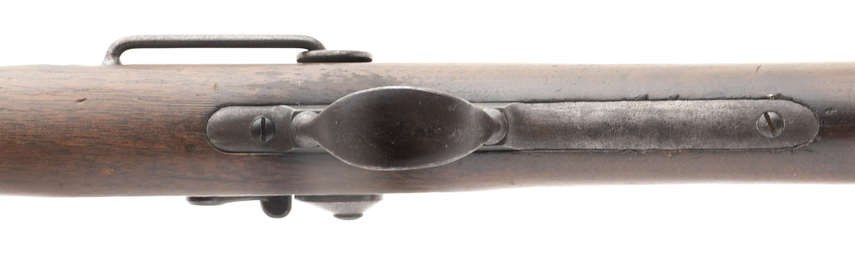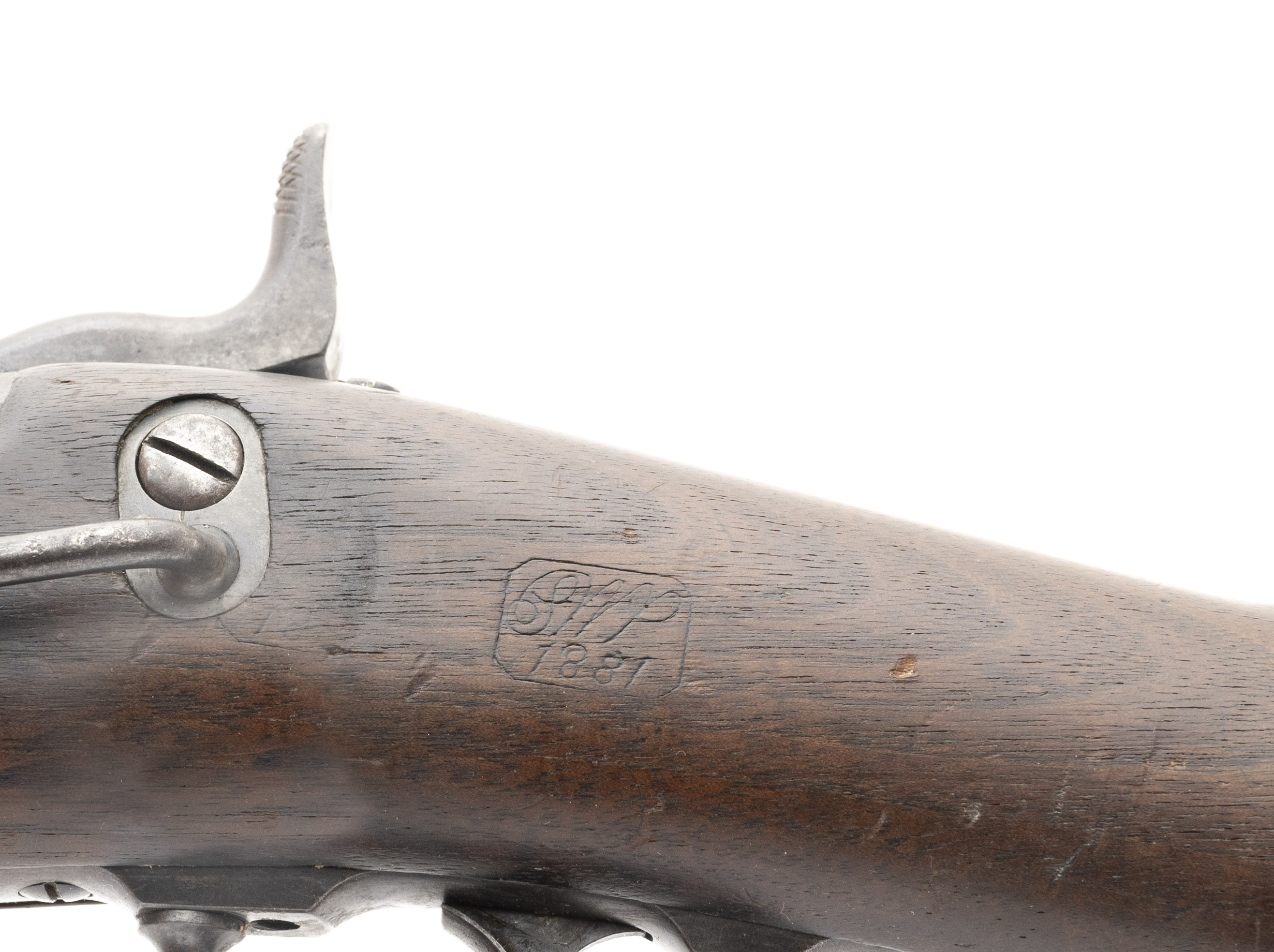 The 45 Government (45-70) centerfire caliber Model 1879 trapdoor carbine was used during the Indian Wars. The 22" round barrel on this gun has a good bore with good rifling with firing erosion toward the muzzle. The barrel has a smooth brown patina. The breechblock is marked U.S. over MODEL over 1873. The case colors have turned a smooth blue-brown. The lock has the eagle with U,S. over SPRINGFIELD over 1873. The lock, hammer, butt plate, and trigger guard have a smooth brown patina. It is equipped with the correct Model 1879 buckhorn carbine sight and the sling bar and ring. The stock is very good with a small chip at the forward sling bar attachment, no other cracks or chips, moderate issue dents and dings, a good firing proof at the rear trigger guard tang, and a strong SWP over 1881 final inspection cartouche on the left wrist. It still retains the correct three piece cleaning rod set and early headless shell extractor in the butt trap, a $200 value. The action functions correctly. This carbine is a nice example of a gun that was undoubtedly used during the Indian Wars. They are fairly hard to find in unaltered condition as most were updated with later sights and bands. With its nice cartouche, early lock markings, correct sight, and rods, this is a very desirable carbine.