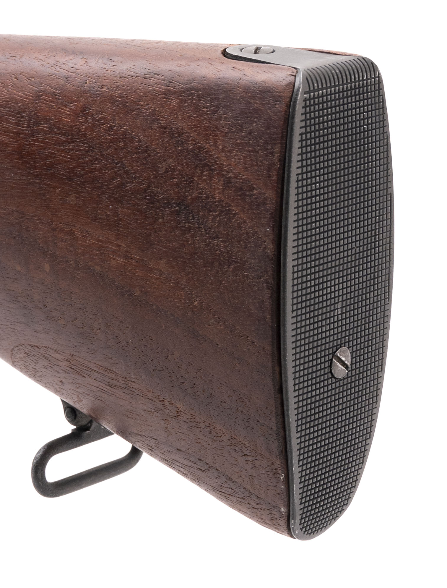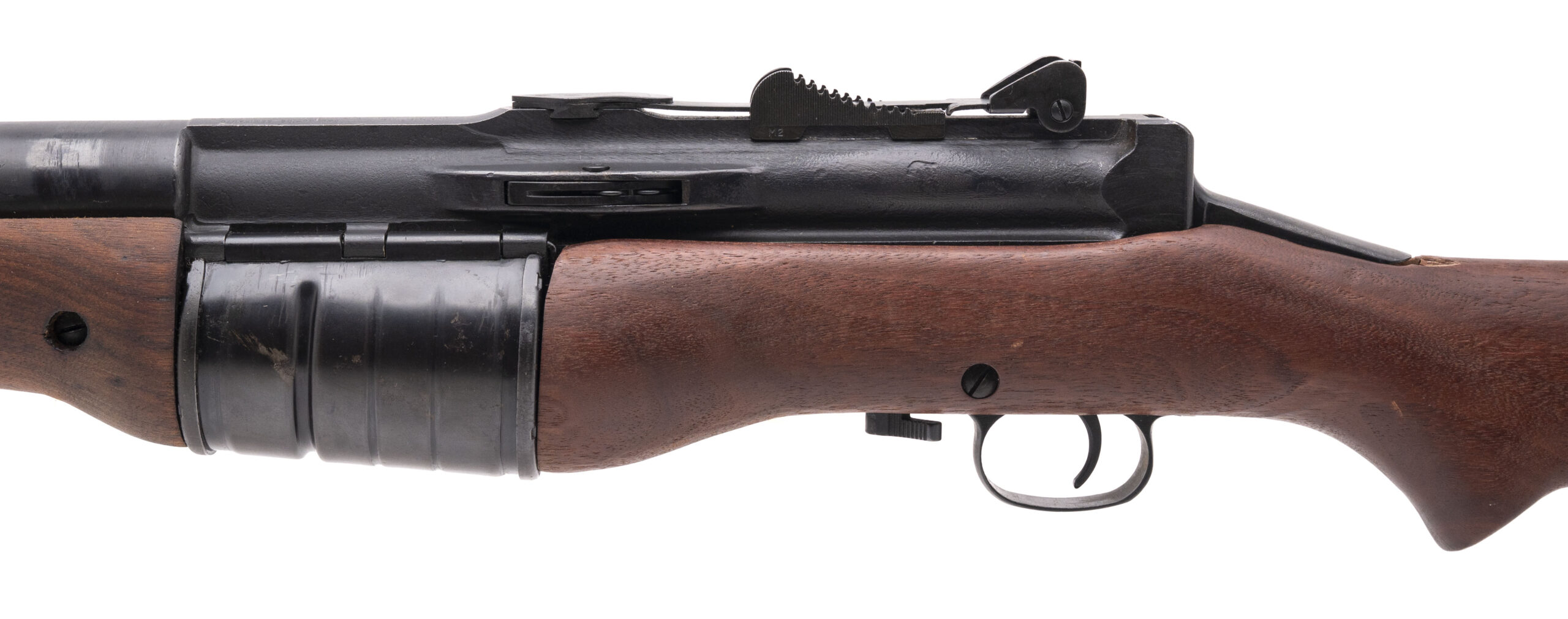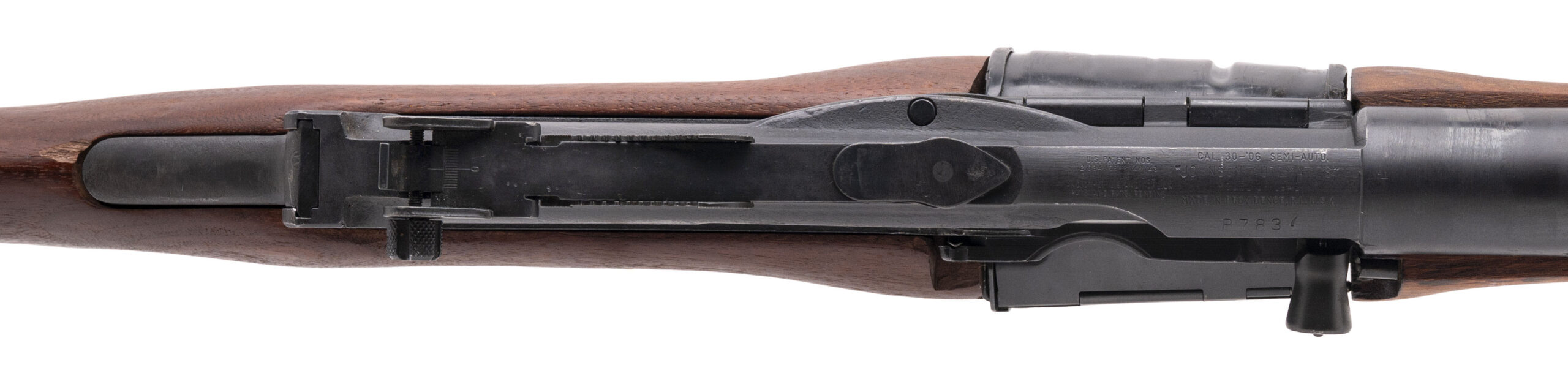 Serial No. B7837. Made by Cranston Arms in 1941 with a 22-inch barrel chambered for the .30-06 cartridge. Bore is bright with strong rifling & there is a sharp crown at the muzzle. Overall condition of the metallic parts is excellent & the action functions as it should, but the buttstock is a new-made/reproduction while the forward handguard is original wood. This rifle was made for the Netherlands Purchasing Commission, so the rear sight assembly is graduated in meters. Since this is a military contract rifle, it is equipped with the bayonet lug for the proprietary Johnson Rifle spike bayonet.